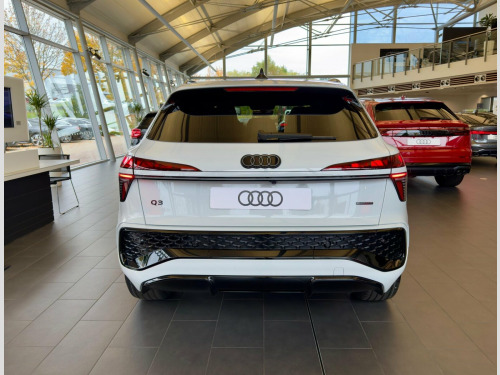 • Striking Audi design and dynamic handling Microfibre with Rhombus Pattern - S Emblem - Black with Red Stitching, Sound & Vision Pro, 19in Alloy Wheels - 8.5J 5-Twin-Spoke Peak Design - Gloss Turned Finish in Metallic Black, 3-Point Seat Belts in Front with Pretensioner and Electric Height Adjustment, 3-Zone Deluxe Automatic Air Conditioning, 4-Way Lumbar Support for Front Seats, Acoustic Glass for Front Door Windows, Airbags - Driver and Front Passenger with Passenger Airbag Deactivation, Ambient Lighting Package Pro, Anti Theft Wheel Bolts, Anti-Theft Alarm, Audi Application Store and Smartphone Interface, Audi Connect Emergency Call and Service with Audi Connect Remote and Control, Audi Connect Navigation and Infotainment (3 Year Subscription From New), Audi Drive Select, Audi Phone Box Light with Wireless Charging, Audi Q3 Lettering on the B-pillars, Audi Virtual Cockpit Plus, Auto-Dimming Rear-View Mirror, Black Styling Package, Camera-Based Traffic Sign Recognition, Cloth Headlining in Black, Convenience Key with Safelock, DAB Digital Radio, Digital Matrix LED Headlights with LED Rear Lights Pro, Digital OLED Rear Lights, Driver Attention and Fatigue Monitor with Driver Monitoring, ESC - Electronic Stabilisation Control, Electronically Operated Child Locks, First Aid Kit with Warning Triangle and High Visibility Vest, Front Cross-Traffic Assist, Front Door Sill with Aluminium Inserts - Illuminated with S Logo, Front Emergency Brake Assist, Front Head Restraints, Front and Rear Floor Mats, Front and Rear Side Airbags with Head Airbags and Front Interaction Airbag, Full Paint Finish, Function Package, Garage Door Opener, Headlight Cleaning System, Heated Front Seats, Hill Hold Assist and Downhill Assist, Hold Assist, I-Size Compliant Child Seat Mounting on Front Passenger Side and Outer Rear Seats - Top Tether for Outer Rear Seats, Inlay - American Whitewood Natural - Anthracite, Interior Elements in Dinamica Microfibre, Interior Trim in Aluminium Look, Loading Sill Protection in Stainless Steel, Main Beam Assist, Panoramic Curved Display with 12.8in MMI Navigation Plus and MMI Touch, Park Assist Plus with Parking System and 360 Display, Pedals in Stainless Steel, Privacy Glass - Dark-Tinted Rear Window - Rear Door and Side Window., Projection Light in the Exterior Mirrors, Q3 Badging on the Rear, Rear Bench Seat Plus, S Line Exterior Styling, Seat Belt Monitoring, Sound and Vision Pack Pro, Sport Steering Wheel - Heated Flat Top and Bottomed 3-Spoke Leather- Multi-function with Gear Shift Paddles and S Badging, Start-Stop System, Steering Wheel Operating Unit - Glossy Black, Storage Compartment in Front Centre Console, Storage Compartments, Swerve Assist and Turn Assist, Traffic-Sign-Based Speed Limiter, Tyre Pressure Loss Indicator, Tyre Repair Kit - Tool Kit and Jack, USB Ports with Charging Function, Windscreen with Acoustic Glass