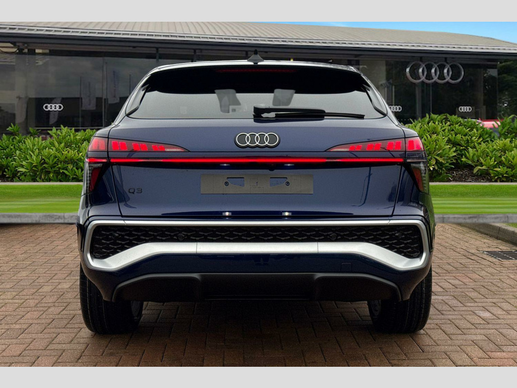 19in Alloy Wheels - 8.5J 5-Arm Design - Platinum Grey, 3-Zone Deluxe Automatic Air Conditioning, 4-Way Lumbar Support for Front Seats, Acoustic Glass for Front Door Windows, Adaptive Cruise Control, Airbags - Driver and Front Passenger with Passenger Airbag Deactivation, Aluminium Window Trims, Ambient Lighting Package Pro, Anti Theft Wheel Bolts, Anti-Theft Alarm, Audi Application Store and Smartphone Interface, Audi Connect Emergency Call and Service with Audi Connect Remote and Control, Audi Connect Navigation and Infotainment (3 Year Subscription From New), Audi Drive Select, Audi Phone Box Light with Wireless Charging, Audi Q3 Sportback Lettering on the B-pillars, Audi Sound System, Audi Virtual Cockpit Plus, Auto-Dimming Rear-View Mirror, Body Coloured Door Mirrors, Camera-Based Traffic Sign Recognition, Cloth Headlining in Black, Comfort Suspension, Convenience Key with Safelock, DAB Digital Radio, Driver Attention and Fatigue Monitor with Driver Monitoring, ESC - Electronic Stabilisation Control, Electronically Operated Child Locks, Exterior Mirrors - Electrically Adjustable - Heated - Folding and Automatically Dimming, First Aid Kit with Warning Triangle and High Visibility Vest, Front Cross-Traffic Assist, Front Door Sill with Aluminium Inserts - Illuminated with S Logo, Front Emergency Brake Assist, Front Head Restraints, Front Side Airbags with Head Airbags and Front Interaction Airbag, Front and Rear Floor Mats, Full Paint Finish, Heated Front Seats, Hill Hold Assist, Hold Assist, I-Size Compliant Child Seat Mounting on Front Passenger Side and Outer Rear Seats - Top Tether for Outer Rear Seats, Inlay - Aluminium Divergence - Dark, Interior Elements in Dinamica Microfibre and Artificial Leather, Interior Trim in Aluminium Look, LED Headlights Plus with LED Rear Lights Pro, Lane Departure Warning with Emergency Assist, Loading Sill Protection in Stainless Steel, Luggage Compartment Lid - Electrically Opening and Closing, Main Beam Assist, Manually Adjustable Front Seats, Panoramic Curved Display with 12.8in MMI Navigation Plus and MMI Touch, Park Assist Plus with Parking System and 360 Display, Pedals in Stainless Steel, Privacy Glass - Dark-Tinted Rear Window - Rear Door and Side Window., Progressive Steering, Projection Light in the Exterior Mirrors, Q3 Badging on the Rear, Rear Bench Seat Plus, Reversing Camera, S Line Exterior Styling, Seat Belt Monitoring, Sport Steering Wheel - Flat Top and Bottom 3-Spoke Leather Multi-Function with Gear-Shift Paddles and S Badging, Start-Stop System, Steering Wheel Operating Unit - Glossy Black, Storage Compartment in Front Centre Console, Storage Compartments, Swerve Assist and Turn Assist, Three-Point Automatic Belts with Belt Tensioner and Height Adjustment, Traffic-Sign-Based Speed Limiter, Tyre Pressure Loss Indicator, Tyre Repair Kit - Tool Kit and Jack, USB Ports with Charging Function, Windscreen with Acoustic Glass