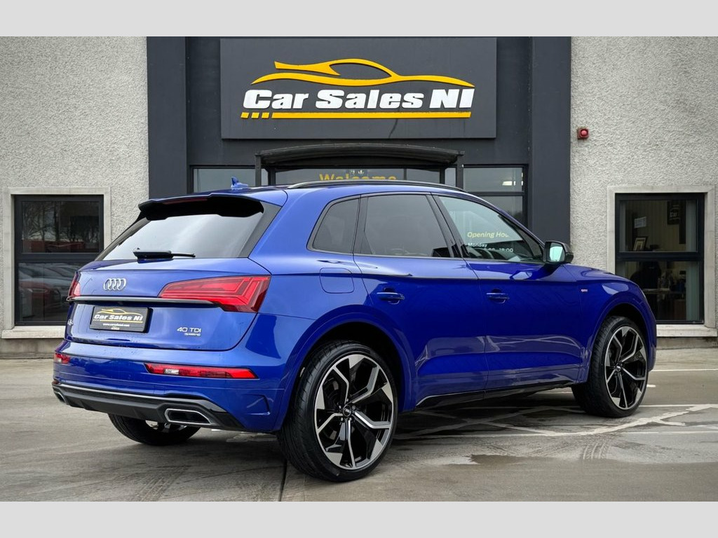 2022 AUDI Q5 S LINE QUATTRO 40 TDI 202 BHP 1 Owner from new, 2.0 Diesel Model, Covered 72k miles, Finished in Ultra Blue, Key Features include: 22'' Upgraded alloy wheels (£1,100 Optional extra) Rear Privacy glass Black Edition Styling Front and Rear Parking sensors Reversing camera Half Leather S Line Interior Leather Multifunctional steering wheel Paddle shift Heated front seats Dual Climate control Virtual cockpit DAB Radio / Bluetooth / Sat Nav Apple / Android Car Play AUDI Drive Mode Select Electronic Tailgate ISOFIX Child seat Points And so much more... Call today to arrange a test drive Tailored finance packages available to suit your needs Comprehensive warranty on all cars Trade ins welcome Delivery to North and South of Ireland if required 19in Alloy Wheels - 5-Twin-Spoke Star De, 2 USB Charging Ports -1 x USB-A and 1 x , 3-Spoke Multi-Function Leather Steering , 6-Airbag System, Air Vents - Inserts and Centre Console i, Aluminium Roof Rails, Anti Theft Locking Wheel Bolts, Anti-Theft Alarm, Audi Connect Navigation and Infotainment, Audi Connect Safety and Service, Audi Connect with Amazon Alexa Integrati, Audi Drive Select, Audi Pre-Sense City, Audi Virtual Cockpit Plus - 12.3in Scree, Audi Wireless Smartphone Interface, Auto Dimming and Frameless Rear View Mir, Automatic Headlight Adjustment, Automatic Headlight and Windscreen Wiper, Automatic Start-Stop with Coasting Funct, Bluetooth Interface, Body Coloured Door Mirrors, C