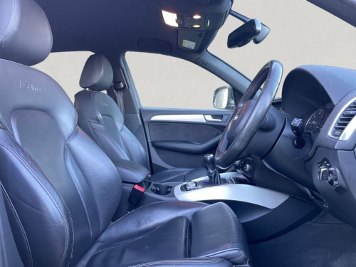 This stylish and powerful Audi Q5 S line Plus offers a superb balance of luxury, practicality, and performance. Powered by a 2.0 TDI diesel engine delivering 190 PS and equipped with Audi's renowned quattro all-wheel drive system, this Euro 6-compliant SUV is built to handle all road conditions with ease. Finished in S line Plus trim, it features striking 20" alloy wheels, S line exterior styling, privacy glass, and chrome detailing throughout for a bold and premium look. Inside, the cabin is refined and driver-focused, with Matt Brushed Aluminium inlays, leather-trimmed armrests, a flat-bottom S line multifunction steering wheel, and heated front sport seats with electric lumbar support. Technology highlights include the MMI Navigation Plus system, DAB digital radio, Audi Sound System, Bluetooth interface, and Audi Music Interface (AMI), ensuring seamless connectivity and entertainment. Comfort is enhanced with Deluxe 3-zone climate control, cruise control, and a power-operated tailgate for added convenience. Safety and driver assistance features include Audi Parking System Plus, Xenon headlights, LED rear lights, hill descent control, tyre pressure loss indicator, traction control, and a full suite of airbags. The vehicle also benefits from ISOFIX child seat mounting points, making it a great family SUV. Practical touches such as split-folding rear seats, roof rails with a storage bag, electromechanical parking brake, and a generous luggage area ensure everyd 20in Alloy Wheels - 5-Segment-Spoke Desi, ABS - Anti-Lock Braking System, AMI - Audi Music Interface, Airbags - Driver, Airbags - Front Passenger, Airbags - Front Side, Alarm - Thatcham Category 1, Aluminium Roof Rails, Aluminium Window Trims, Audi Concert Radio, Audi Parking System Plus, Audi Sound System, Auto-Dimming Rear-View Mirror, Bluetooth Interface, Body Coloured Bumpers, Chrome Door Handles and Tailgate Strip, Chrome-trimmed - Flat-bottom Design Exha, Cloth Headlining in Black, Colour Drivers Information System - DIS, Cruise Control, DAB Digital Radio, Deluxe 3-Zone Climate Control, Diffuser - Platinum Grey, Door Mirrors - Electrically Adjustable a, ESP - Electronic Stability Progr