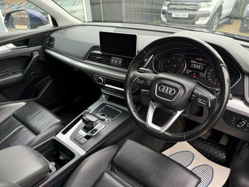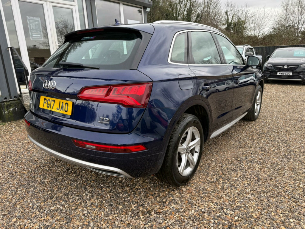 This 2017 Audi Q5 TDI Sport offers an impressive 57 miles per gallon, making it a highly economical choice. This Four Wheel Drive model is equipped with a 2.0 litre diesel engine and meets Euro 6 emission standards. Notable features include Xenon headlights with LED daytime running lights, heated front seats for added comfort, and a Bluetooth interface for seamless connectivity. The Deluxe 3-Zone Climate Control ensures a pleasant cabin temperature for all occupants, while the Light and Rain Sensor automatically adjusts headlights and wipers. With a generous boot space, this Q5 is as practical as it is refined.The Audi Q5 TDI Sport excels in performance and efficiency. Its acceleration from 0 to 62 miles per hour in just 7.9 seconds demonstrates its responsive power. The low CO2 emissions highlight its environmental consideration compared to other vehicles in its class. Furthermore, its substantial towing weight of 2400 kg makes it a capable companion for a variety of needs, offering a blend of performance, practicality, and efficiency that sets it apart.. 18in Alloy Wheels - 5-Arm Star Design, 2 x SDXC Card Readers, 2 x USB Charging Ports and 1 x AUX-IN, 4-Way Electric Lumbar Support, 6-Airbag System, Air Inlets in Matt Titanium Black with Blades in Matt Aluminium Silver, Aluminium Roof Rails, Anti Theft Locking Wheel Bolts, Anti-Theft Alarm, Audi Connect Infotainment Services - 3 Month Trial, Audi Connect Safety and Service - e-call, Audi Drive Select, Audi Parking System Plus, Audi Pre-Sense City, Audi Smartphone Interface, Audi Sound System, Auto-Dimming Rear-View Mirror, Automatic Headlight Adjustment, Bluetooth Interface, Body Coloured Door Mirrors, CD Drive, Cloth Headlining, Colour Drivers Information System with 7in Display, Comfort Dynamic Suspension, Cruise Control with Speed Limiter, DAB Digital Radio, Deluxe 3-Zone Climate Control, Door Inserts in Matt Selenite Silver, Door Mirrors - Electrically Adjustable and Heated with Integrated LED Side Indicators, Door Sill Trims with Aluminium Inlays, ESC - Electronic Stabilisation Control inc ABS - ASR and EDL, Electric Windows - Front and Rear, Electromechanical Parking Brake, Electromechanical Power Steering, First Aid Kit and Warning Triangle, Front Centre Armrest, Front and Rear Floor Mats, Heated Front Seats, High Multi-Function 3-Spoke Leather Steering Wheel with Gear-Shift Paddles, High-Gloss Package, ISOFIX Child Seat Mounting and Top Tether, Inlays - Aluminium Rhombus, Keyless Go, LED Interior Lighting Pack, LED Rear Lights, Light and Rain Sensor, Luggage Compartment Cover, Luggage Compartment Mat, MMI Navigation - SD Card Based, MMI Radio Plus with 7in Colour MMI Screen and MMI Controller, Manual Seat Adjustment, Non-Smoking Package, Pop-Up Bonnet for Pedestrian Protection, Power Operated Tailgate, Radiator Grille in Twilight Grey with Horizontal Matt Aluminium Struts, Rear Diffuser - Body Colour, Rear Diffuser Strip in Selenite Silver, Rear Spoiler, Remote Central Locking, Removable Luggage Compartment Floor, Removable Net Partition, Seat Belt Monitoring, Side and Rear Windows in Heat-Insulating Glass, Split Folding Rear Seat Bench, Stainless Steel Loading Sill Protector, Tool Kit and Car Jack, Towbar Preparation, Tyre Pressure Warning Light, Tyre Repair Kit, Underbody Protection in Matt Selenite Silver, Voice Control System, Windscreen with Acoustic Glass, Xenon Headlights with LED Daytime Running Lights, quattro On Demand.