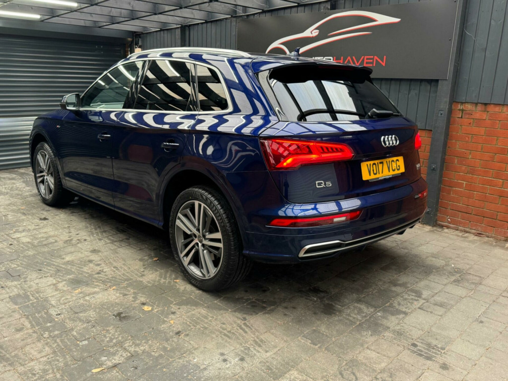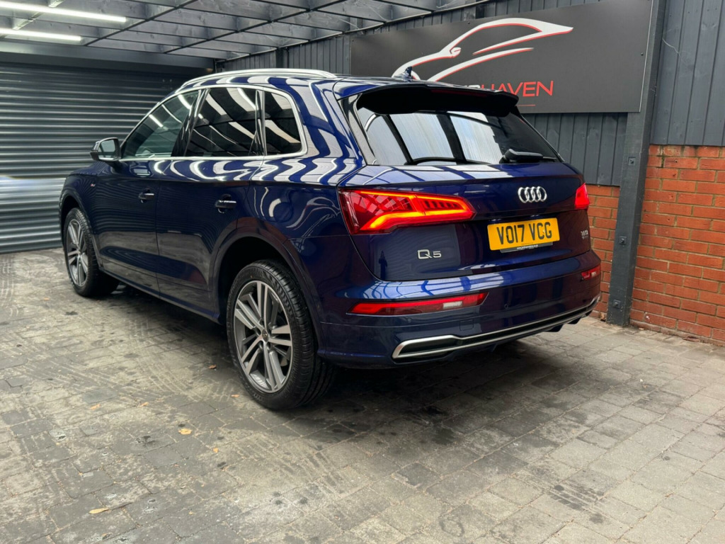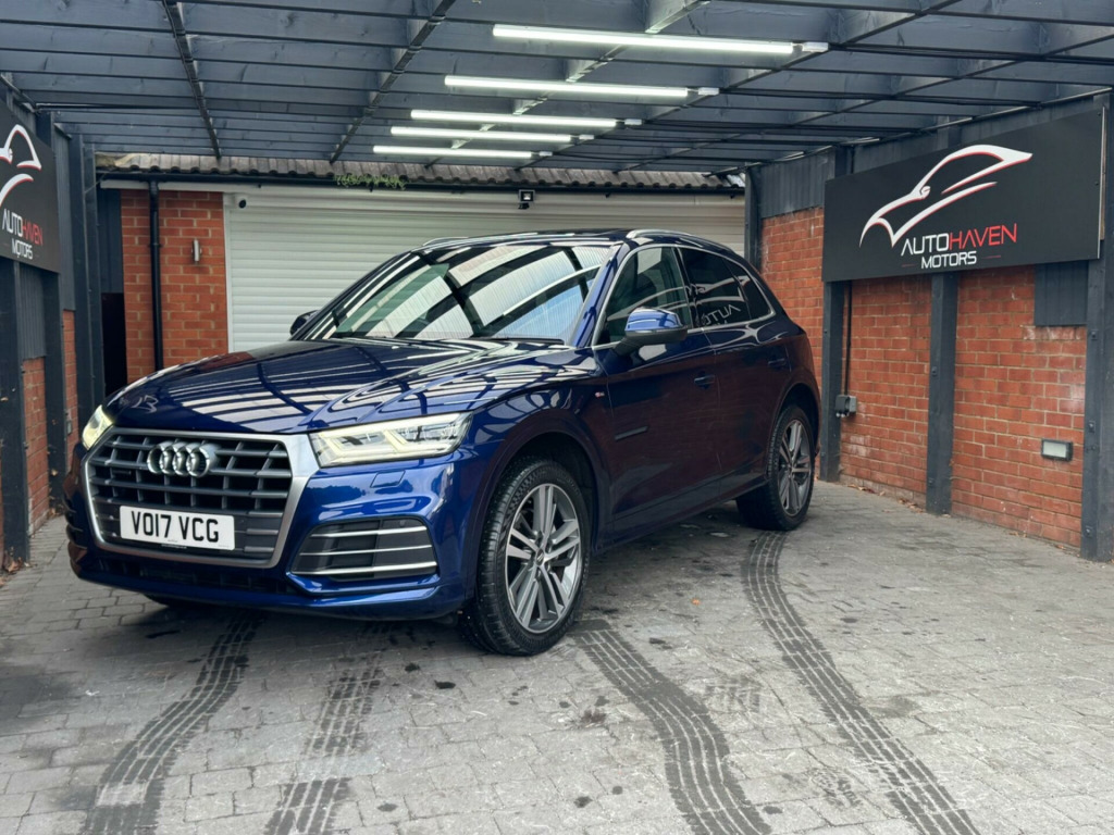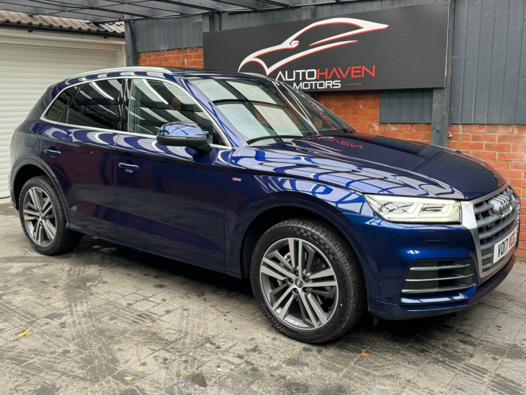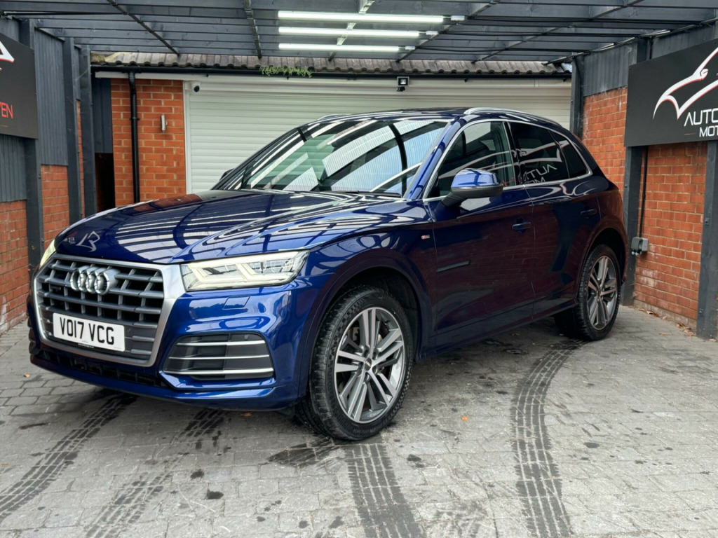 With a full service history and a clear vehicle history check, this 2017 Audi Q5 TFSI S line offers excellent provenance and peace of mind. This four-wheel-drive model is powered by a 2.0-litre petrol engine and meets Euro 6 emissions standards. It has had just two owners, with the last lady owner having had the vehicle since 2017 when it was originally a demo car. The car is well specified and features a panoramic glass sunroof, striking 20-inch contrasting grey diamond-cut alloy wheels with brand new tyres fitted, and advanced LED headlights with Audi's distinctive Q signature design. Inside, the cabin benefits from the Technology Package, including Bluetooth connectivity and wireless phone charging, along with deluxe three-zone climate control for maximum comfort for all occupants.This Audi Q5 delivers both practicality and performance, offering a generous boot space ideal for everyday use or longer journeys. Its strong acceleration, reaching 0-62mph in just 6.3 seconds, helps it stand out in its class, while a substantial 2400kg towing capacity adds to its versatility. The vehicle comes with an MOT valid until January 2027 and is supplied with a three-month warranty, providing additional reassurance for the next owner.The car is supplied with two keys and all original manuals and is ready to drive away the same day. Part exchange is welcome, and nationwide delivery can be arranged. Extended warranties are also available for added peace of mind.Viewing is strictly by appointment only. We are open Monday to Sunday from 9am until late. Please call us today for further information or to arrange a viewing. chnology package, 20in alloy wheels - 5-segment-spoke design contrasting grey - diamond cut, panoramic glass sunroof, 19in alloy wheels - 5-twin-spoke star design - diamond cut finish, 2 x sdxc card readers, 2 x usb charging ports and 1 x aux-in, 4-way electric lumbar support, 6-airbag system, air inlet horizontal inlay in matt aluminium, aluminium roof rails, anti theft locking wheel bolts, anti-theft alarm, audi connect infotainment services - 3 month trial, audi connect safety and service - e-call, audi drive select, audi parking system plus, audi pre-sense city, audi smartphone interface, audi sound system, auto-dimming rear-view mirror, automatic headlight adjustment, bluetooth interface, body coloured door mirrors, cd drive, cloth headlining in black, colour drivers information system with 7in display, comfort dynamic suspension, contrast stitching on seats - steering wheel and gear lever gaiter, cruise control with speed limiter, dab digital radio, deluxe 3-zone climate control, door inserts in matt selenite silver, door mirrors - electrically adjustable and heated with integrated led side indicators, esc - electronic stabilisation control inc abs - asr and edl, electric windows - front and rear, electromechanical parking brake, electromechanical power steering, first aid kit and warning triangle, front centre armrest, front and rear floor mats, gear lever knob in black perforated leather, heated front seats, high multi-function 3-spoke leather steering wheel with grips in perforated leather and s badging with gear-shift paddles, high-gloss package, honeycomb side air inlet grille in titanium black, isofix child seat mounting and top tether, illuminated door sill trims with s logo, inlays - matt brushed aluminium, keyless go, led headlights featuring q signature design with led rear lights and dynamic rear indicators, led interior lighting pack, led rear lights, light and rain sensor, luggage compartment cover, luggage compartment mat, mmi navigation - sd card based, mmi radio plus with 7in colour mmi screen and mmi controller, manual seat adjustment, non-smoking package, pedals in stainless steel, pop-up bonnet for pedestrian protection, power operated tailgate, privacy glass with acoustic glazing for front windows, radiator grille in matt twilight grey with horizontal matt aluminium struts, rear diffuser in body colour with matt aluminium silver surrounds, remote central locking, removable luggage compartment floor, removable net partition, s line badges on the front wing panels, s line front and rear bumpers, s line side skirts, s line rear spoiler, seat belt monitoring, side and rear windows in heat-insulating glass, split folding rear seat bench, stainless steel loading sill protector, tool kit and car jack, towbar preparation, tyre pressure warning light, tyre repair kit, underbody protection in matt selenite silver, voice control system, windscreen with acoustic glass, quattro on demand