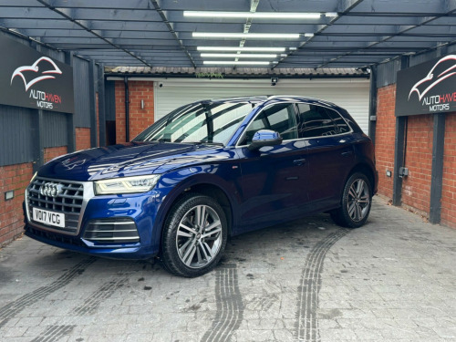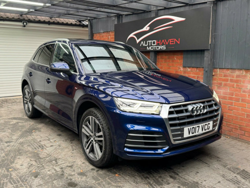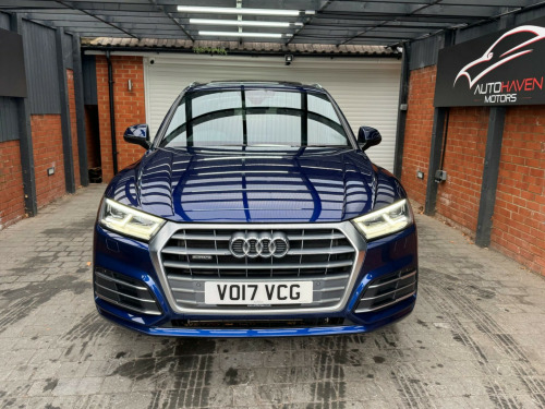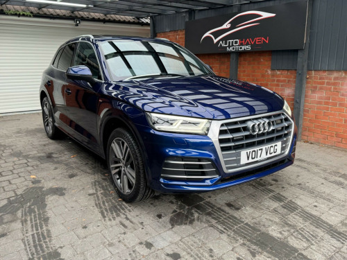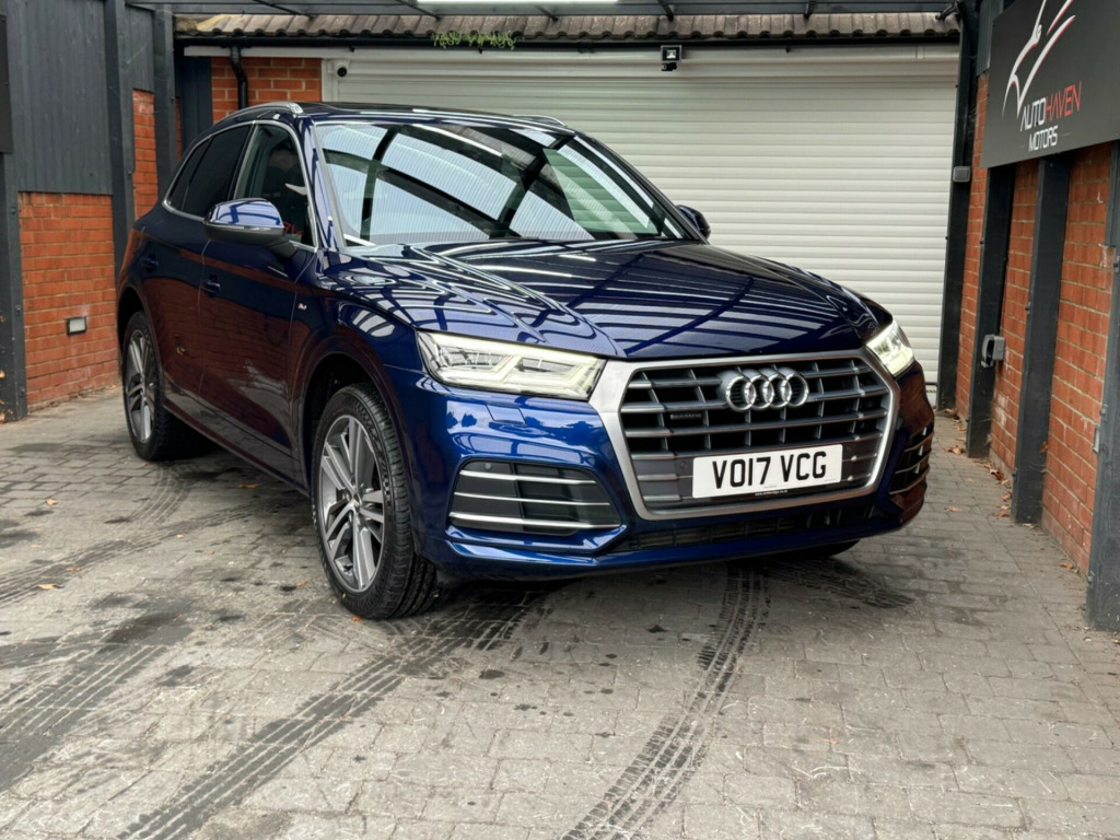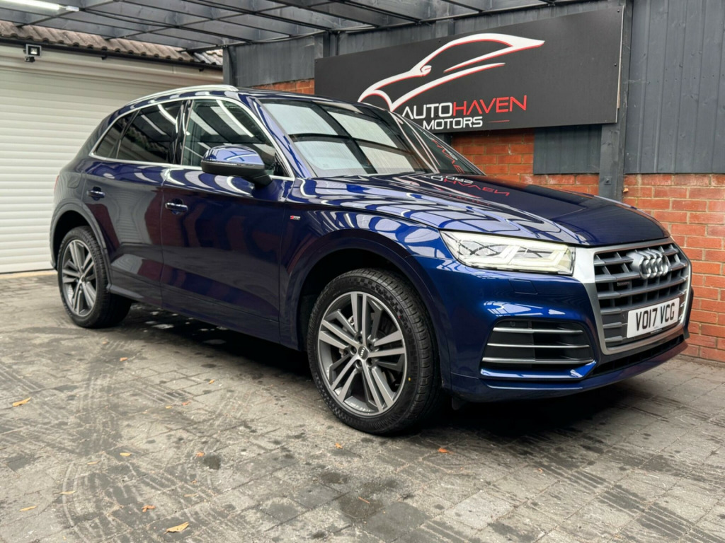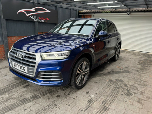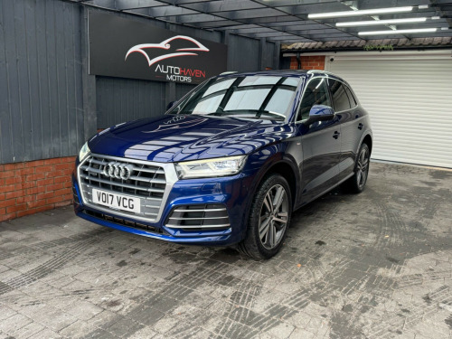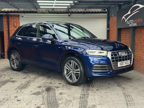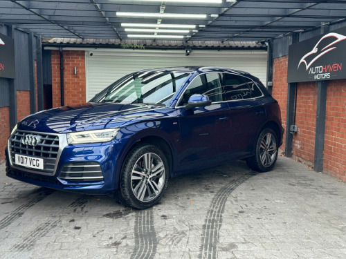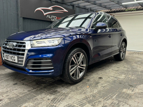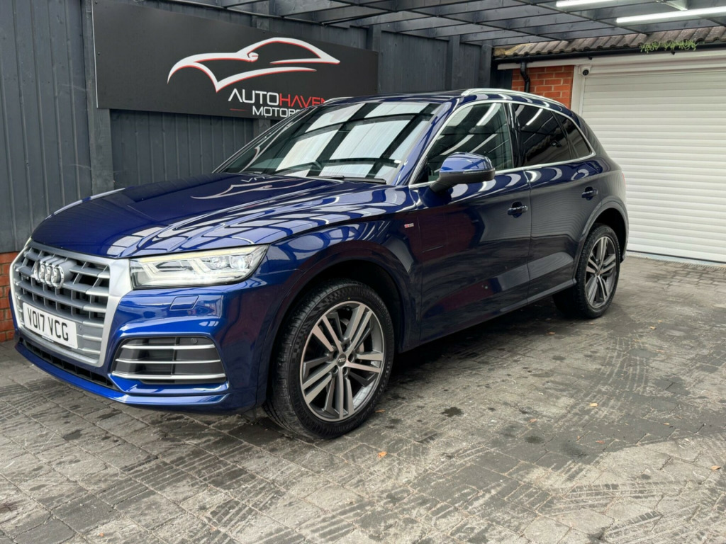 With a full service history and a clear vehicle history check, this 2017 Audi Q5 TFSI S line offers excellent provenance and peace of mind. This four-wheel-drive model is powered by a 2.0-litre petrol engine and meets Euro 6 emissions standards. It has had just two owners, with the last lady owner having had the vehicle since 2017 when it was originally a demo car. The car is well specified and features a panoramic glass sunroof, striking 20-inch contrasting grey diamond-cut alloy wheels with brand new tyres fitted, and advanced LED headlights with Audi's distinctive Q signature design. Inside, the cabin benefits from the Technology Package, including Bluetooth connectivity and wireless phone charging, along with deluxe three-zone climate control for maximum comfort for all occupants.This Audi Q5 delivers both practicality and performance, offering a generous boot space ideal for everyday use or longer journeys. Its strong acceleration, reaching 0-62mph in just 6.3 seconds, helps it stand out in its class, while a substantial 2400kg towing capacity adds to its versatility. The vehicle comes with an MOT valid until January 2027 and is supplied with a three-month warranty, providing additional reassurance for the next owner.The car is supplied with two keys and all original manuals and is ready to drive away the same day. Part exchange is welcome, and nationwide delivery can be arranged. Extended warranties are also available for added peace of mind.Viewing is strictly by appointment only. We are open Monday to Sunday from 9am until late. Please call us today for further information or to arrange a viewing. chnology package, 20in alloy wheels - 5-segment-spoke design contrasting grey - diamond cut, panoramic glass sunroof, 19in alloy wheels - 5-twin-spoke star design - diamond cut finish, 2 x sdxc card readers, 2 x usb charging ports and 1 x aux-in, 4-way electric lumbar support, 6-airbag system, air inlet horizontal inlay in matt aluminium, aluminium roof rails, anti theft locking wheel bolts, anti-theft alarm, audi connect infotainment services - 3 month trial, audi connect safety and service - e-call, audi drive select, audi parking system plus, audi pre-sense city, audi smartphone interface, audi sound system, auto-dimming rear-view mirror, automatic headlight adjustment, bluetooth interface, body coloured door mirrors, cd drive, cloth headlining in black, colour drivers information system with 7in display, comfort dynamic suspension, contrast stitching on seats - steering wheel and gear lever gaiter, cruise control with speed limiter, dab digital radio, deluxe 3-zone climate control, door inserts in matt selenite silver, door mirrors - electrically adjustable and heated with integrated led side indicators, esc - electronic stabilisation control inc abs - asr and edl, electric windows - front and rear, electromechanical parking brake, electromechanical power steering, first aid kit and warning triangle, front centre armrest, front and rear floor mats, gear lever knob in black perforated leather, heated front seats, high multi-function 3-spoke leather steering wheel with grips in perforated leather and s badging with gear-shift paddles, high-gloss package, honeycomb side air inlet grille in titanium black, isofix child seat mounting and top tether, illuminated door sill trims with s logo, inlays - matt brushed aluminium, keyless go, led headlights featuring q signature design with led rear lights and dynamic rear indicators, led interior lighting pack, led rear lights, light and rain sensor, luggage compartment cover, luggage compartment mat, mmi navigation - sd card based, mmi radio plus with 7in colour mmi screen and mmi controller, manual seat adjustment, non-smoking package, pedals in stainless steel, pop-up bonnet for pedestrian protection, power operated tailgate, privacy glass with acoustic glazing for front windows, radiator grille in matt twilight grey with horizontal matt aluminium struts, rear diffuser in body colour with matt aluminium silver surrounds, remote central locking, removable luggage compartment floor, removable net partition, s line badges on the front wing panels, s line front and rear bumpers, s line side skirts, s line rear spoiler, seat belt monitoring, side and rear windows in heat-insulating glass, split folding rear seat bench, stainless steel loading sill protector, tool kit and car jack, towbar preparation, tyre pressure warning light, tyre repair kit, underbody protection in matt selenite silver, voice control system, windscreen with acoustic glass, quattro on demand
