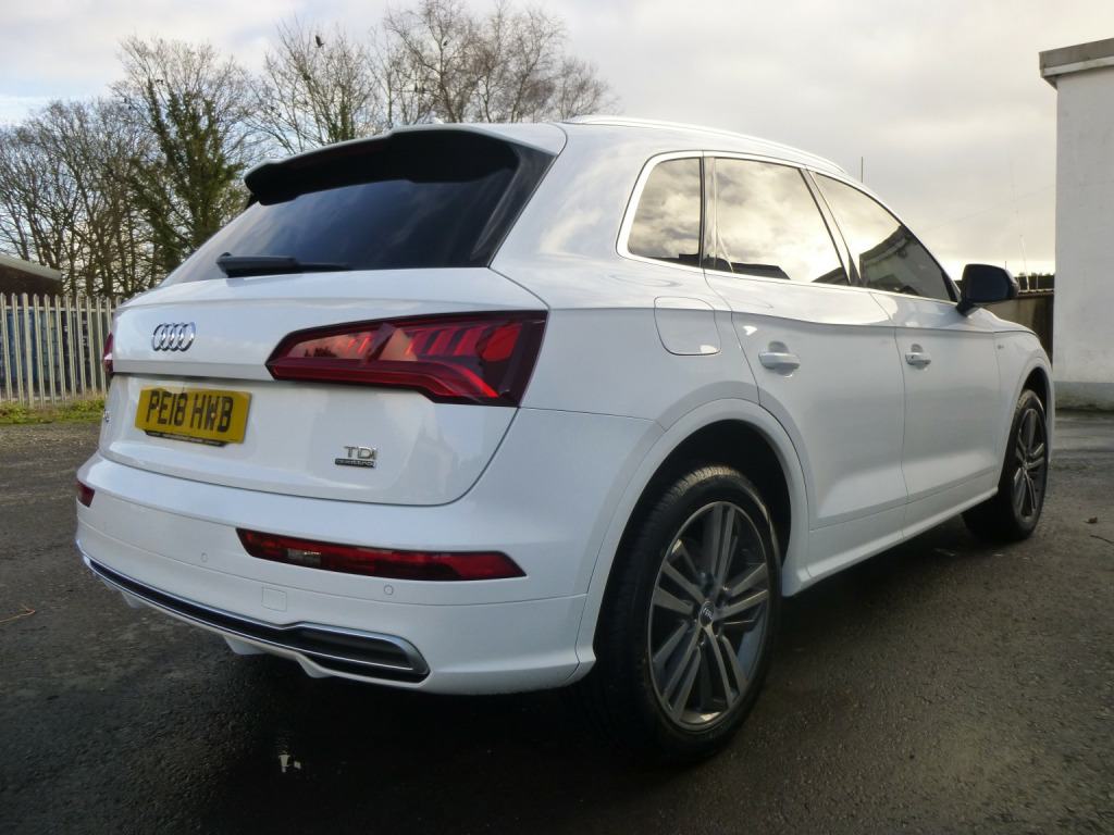 audi q5 new shape 2.0 tdi 187 bhp quattro s-line+ 7 spd s-tronic automatic transmission euro6 ulez compliant suv,You get it,You wouldnt be reading this if you didnt,so there must be something about the all-new Audi Q5 that sets it apart from the dozens of SUVs and crossovers , available,Maybe its the contemporary yet timeless exterior styling,Maybe its the unique balance of fun,sporty performance with the versatility of expanded interior volume, It might be the exhilaration of the steering wheel in your hands or the thrills it commands while you take in the winding road ahead,packed with goodies like,MMI Navigation SD Card Based,MMI Radio Plus with 7 inch Colour MMI Screen and MMI Controller,Tow Bar Preparation,2 x SDXC Card Readers,2 x USB Charging Ports and 1 x AUX-IN,Audi Connect Infotainment Servicesl,Audi Connect Safety and Service - e-call,Audi Smartphone Interface,Audi Sound System,Bluetooth Interface,CD Drive,DAB Digital Radio,Tyre Pressure Warning Light,Voice Control System,quattro On Demand,Audi Drive Select,Audi Parking System Plus,Colour Drivers Information System with 7 inch Display,Cruise Control with Speed Limiter,Door Mirrors Electrically Adjustable and Heated with Integrated LED Side Indicators,Electric Windows Front and Rear,High-Gloss Package,Privacy Glass with Acoustic Glazing For Front Windows,Radiator Grille in Twilight Grey with Horizontal Matt Aluminium Struts,Rear Diffuser in Body Colour with Matt Aluminium Silver Surrounds,S Line Badges on the Front Wing Panels,S Line Front and Rear Bumpers,S Line Roof Spoiler,S Line Side Skirts,Side and Rear Windows in Heat-Insulating glass, Windscreen with Acoustic Glass,19 chin Alloy Wheels 5-Twin-Spoke Star Design Diamond Cut Finish,Aluminium Roof Rails,Body Coloured Door Mirrors,LED Headlights with LED Rear Lights and Dynamic Rear Indicators,LED Rear Lights,Light and Rain Sensor,Automatic Headlight Adjustment,Deluxe 3-Zone Climate Control air conditioned,Electric Boot Lid Release,Email Calendar and Text Messages can be Displayed on your Vehicles MMI,Front Centre Armrest,Front Sports Seats with S Embossed Logo,Front and Rear Floor Mats,Gear Lever Knob in Black Perforated Leather,Heated Front Seats,High Multi-function 3-Spoke Leather Steering Wheel with Grips in Perforated Leather and S Badging with Gear-Shift Paddles,Illuminated Door Sill Trims with S Logo,Matt Brushed Aluminium inlays,Keyless Go,LED Interior Lighting Pack,Manual Seat Adjustment,Pedals in Stainless Steel,Removable Luggage Compartment Floor,Removable Net Partition,Split Folding Rear Seat Bench 40-20-40 with Rear Seat Armrest,Stainless Steel Loading Sill Protector,4-Way Electric Lumbar Support,Auto-Dimming Rear-View Mirror,, Cloth Headlining in Black,Contrast Stitching on Seats,Steering Wheel and Gear Lever Gaiter,Dynamic Suspension,Electromechanical Power Steering,[ESC] Electronic Stabilisation Control inc [ABS]-[ASR] and [EDL],Electromechanical Parking Brake First Aid Kit and Warning Triangle, Hill Descent Control,Hill Hold Assist,ISOFIX Child Seat Mounting and Top Tether,Pop-Up Bonnet for Pedestrian Protection,Remote Central Locking,Seat Belt Monitoring,Underbody Protection in Body Colour,[6]-Airbag System,Anti-Theft Alarm,Audi Pre-Sense City,silky smooth 7 spd s-tronic automatic transmission,euro6 ulez compliant,108,000 miles with history,looks and drives superb,finished in audis colour coded [ly9c] ibis white , , , , , , , , , , , , , hpi report available on all vehicles
