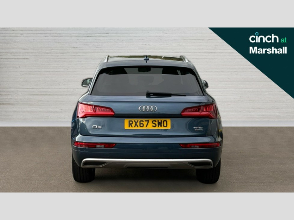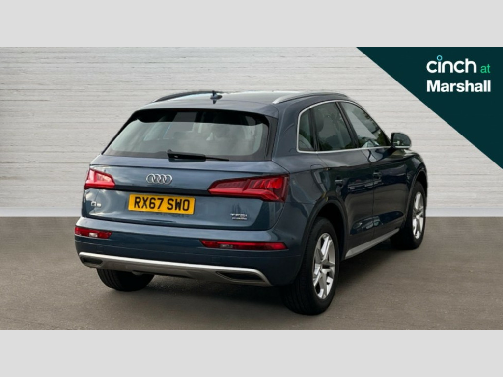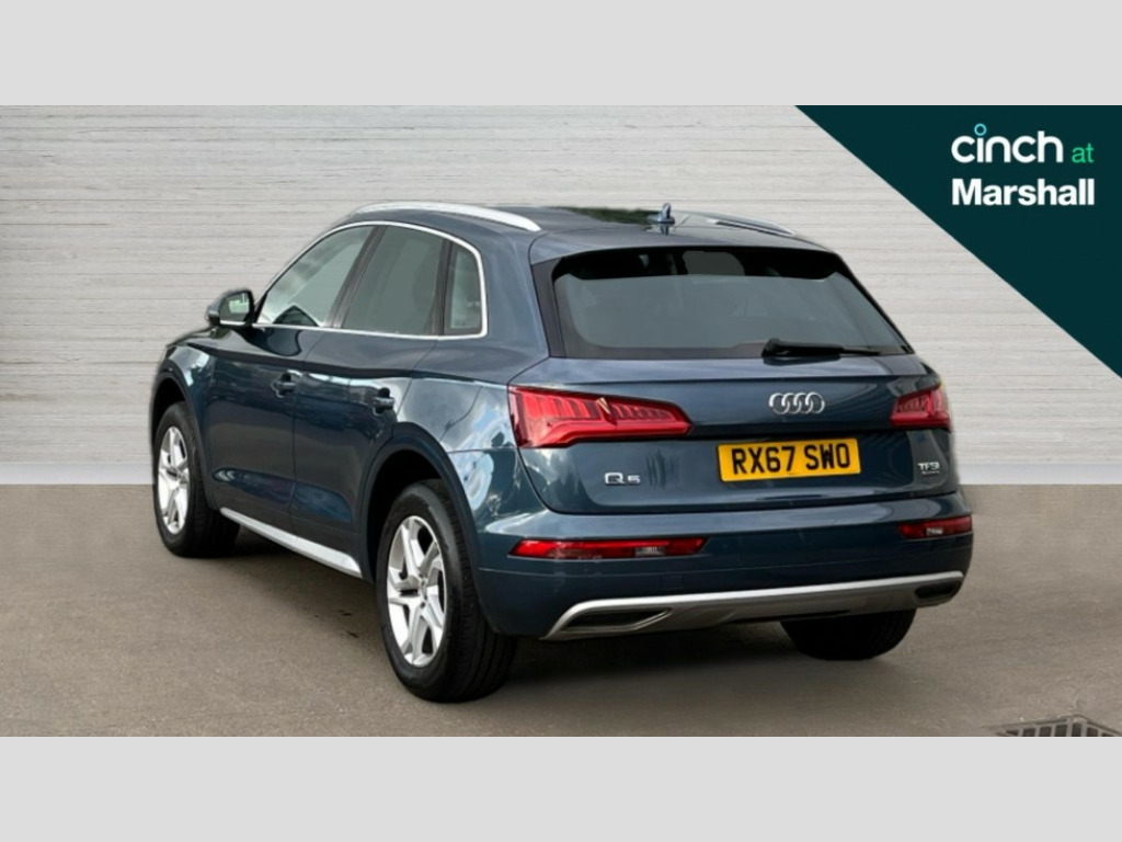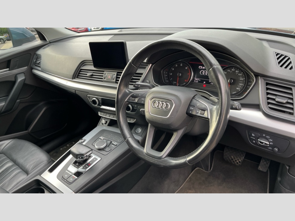 Audi Q5 2.0T FSI Quattro SE 5dr S Tronic Audi connect, Audi drive select, Audi Pre sense collision avoidance, Audi smartphone interface, Driver information centre with colour display in instrument panel, Electric power steering, Power tailgate, Service interval indicator, Voice control system, 2 USB ports, 2x SD card slot, Auxiliary input socket, CD player, DAB Digital radio, MMI radio plus with 7" colour MMI screen and MMI controller, Acoustic windscreen, Aluminium roof rails, Aluminium sill plates, Auto dimming rear view mirror, Black high gloss front air inlet, Body colour bumpers, Body colour door mirrors, Body colour rear diffuser insert, Chrome exhaust tailpipe, Electric headlight adjustment, Electrically adjustable and heated door mirrors, Front and rear electric windows, Front fog lights, Headlight range control, Headlight washers, High gloss black radiator grille with horizontal chrome struts, Light and rain sensor for auto activation of lights and windscreen wipers, Loading sill protector in stainless steel, Rear diffuser strip in selenite silver, Rear spoiler, Rear wiper, 3 rear headrests, 3 zone climate control, 40:20:40 split folding rear bench seat, Cloth headlining, Front centre armrest with 12v socket, Front/rear floor mats, Height adjustable driver's seat, Height adjustable front head restraints, Isofix front passenger and rear seat preparation, Jack and tool kit, Load compartment cover, Luggage compartment carpet, Matt selenite silver door inserts, Reach + rake adjustable steering column, Removable luggage compartment floor, Removable net partition, Roller blind loadspace cover, Sunvisors with vanity mirrors, Non Smokers pack, 3 point seatbelts on all seats, ABS, Curtain airbags, Driver and passenger airbags, Driver and passenger side airbags, Electromechanical parking brake, ESC with ASR, ESP, First aid kit, Front passenger airbag deactivation, Hill descent control, Seat belt force limiter, Seatbelt warning lamp, Traction control, Tyre pressure monitor, Warning triangle, Locking wheel bolts, Remote central locking, Thatcham category 1 alarm + immobiliser