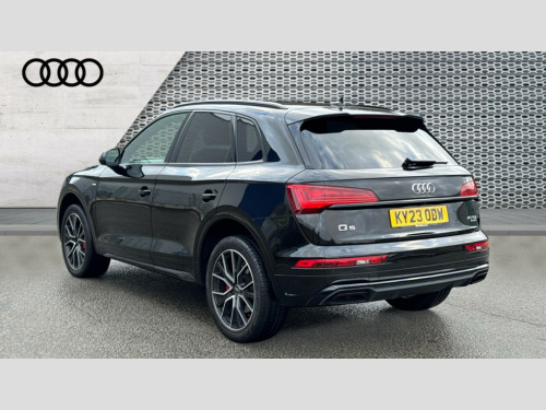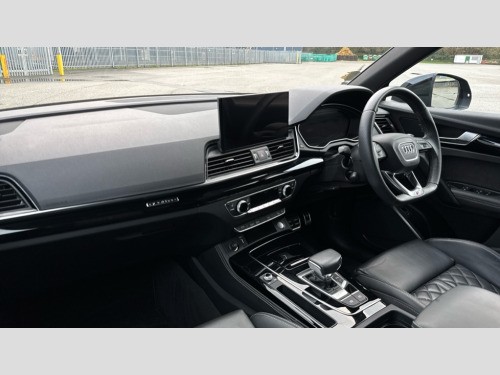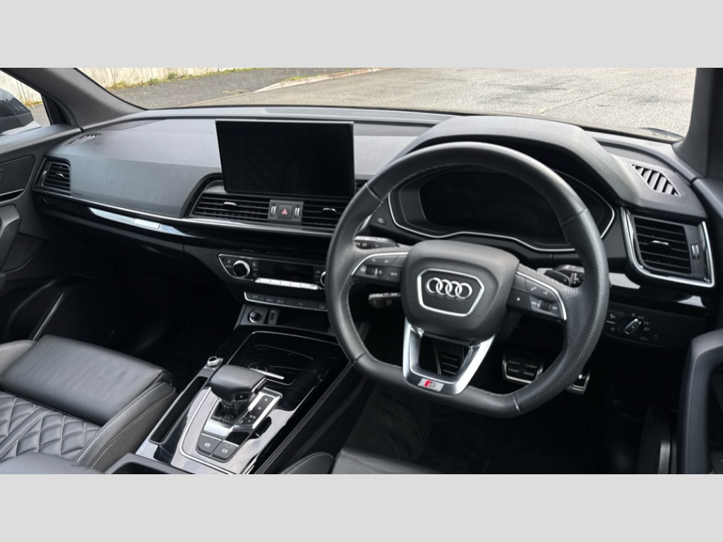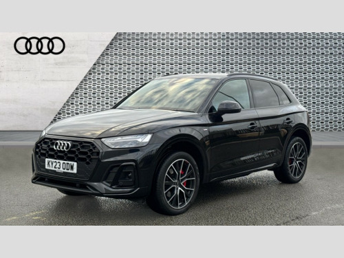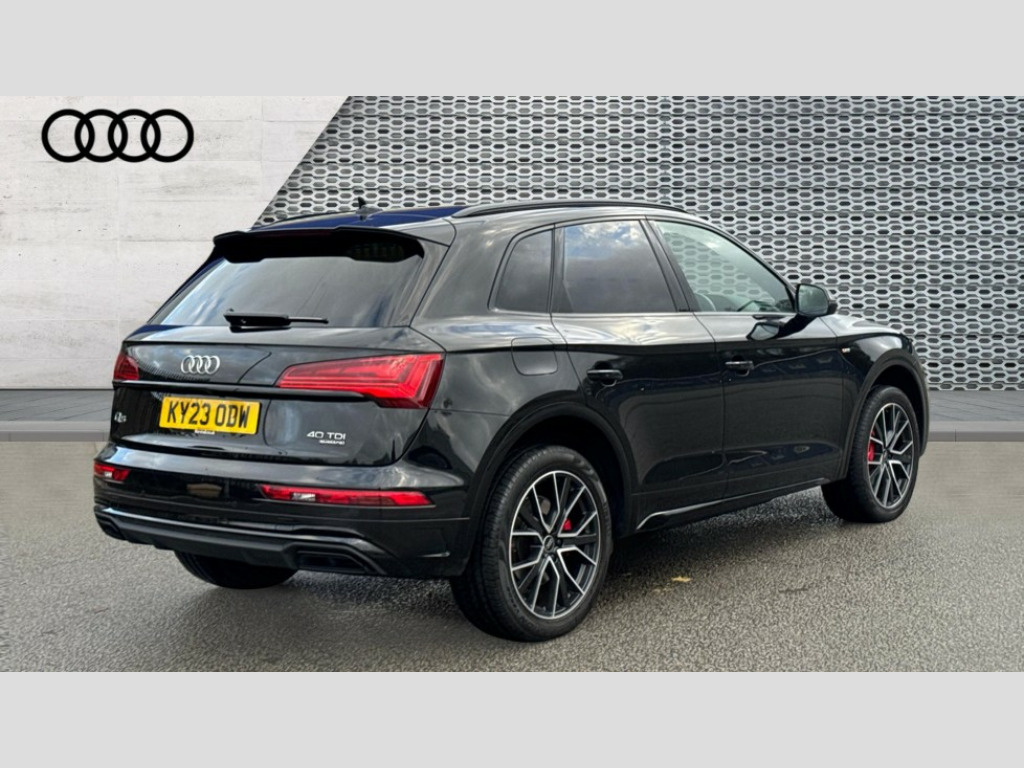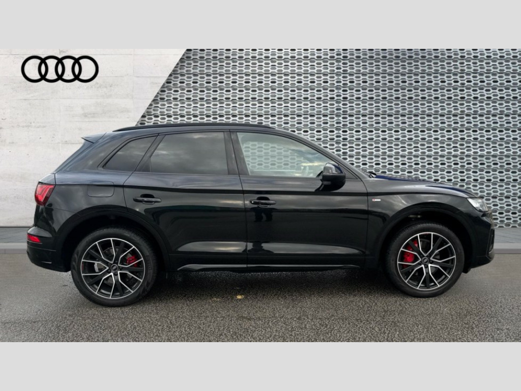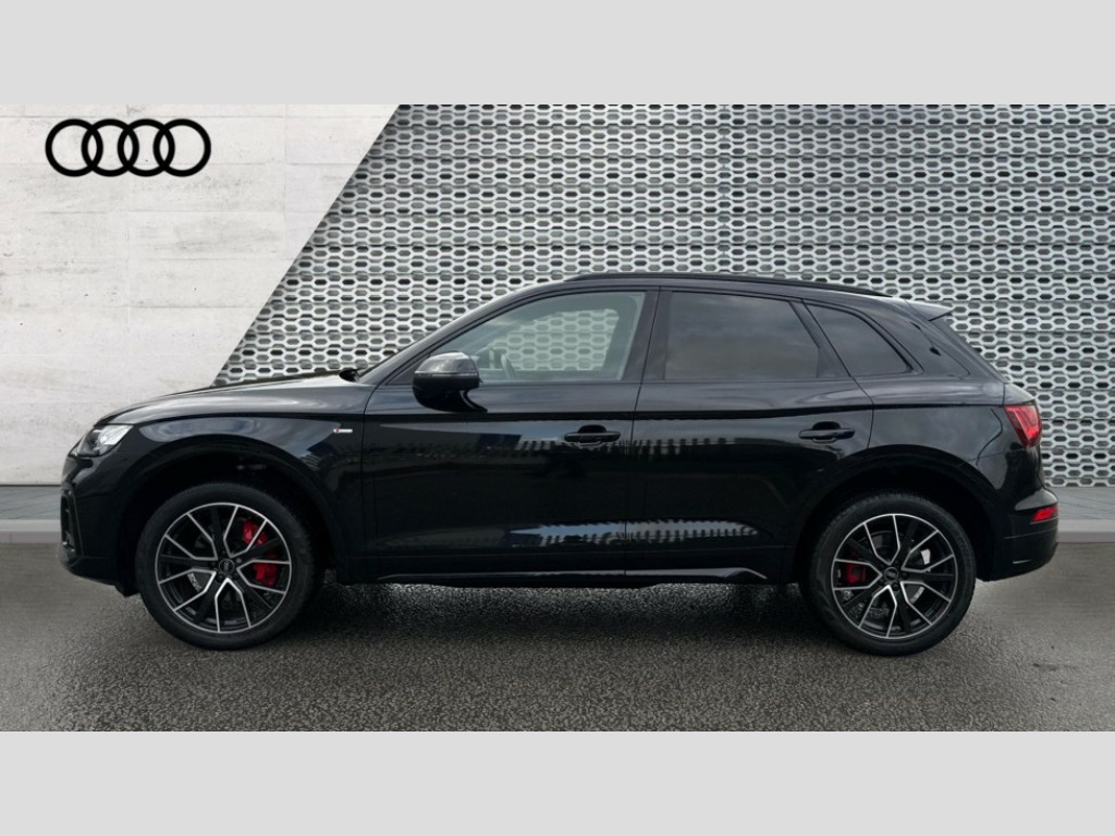 Audi Q5 40 TDI Quattro Edition 1 5dr S Tronic Acoustic front and rear parking sensor, Audi connect safety and service (e-call), Audi connect with Amazon Alexa Integration, Audi drive select, Audi virtual cockpit plus with 12.3" screen and three different layout designs, Audi wireless smartphone interface, Automatic start-stop system with coasting functionality and efficiency programme, Bluetooth interface, Electro - mechanical power assisted steering, MMI navigation plus with 10.1" touch screen, Power tailgate, Reversing camera, Service interval indicator, Voice control system with Audi hotword activation "Hey Audi", Diesel particulate filter, Quattro on demand, S line sports suspension, 2 x USB charging port with aux input socket, 8 loudspeakers, DAB Digital radio, Acoustic windscreen, Audi matrix LED headlights with dynamic front and rear indicators, Audi rings at front and rear in black, Audi rings decal on rear doors, Auto dimming door mirrors, Auto dimming frameless rear view mirror, Automatic headlight adjustment, Automatic headlights and windscreen wipers, Black roof rails, Body colour bumpers, Body colour underbody protection, Chrome plated exhaust trims, Daytime running lights, Door sills in Selenite silver, Electric adjustable/heated/folding door mirrors, Front air inlet surrounds in anthracite black, Front and rear electric windows, Headlight washers, High gloss black B pillar trims and triangular rear door trim, High level LED brake light, Rear chrome trim strip below lights, Rear privacy glass and rear side windows, Rear side wing doors, Rear wiper, Roof bars, S Line rear spoiler, 3 rear headrests, 4 way electric lumbar support for driver and front passenger, 40:20:40 split folding 3 rear bench seat in 2nd row with rear centre armrest, Black cloth headlining, Comfort front centre armrest, Contrast stitching on seats, steering wheel and gear lever gaiter, Deluxe 3 zone electronic climate control, Electrically adjustable front seats, Fine Nappa leather upholstery with diamond pattern contrast stitching + front sport seats with S embossed logo, Front/rear floor mats, Gear lever in black leather, Heated front seats, Height adjustable front head restraints, Height/reach adjustable steering column, Illuminated door sill trims with S logo, Luggage compartment cover, Rear seat bench plus-adjust for forwards/backwards position/backrest angle, cupholders in the armrest, load through hatch and remote backrest release, Removable luggage compartment floor, Single front passenger seat, Stainless steel pedals, Sunvisors with vanity mirrors, Black styling package - Q5 Edition 1, Extended interior upholstery pack - Q5, Extended LED Interior multi coloured Lighting Pack - Q5, 3 point seatbelts on all seats, 6 airbags - Driver, front passenger, curtain and side airbags, Electrically operated child locks on rear doors, Electromechanical parking brake, Electronic stabilisation control including ABS, ASR and EDL, First aid kit with warning triangle and vests, Front and rear brake calipers painted in red, Front passenger airbag deactivation, Hill descent control, Hill hold assist, ISOFIX child seat mounting for front passenger seat and ISOFIX child seat mounting with Top Tether for outer rear seats, Multi collision brake assist, Pop-up bonnet for pedestrian protection, Pre sense city, Seat belt force limiter, Seatbelt monitoring, Tyre pressure warning, Anti theft alarm, Anti-theft wheel bolts, Keyless Go access/ignition system, Remote central locking, Air vents inserts and centre console in gloss black, Piano black finish inlay
