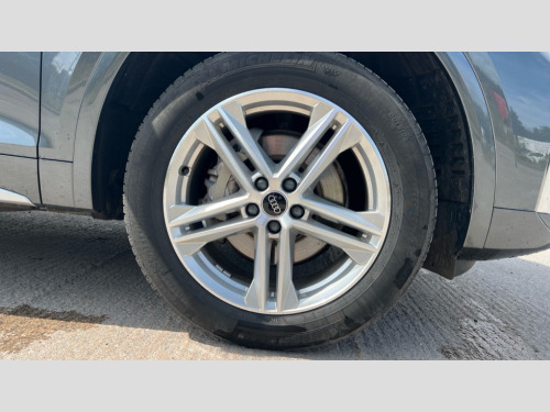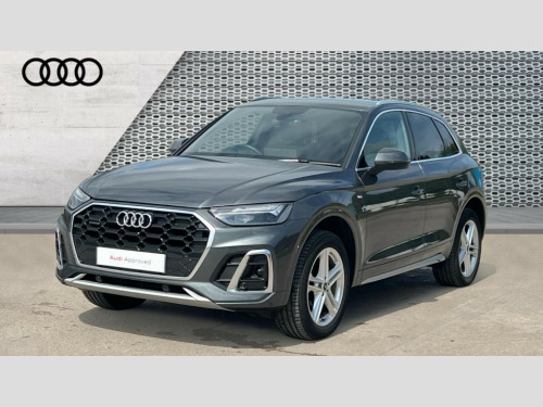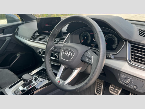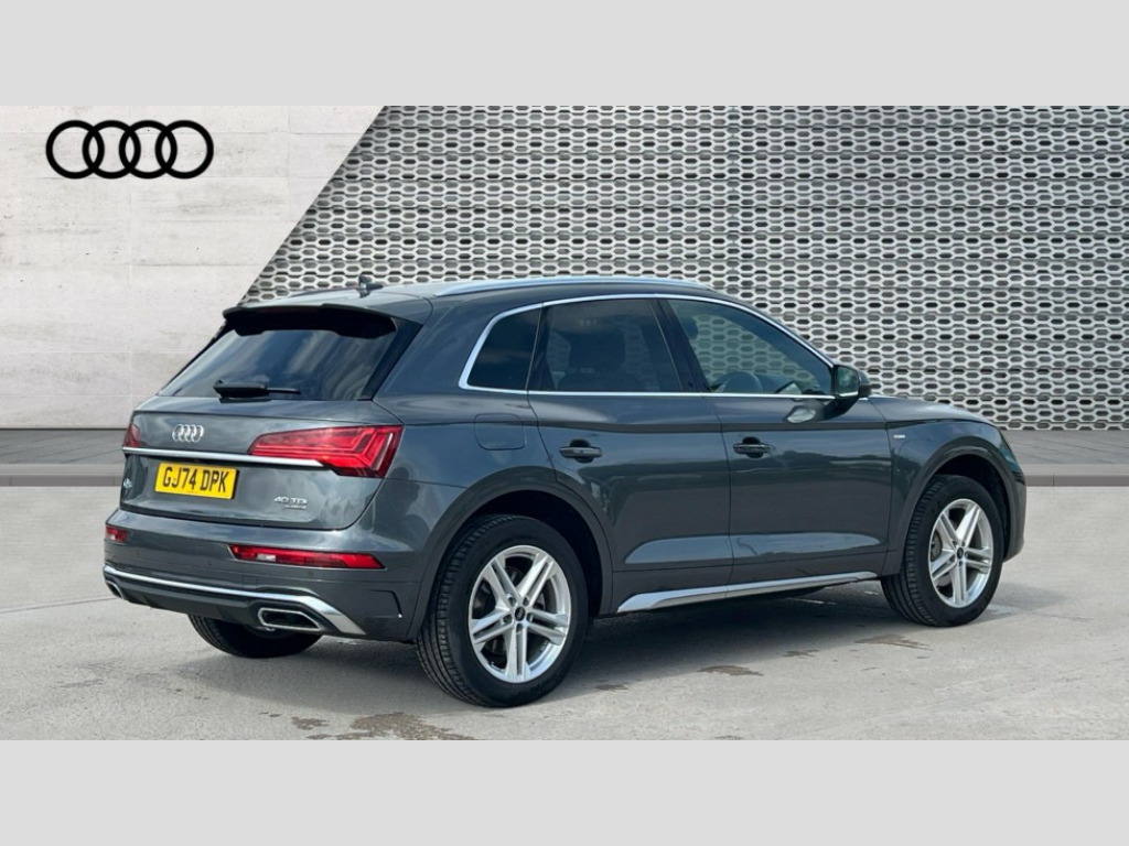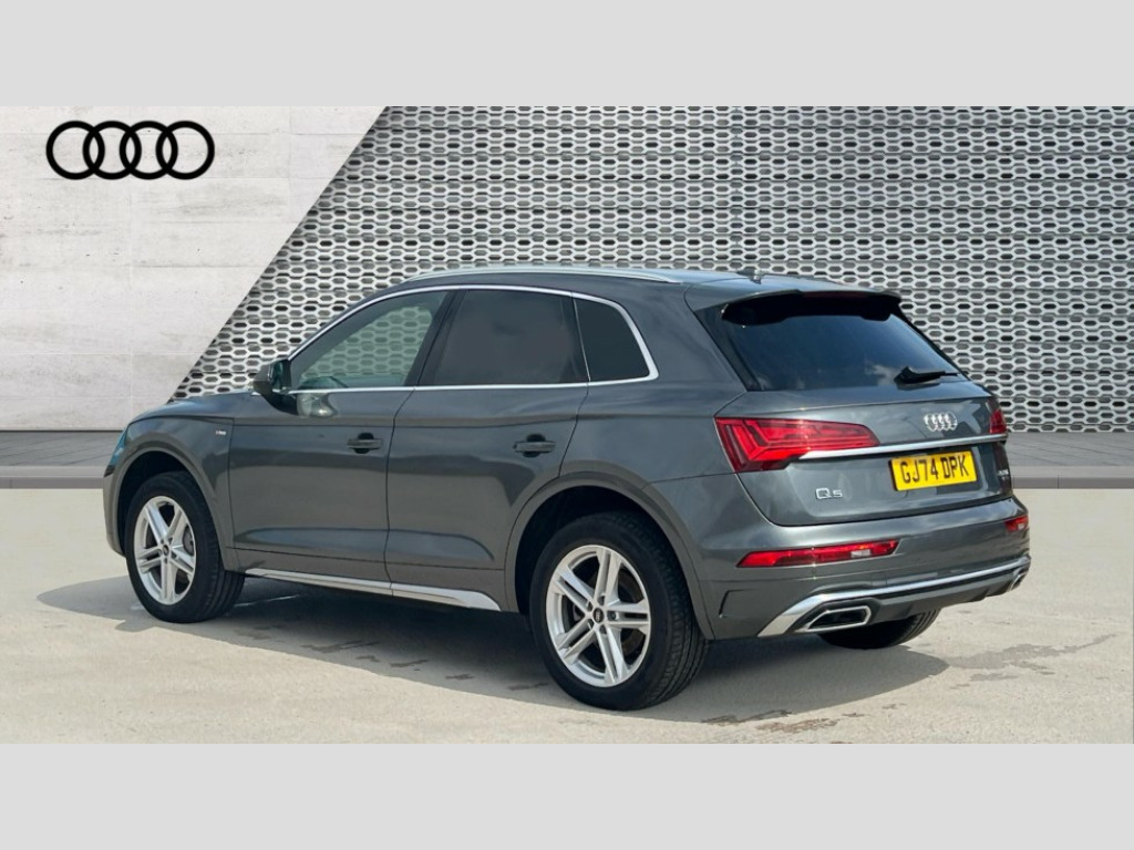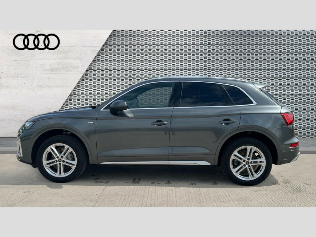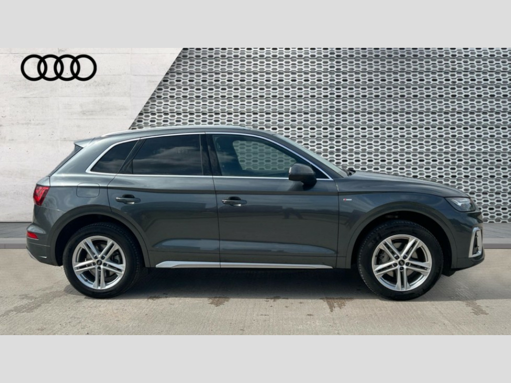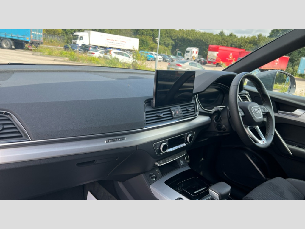 Audi Q5 40 TDI Quattro S Line 5dr S Tronic Acoustic front and rear parking sensor, Audi connect safety and service (e-call), Audi drive select, Audi virtual cockpit plus with 12.3" screen and three different layout designs, Audi wireless smartphone interface, Automatic start-stop system with coasting functionality and efficiency programme, Bluetooth interface, Camera based traffic sign recognition, Electro - mechanical power assisted steering, Lane departure warning, MMI navigation plus with 10.1" touch screen, Power tailgate, Reversing camera, Service interval indicator, Voice control system with Audi hotword activation "Hey Audi", Diesel particulate filter, Quattro on demand, S line sports suspension, 2 x USB charging port with aux input socket, 8 loudspeakers, DAB Digital radio, Acoustic windscreen, Aluminium roof rails, Auto dimming door mirrors, Auto dimming frameless rear view mirror, Automatic headlight adjustment, Automatic headlights and windscreen wipers, Body colour bumpers, Body colour door mirrors, Body colour rear diffuser with matt aluminium silver surrounds, Body colour underbody protection, Chrome plated exhaust trims, Daytime running lights, Door sills in Selenite silver, Electric adjustable/heated/folding door mirrors, Front air inlet surrounds in aluminium, Front and rear electric windows, Front radiator grille in honeycomb design, LED 3rd brake light, LED headlights and LED tail lights, Loading edge protection in stainless steel, Lower bumpers painted in contrast Manhattan grey, Rear chrome trim strip below lights, Rear privacy glass and rear side windows, Rear side wing doors, Rear wiper, Roof bars, S Line badges on the front wing panels, S Line front and rear bumpers, S Line rear spoiler, S Line side skirts, 3 rear headrests, 3 spoke leather multifunction steering wheel with S badging perforated leather grips, Black cloth headlining, Comfort front centre armrest, Contrast stitching on seats, steering wheel and gear lever gaiter, Deluxe 3 zone electronic climate control, Front head restraints, Front sport seats with S embossed logo, Front/rear floor mats, Gear lever in black leather, Heated front seats, Height/reach adjustable steering column, Illuminated door sill trims with S logo, Luggage compartment cover, Manual seat adjustment with 4-way electric lumbar support, Single front passenger seat, Stainless steel pedals, Sunvisors with vanity mirrors, Top surface of the rear centre armrest in artificial leather, High gloss pack - Q5, LED interior light pack - Q5, 3 point seatbelts on all seats, 6 airbags - Driver, front passenger, curtain and side airbags, Attention and drowsiness assist, Electrically operated child locks on rear doors, Electromechanical parking brake, Electronic stabilisation control including ABS, ASR and EDL, First aid kit with warning triangle and vests, Front passenger airbag deactivation, Hill descent control, Hill hold assist, ISOFIX child seat mounting for front passenger seat and ISOFIX child seat mounting with Top Tether for outer rear seats, Multi collision brake assist, Pop-up bonnet for pedestrian protection, Pre sense city, Seatbelt monitoring, Tyre pressure warning, Anti theft alarm, Anti-theft wheel bolts, Remote central locking, Remote control key with SAFELOCK and keyless go, Air vents inserts and centre console in gloss black, Matt brushed aluminium inlays, Tool kit, Tyre repair kit