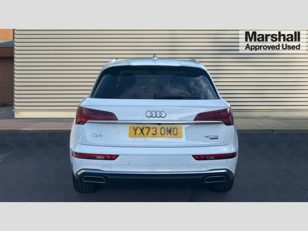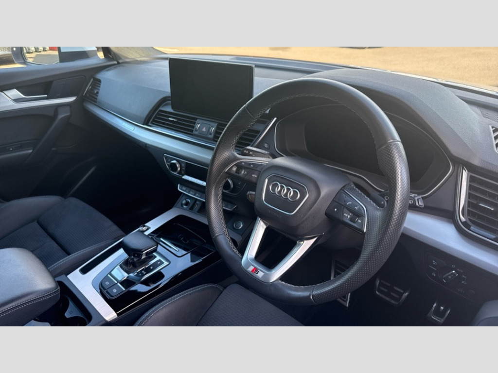 Audi Q5 40 TDI Quattro S Line 5dr S Tronic Acoustic front and rear parking sensor, Audi connect safety and service (e-call), Audi drive select, Audi virtual cockpit plus with 12.3" screen and three different layout designs, Audi wireless smartphone interface, Automatic start-stop system with coasting functionality and efficiency programme, Bluetooth interface, Camera based traffic sign recognition, Electro - mechanical power assisted steering, Lane departure warning, MMI navigation plus with 10.1" touch screen, Power tailgate, Reversing camera, Service interval indicator, Voice control system with Audi hotword activation "Hey Audi", Diesel particulate filter, Quattro on demand, S line sports suspension, 2 x USB charging port with aux input socket, 8 loudspeakers, DAB Digital radio, Acoustic windscreen, Aluminium roof rails, Auto dimming door mirrors, Auto dimming frameless rear view mirror, Automatic headlight adjustment, Automatic headlights and windscreen wipers, Body colour bumpers, Body colour door mirrors, Body colour rear diffuser with matt aluminium silver surrounds, Body colour underbody protection, Chrome plated exhaust trims, Daytime running lights, Door sills in Selenite silver, Electric adjustable/heated/folding door mirrors, Front air inlet surrounds in aluminium, Front and rear electric windows, Front radiator grille in honeycomb design, LED 3rd brake light, LED headlights and LED tail lights, Loading edge protection in stainless steel, Lower bumpers painted in contrast Manhattan grey, Rear chrome trim strip below lights, Rear privacy glass and rear side windows, Rear side wing doors, Rear wiper, Roof bars, S Line badges on the front wing panels, S Line front and rear bumpers, S Line rear spoiler, S Line side skirts, 3 rear headrests, 3 spoke leather multifunction steering wheel with S badging perforated leather grips, Black cloth headlining, Comfort front centre armrest, Contrast stitching on seats, steering wheel and gear lever gaiter, Deluxe 3 zone electronic climate control, Front head restraints, Front sport seats with S embossed logo, Front/rear floor mats, Gear lever in black leather, Heated front seats, Height/reach adjustable steering column, Illuminated door sill trims with S logo, Luggage compartment cover, Manual seat adjustment with 4-way electric lumbar support, Single front passenger seat, Stainless steel pedals, Sunvisors with vanity mirrors, Top surface of the rear centre armrest in artificial leather, High gloss pack - Q5, LED interior light pack - Q5, 3 point seatbelts on all seats, 6 airbags - Driver, front passenger, curtain and side airbags, Attention and drowsiness assist, Electrically operated child locks on rear doors, Electromechanical parking brake, Electronic stabilisation control including ABS, ASR and EDL, First aid kit with warning triangle and vests, Front passenger airbag deactivation, Hill descent control, Hill hold assist, ISOFIX child seat mounting for front passenger seat and ISOFIX child seat mounting with Top Tether for outer rear seats, Multi collision brake assist, Pop-up bonnet for pedestrian protection, Pre sense city, Seatbelt monitoring, Tyre pressure warning, Anti theft alarm, Anti-theft wheel bolts, Remote central locking, Remote control key with SAFELOCK and keyless go, Air vents inserts and centre console in gloss black, Matt brushed aluminium inlays, Tool kit, Tyre repair kit