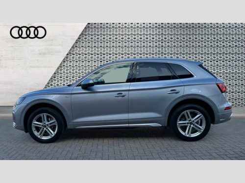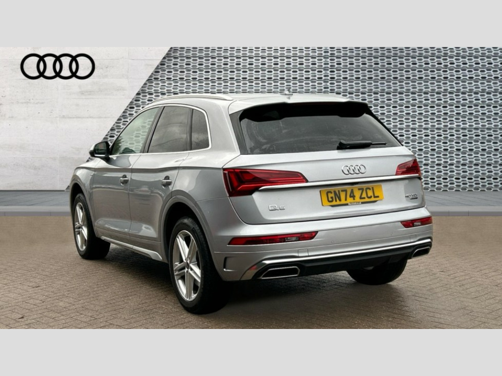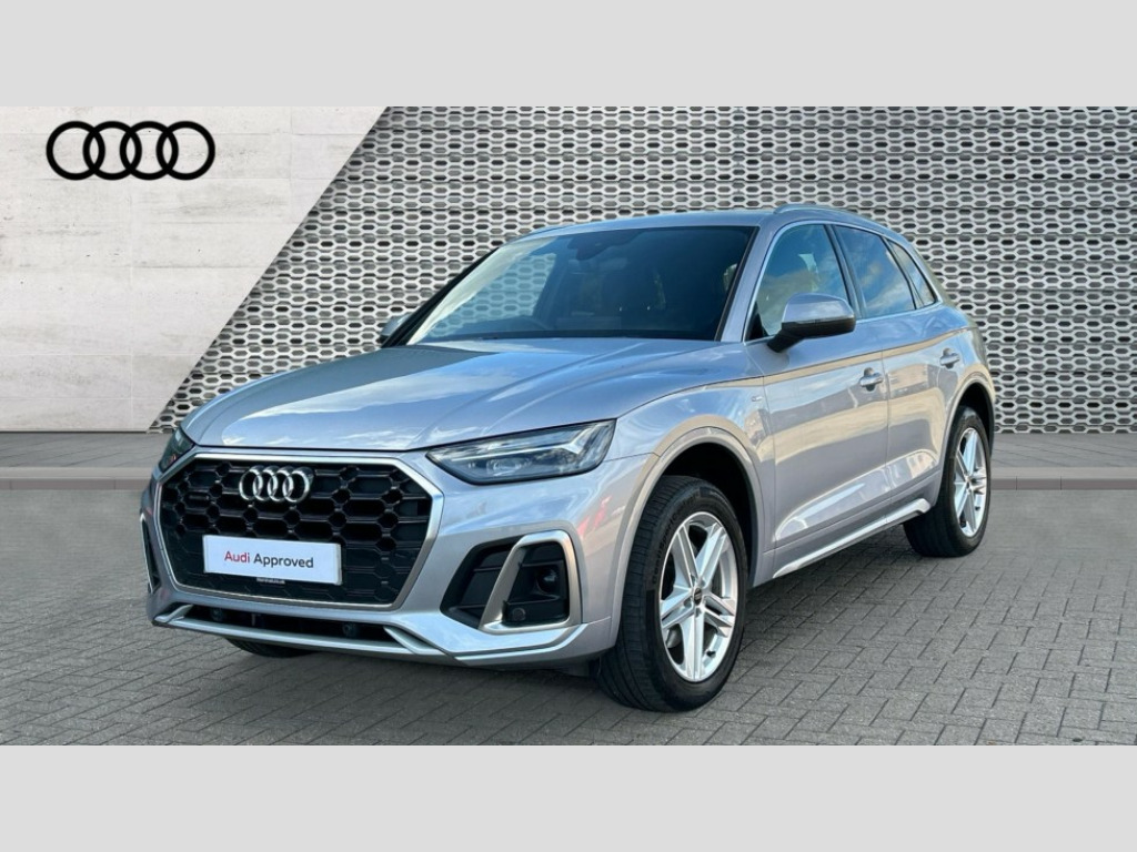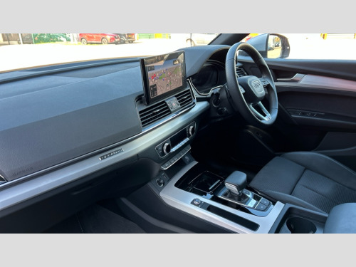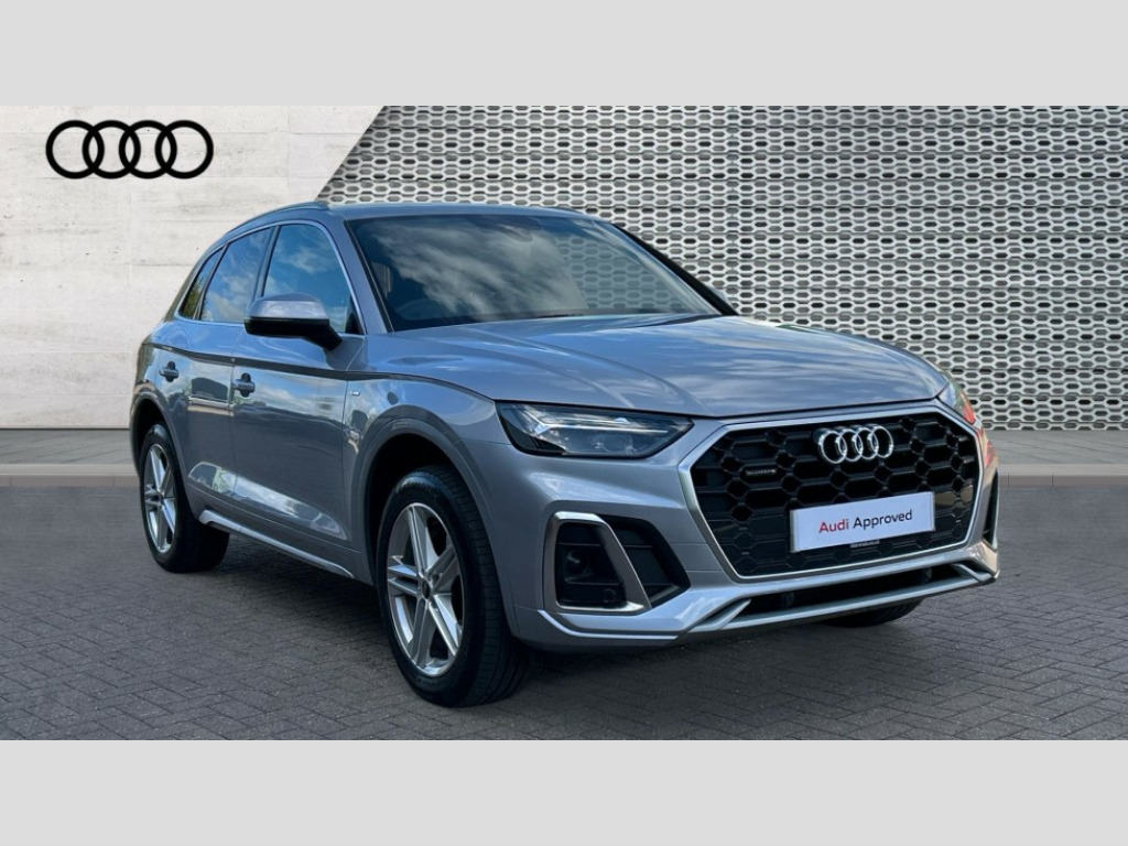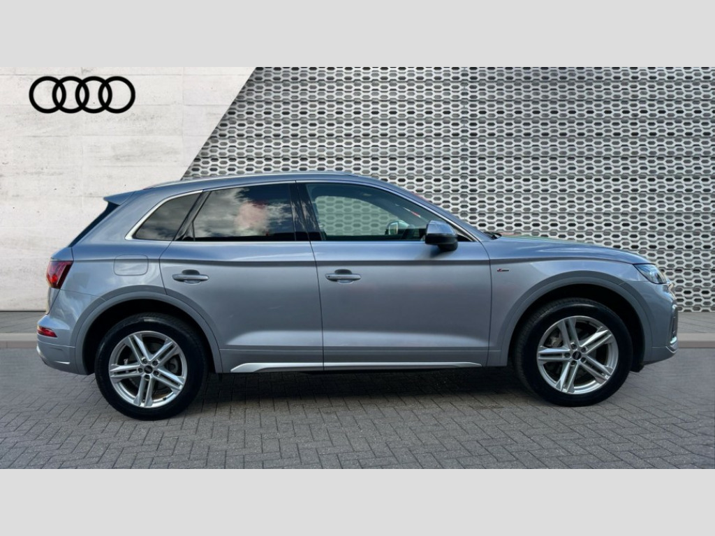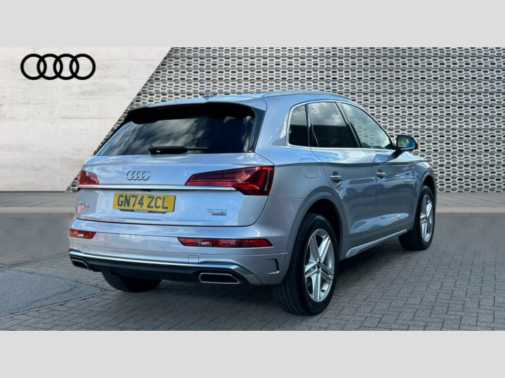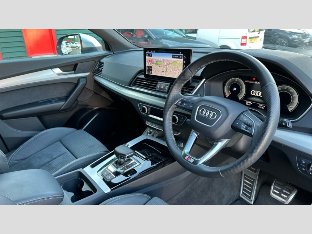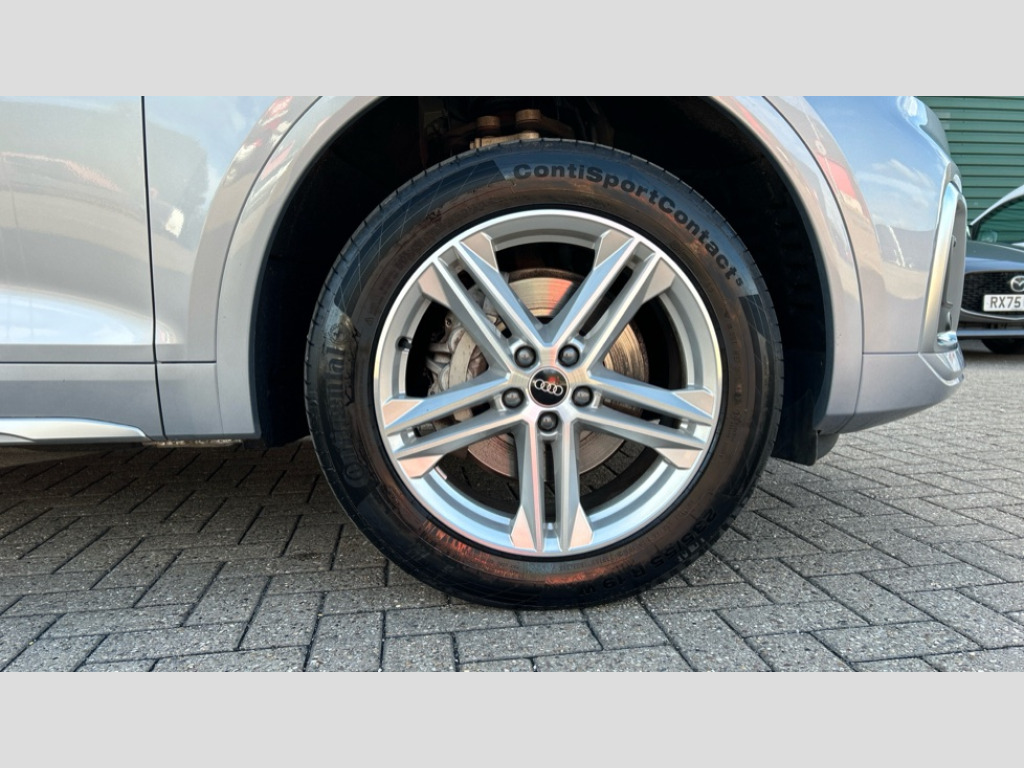 Audi Q5 40 TDI Quattro S Line 5dr S Tronic Acoustic front and rear parking sensor, Audi connect safety and service (e-call), Audi drive select, Audi virtual cockpit plus with 12.3" screen and three different layout designs, Audi wireless smartphone interface, Automatic start-stop system with coasting functionality and efficiency programme, Bluetooth interface, Camera based traffic sign recognition, Electro - mechanical power assisted steering, Lane departure warning, MMI navigation plus with 10.1" touch screen, Power tailgate, Reversing camera, Service interval indicator, Voice control system with Audi hotword activation "Hey Audi", Diesel particulate filter, Quattro on demand, S line sports suspension, 2 x USB charging port with aux input socket, 8 loudspeakers, DAB Digital radio, Acoustic windscreen, Aluminium roof rails, Auto dimming door mirrors, Auto dimming frameless rear view mirror, Automatic headlight adjustment, Automatic headlights and windscreen wipers, Body colour bumpers, Body colour door mirrors, Body colour rear diffuser with matt aluminium silver surrounds, Body colour underbody protection, Chrome plated exhaust trims, Daytime running lights, Door sills in Selenite silver, Electric adjustable/heated/folding door mirrors, Front air inlet surrounds in aluminium, Front and rear electric windows, Front radiator grille in honeycomb design, LED 3rd brake light, LED headlights and LED tail lights, Loading edge protection in stainless steel, Lower bumpers painted in contrast Manhattan grey, Rear chrome trim strip below lights, Rear privacy glass and rear side windows, Rear side wing doors, Rear wiper, Roof bars, S Line badges on the front wing panels, S Line front and rear bumpers, S Line rear spoiler, S Line side skirts, 3 rear headrests, 3 spoke leather multifunction steering wheel with S badging perforated leather grips, Black cloth headlining, Comfort front centre armrest, Contrast stitching on seats, steering wheel and gear lever gaiter, Deluxe 3 zone electronic climate control, Front head restraints, Front sport seats with S embossed logo, Front/rear floor mats, Gear lever in black leather, Heated front seats, Height/reach adjustable steering column, Illuminated door sill trims with S logo, Luggage compartment cover, Manual seat adjustment with 4-way electric lumbar support, Single front passenger seat, Stainless steel pedals, Sunvisors with vanity mirrors, Top surface of the rear centre armrest in artificial leather, High gloss pack - Q5, LED interior light pack - Q5, 3 point seatbelts on all seats, 6 airbags - Driver, front passenger, curtain and side airbags, Attention and drowsiness assist, Electrically operated child locks on rear doors, Electromechanical parking brake, Electronic stabilisation control including ABS, ASR and EDL, First aid kit with warning triangle and vests, Front passenger airbag deactivation, Hill descent control, Hill hold assist, ISOFIX child seat mounting for front passenger seat and ISOFIX child seat mounting with Top Tether for outer rear seats, Multi collision brake assist, Pop-up bonnet for pedestrian protection, Pre sense city, Seatbelt monitoring, Tyre pressure warning, Anti theft alarm, Anti-theft wheel bolts, Remote central locking, Remote control key with SAFELOCK and keyless go, Air vents inserts and centre console in gloss black, Matt brushed aluminium inlays, Tool kit, Tyre repair kit