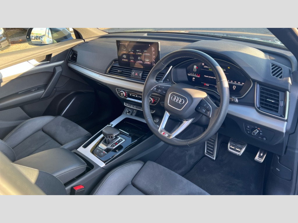 Audi Q5 40 TDI Quattro S Line 5dr S Tronic Audi connect safety and service (e-call), Audi connect with Amazon Alexa Integration, Audi drive select, Audi virtual cockpit plus with 12.3" screen and three different layout designs, Audi wireless smartphone interface, Automatic start-stop system with coasting functionality and efficiency programme, Bluetooth interface, Electro - mechanical power assisted steering, MMI navigation plus with 10.1" touch screen, Power tailgate, Reversing camera, Service interval indicator, Voice control system with Audi hotword activation "Hey Audi", Diesel particulate filter, Quattro on demand, S line sports suspension, 2 x USB charging port with aux input socket, DAB Digital radio, Acoustic windscreen, Aluminium roof rails, Audi matrix LED headlights with dynamic front and rear indicators, Auto dimming door mirrors, Auto dimming rear view mirror, Automatic headlights and windscreen wipers, Body colour bumpers, Body colour door mirrors, Body colour rear diffuser with matt aluminium silver surrounds, Body colour underbody protection, Chrome plated exhaust trims, Daytime running lights, Door sills in Selenite silver, Electric adjustable/heated/folding door mirrors, Front air inlet surrounds in aluminium, Front and rear electric windows, Front radiator grille in honeycomb design, Headlight washers, High level LED brake light, Lower bumpers painted in contrast Manhattan grey, Rear chrome trim strip below lights, Rear privacy glass and rear side windows, Rear side wing doors, Rear wiper, Roof bars, S Line badges on the front wings, S Line front and rear bumpers, S Line rear spoiler, S Line side skirts, 3 rear headrests, 40:20:40 split folding 3 rear bench seat in 2nd row with rear centre armrest, Black cloth headlining, Comfort front centre armrest, Contrast stitching on seats, steering wheel and gear lever gaiter, Deluxe 3 zone electronic climate control, Front/rear floor mats, Gear lever in black leather, Heated front seats, Height adjustable front head restraints, Height/reach adjustable steering column, Illuminated door sill trims with S logo, ISOFIX child seat mounting and top tether, Manual seat adjustment with 4-way electric lumbar support, Removable luggage compartment floor, Single front passenger seat, Stainless steel pedals, Sunvisors with vanity mirrors, High gloss pack - Q5, LED interior light pack - Q5, 3 point seatbelts on all seats, 6 airbags - Driver, front passenger, curtain and side airbags, Electrically operated child locks on rear doors, Electromechanical parking brake, Electronic stabilisation control including ABS, ASR and EDL, Front passenger airbag deactivation, Hill descent control, Hill hold assist, Multi collision brake assist, Pop-up bonnet for pedestrian protection, Pre sense city, Seat belt force limiter, Seatbelt monitoring, Tyre pressure warning, Warning triangle and first aid kit, Anti theft alarm, Anti-theft wheel bolts, Keyless Go access/ignition system, Remote central locking, Matt brushed aluminium inlays