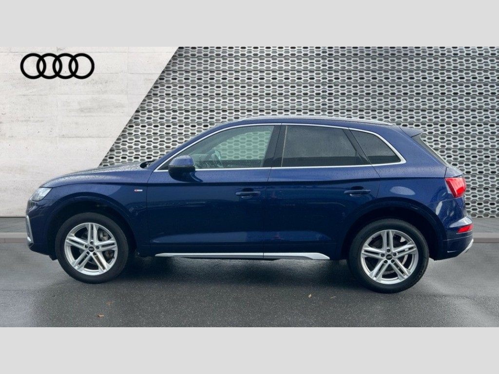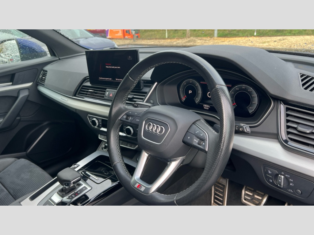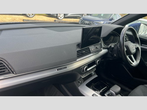 Audi Q5 40 TDI Quattro S Line 5dr S Tronic Acoustic front and rear parking sensor, Audi connect safety and service (e-call), Audi drive select, Audi virtual cockpit plus with 12.3" screen and three different layout designs, Audi wireless smartphone interface, Automatic start-stop system with coasting functionality and efficiency programme, Bluetooth interface, Camera based traffic sign recognition, Electro - mechanical power assisted steering, Lane departure warning, MMI navigation plus with 10.1" touch screen, Power tailgate, Reversing camera, Service interval indicator, Voice control system with Audi hotword activation "Hey Audi", Diesel particulate filter, Quattro on demand, S line sports suspension, 2 x USB charging port with aux input socket, 8 loudspeakers, DAB Digital radio, 3rd brake light, Acoustic windscreen, Aluminium roof rails, Auto dimming door mirrors, Auto dimming frameless rear view mirror, Automatic headlight adjustment, Automatic headlights and windscreen wipers, Body colour bumpers, Body colour door mirrors, Body colour rear diffuser with matt aluminium silver surrounds, Body colour underbody protection, Chrome plated exhaust trims, Daytime running lights, Door sills in Selenite silver, Electric adjustable/heated/folding door mirrors, Front air inlet surrounds in aluminium, Front and rear electric windows, Front radiator grille in honeycomb design, LED headlights and LED tail lights, Loading edge protection in stainless steel, Lower bumpers painted in contrast Manhattan grey, Rear chrome trim strip below lights, Rear privacy glass and rear side windows, Rear side wing doors, Rear wiper, Roof bars, S Line badges on the front wing panels, S Line front and rear bumpers, S Line rear spoiler, S Line side skirts, 3 rear headrests, 3 spoke leather multifunction steering wheel with S badging perforated leather grips, Black cloth headlining, Comfort front centre armrest, Contrast stitching on seats, steering wheel and gear lever gaiter, Deluxe 3 zone electronic climate control, Front head restraints, Front sport seats with S embossed logo, Front/rear floor mats, Gear lever in black leather, Heated front seats, Height/reach adjustable steering column, Illuminated door sill trims with S logo, Luggage compartment cover, Manual seat adjustment with 4-way electric lumbar support, Single front passenger seat, Stainless steel pedals, Sunvisors with vanity mirrors, High gloss pack - Q5, LED interior light pack - Q5, 3 point seatbelts on all seats, 6 airbags - Driver, front passenger, curtain and side airbags, Attention and drowsiness assist, Electrically operated child locks on rear doors, Electromechanical parking brake, Electronic stabilisation control including ABS, ASR and EDL, First aid kit with warning triangle and vests, Front passenger airbag deactivation, Hill descent control, Hill hold assist, ISOFIX child seat mounting for front passenger seat and ISOFIX child seat mounting with Top Tether for outer rear seats, Multi collision brake assist, Pop-up bonnet for pedestrian protection, Pre sense city, Seatbelt monitoring, Tyre pressure warning, Anti theft alarm, Anti-theft wheel bolts, Remote central locking, Remote control key with SAFELOCK and keyless go, Air vents inserts and centre console in gloss black, Matt brushed aluminium inlays, Tool kit, Tyre repair kit
