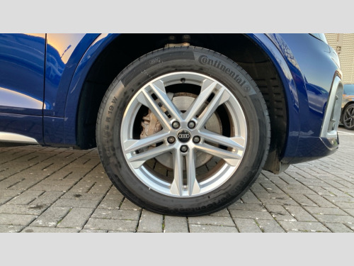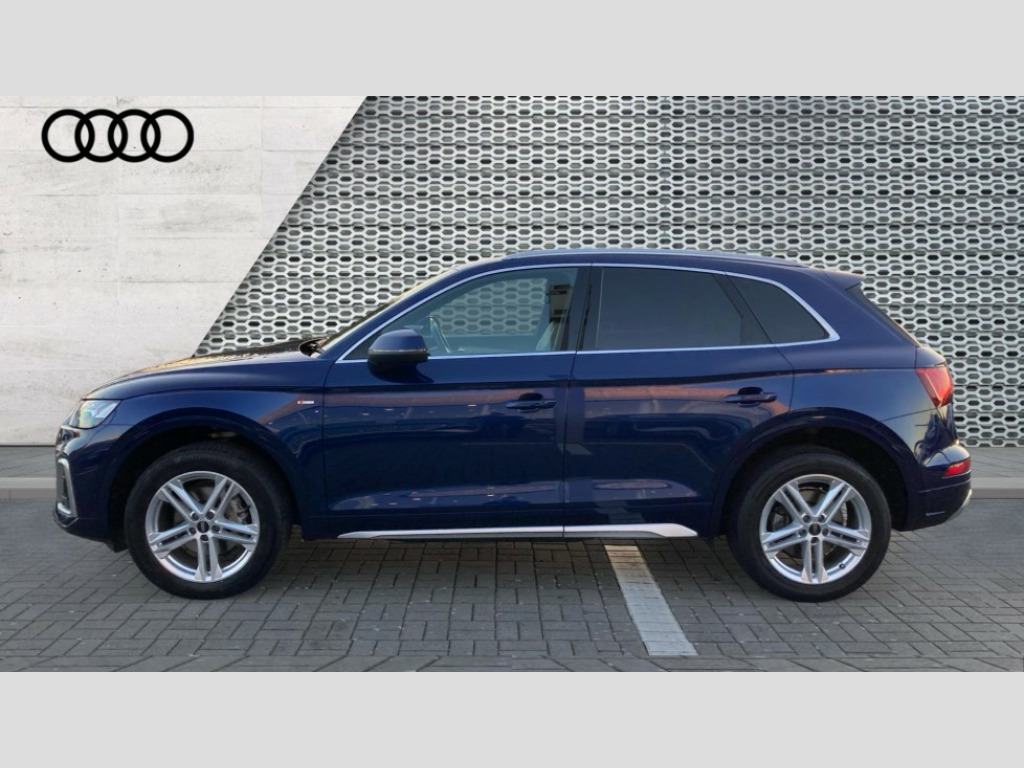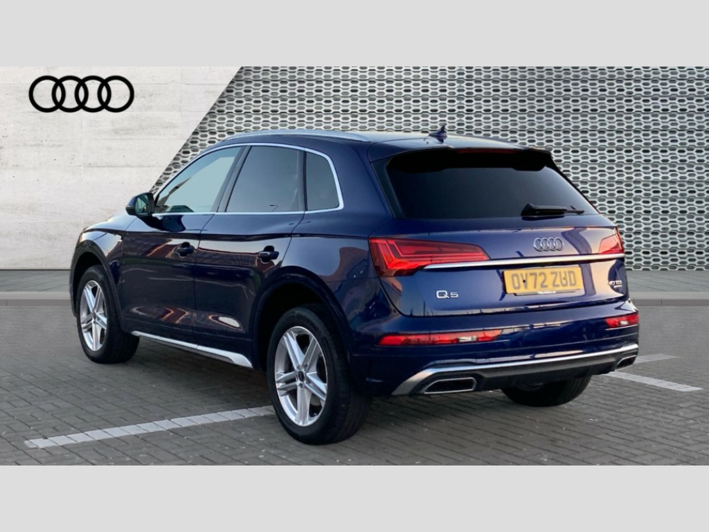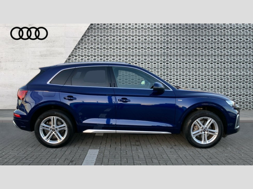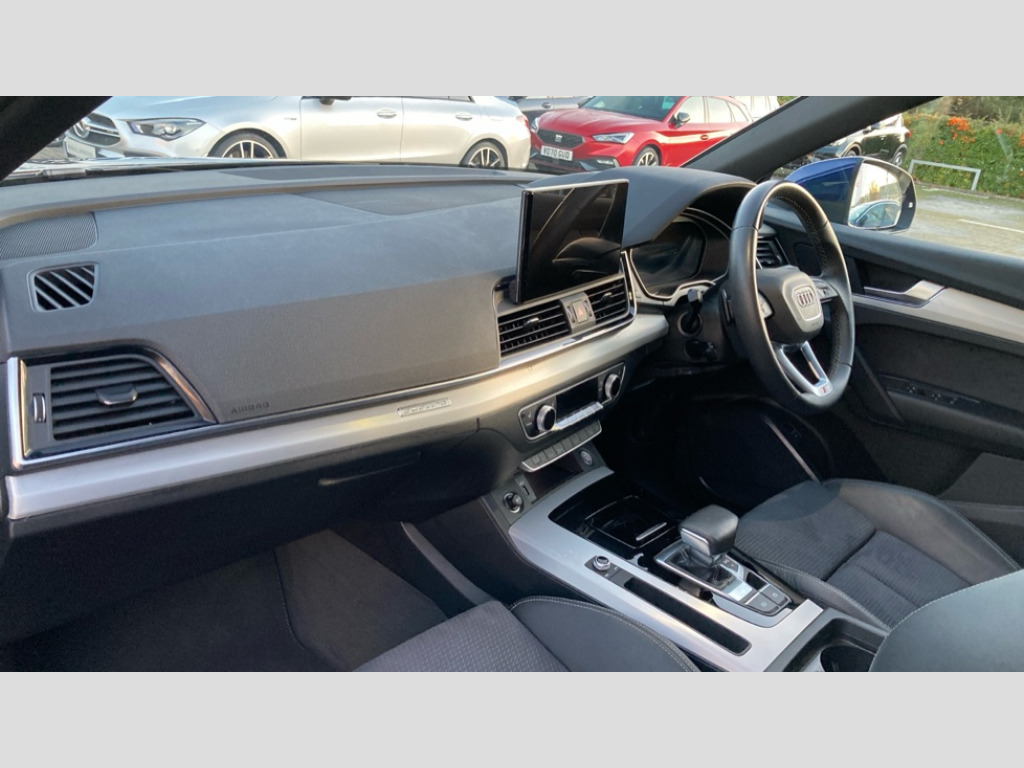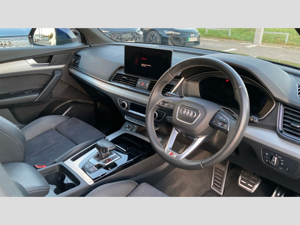Audi Q5 40 TDI Quattro S Line 5dr S Tronic Audi connect safety and service (e-call), Audi connect with Amazon Alexa Integration, Audi drive select, Audi virtual cockpit plus with 12.3" screen and three different layout designs, Audi wireless smartphone interface, Automatic start-stop system with coasting functionality and efficiency programme, Bluetooth interface, Electro - mechanical power assisted steering, MMI navigation plus with 10.1" touch screen, Power tailgate, Reversing camera, Service interval indicator, Voice control system with Audi hotword activation "Hey Audi", Diesel particulate filter, Quattro on demand, S line sports suspension, 2 x USB charging port with aux input socket, DAB Digital radio, Acoustic windscreen, Aluminium roof rails, Audi matrix LED headlights with dynamic front and rear indicators, Auto dimming door mirrors, Auto dimming rear view mirror, Automatic headlight adjustment, Automatic headlights and windscreen wipers, Body colour bumpers, Body colour door mirrors, Body colour rear diffuser with matt aluminium silver surrounds, Body colour underbody protection, Chrome plated exhaust trims, Daytime running lights, Door sills in Selenite silver, Electric adjustable/heated/folding door mirrors, Front air inlet surrounds in aluminium, Front and rear electric windows, Front radiator grille in honeycomb design, Headlight washers, High level LED brake light, Lower bumpers painted in contrast Manhattan grey, Rear chrome trim strip below lights, Rear privacy glass and rear side windows, Rear side wing doors, Rear wiper, Roof bars, S Line badges on the front wings, S Line front and rear bumpers, S Line rear spoiler, S Line side skirts, 3 rear headrests, 40:20:40 split folding 3 rear bench seat in 2nd row with rear centre armrest, Black cloth headlining, Comfort front centre armrest, Contrast stitching on seats, steering wheel and gear lever gaiter, Deluxe 3 zone electronic climate control, Front/rear floor mats, Gear lever in black leather, Heated front seats, Height adjustable front head restraints, Height/reach adjustable steering column, Illuminated door sill trims with S logo, ISOFIX child seat mounting and top tether, Luggage compartment cover, Manual seat adjustment with 4-way electric lumbar support, Removable luggage compartment floor, Single front passenger seat, Stainless steel pedals, Sunvisors with vanity mirrors, High gloss pack - Q5, LED interior light pack - Q5, 3 point seatbelts on all seats, 6 airbags - Driver, front passenger, curtain and side airbags, Electrically operated child locks on rear doors, Electromechanical parking brake, Electronic stabilisation control including ABS, ASR and EDL, Front passenger airbag deactivation, Hill descent control, Hill hold assist, Multi collision brake assist, Pop-up bonnet for pedestrian protection, Pre sense city, Seat belt force limiter, Seatbelt monitoring, Tyre pressure warning, Warning triangle and first aid kit, Anti theft alarm, Anti-theft wheel bolts, Keyless Go access/ignition system, Remote central locking, Matt brushed aluminium inlays