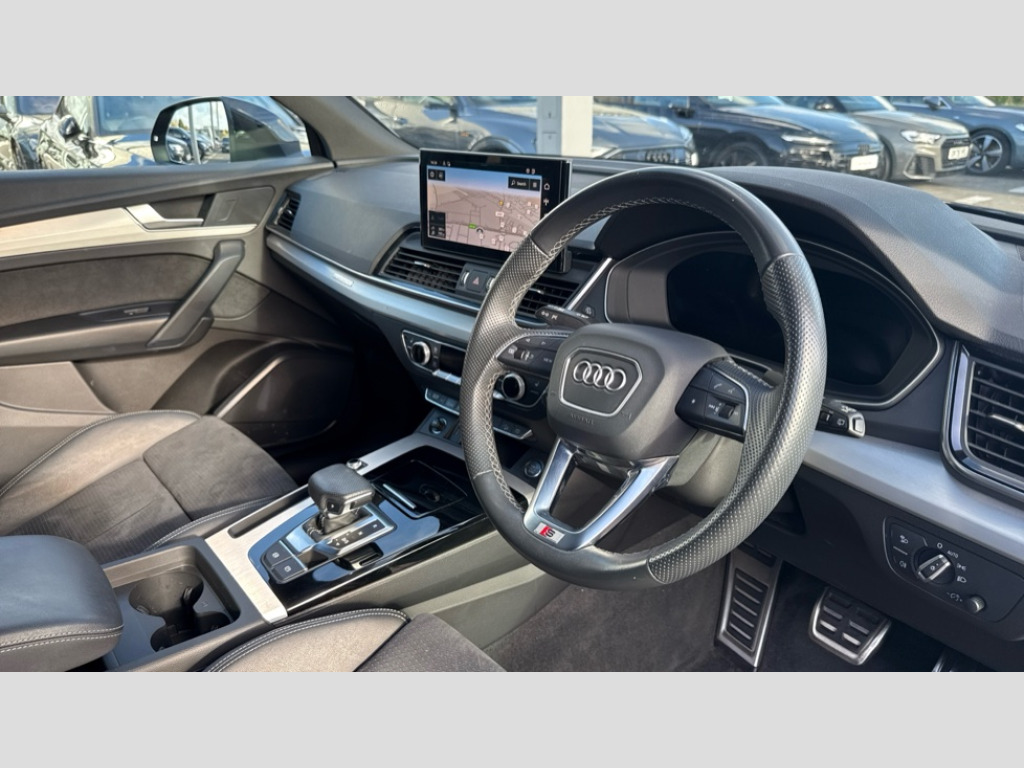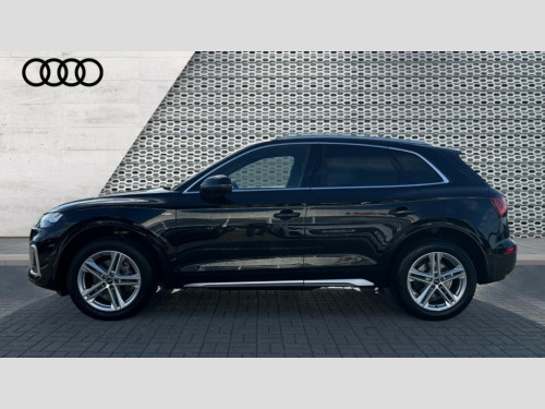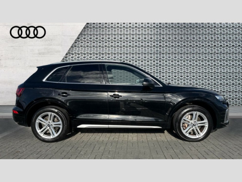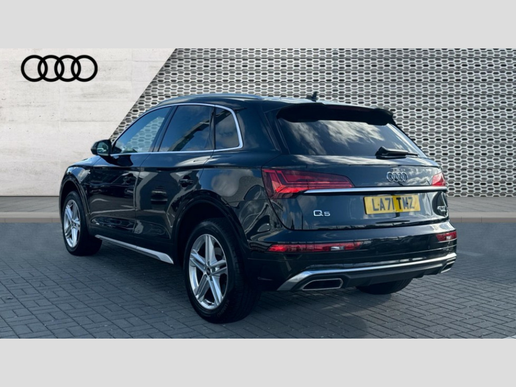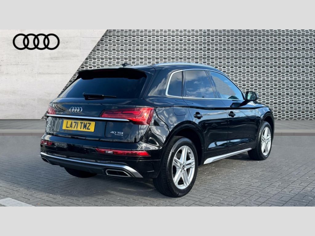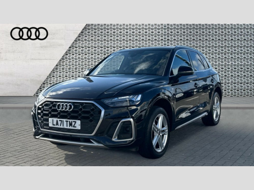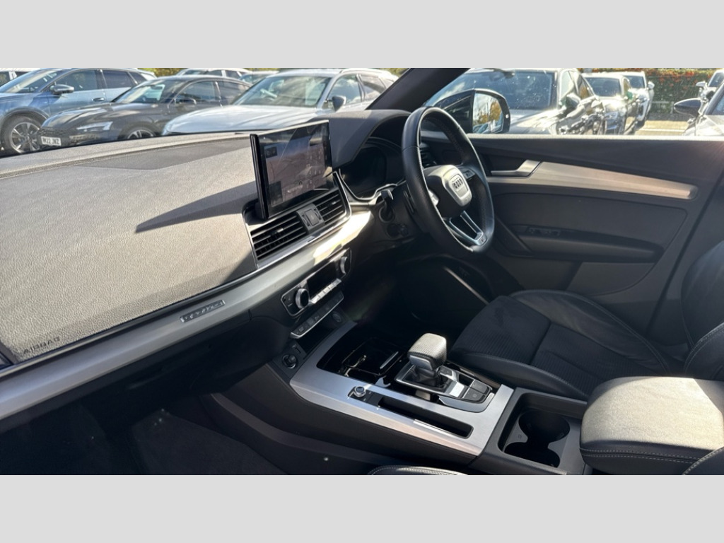 Audi Q5 40 TDI Quattro S Line 5dr S Tronic Audi connect safety and service (e-call), Audi connect with Amazon Alexa Integration, Audi drive select, Audi virtual cockpit plus with 12.3" screen and three different layout designs, Audi wireless smartphone interface, Automatic start-stop system with coasting functionality and efficiency programme, Bluetooth interface, Electro - mechanical power assisted steering, MMI navigation plus with 10.1" touch screen, Power tailgate, Reversing camera, Service interval indicator, Voice control system with Audi hotword activation "Hey Audi", Diesel particulate filter, Quattro on demand, S line sports suspension, 2 x USB charging port with aux input socket, DAB Digital radio, Acoustic windscreen, Aluminium roof rails, Audi matrix LED headlights with dynamic front and rear indicators, Auto dimming door mirrors, Auto dimming rear view mirror, Automatic headlights and windscreen wipers, Body colour bumpers, Body colour door mirrors, Body colour rear diffuser with matt aluminium silver surrounds, Body colour underbody protection, Chrome plated exhaust trims, Daytime running lights, Door sills in Selenite silver, Electric adjustable/heated/folding door mirrors, Front air inlet surrounds in aluminium, Front and rear electric windows, Front radiator grille in honeycomb design, Headlight washers, High level LED brake light, Lower bumpers painted in contrast Manhattan grey, Rear chrome trim strip below lights, Rear privacy glass and rear side windows, Rear side wing doors, Rear spoiler, Rear wiper, Roof bars, S Line badges on the front wings, S Line front and rear bumpers, S Line side skirts, 3 rear headrests, 40:20:40 split folding 3 rear bench seat in 2nd row with rear centre armrest, Black cloth headlining, Comfort front centre armrest, Contrast stitching on seats, steering wheel and gear lever gaiter, Deluxe 3 zone electronic climate control, Front/rear floor mats, Gear lever in black leather, Heated front seats, Height adjustable front head restraints, Height/reach adjustable steering column, Illuminated door sill trims with S logo, ISOFIX child seat mounting and top tether, Luggage compartment cover, Manual seat adjustment with 4-way electric lumbar support, Removable luggage compartment floor, Single front passenger seat, Stainless steel pedals, Sunvisors with vanity mirrors, High gloss pack - Q5, LED interior light pack - Q5, 3 point seatbelts on all seats, 6 airbags - Driver, front passenger, curtain and side airbags, Electrically operated child locks on rear doors, Electromechanical parking brake, Electronic stabilisation control including ABS, ASR and EDL, Front passenger airbag deactivation, Hill descent control, Hill hold assist, Multi collision brake assist, Pop-up bonnet for pedestrian protection, Pre sense city, Seat belt force limiter, Seatbelt monitoring, Tyre pressure warning, Warning triangle and first aid kit, Anti theft alarm, Anti-theft wheel bolts, Keyless Go access/ignition system, Remote central locking, Matt brushed aluminium inlays