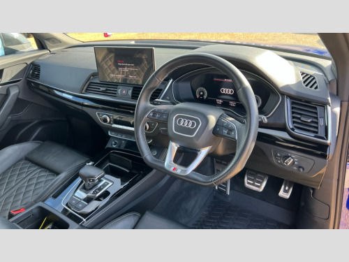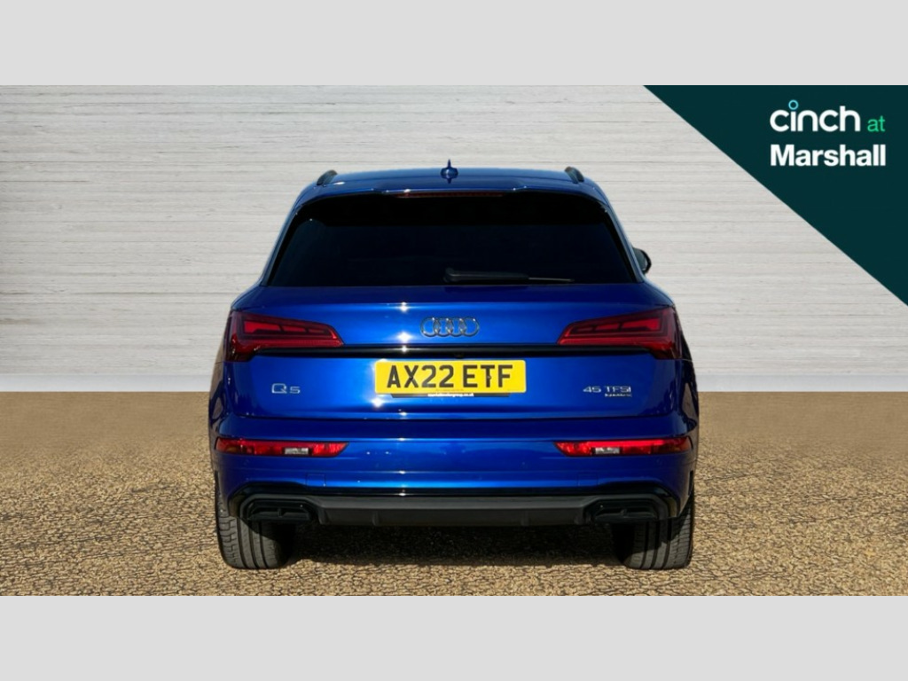 Audi Q5 45 TFSI Quattro Edition 1 5dr S Tronic Audi connect safety and service (e-call), Audi connect with Amazon Alexa Integration, Audi drive select, Audi virtual cockpit plus with 12.3" screen and three different layout designs, Audi wireless smartphone interface, Automatic start-stop system with coasting functionality and efficiency programme, Bluetooth interface, Electro - mechanical power assisted steering, MMI navigation plus with 10.1" touch screen, Power tailgate, Reversing camera, Service interval indicator, Voice control system with Audi hotword activation "Hey Audi", Quattro on demand, S line sports suspension, 2 x USB charging port with aux input socket, DAB Digital radio, Acoustic windscreen, Audi matrix LED headlights with dynamic front and rear indicators, Audi rings at front and rear in black, Audi rings decal on rear doors, Auto dimming door mirrors, Auto dimming rear view mirror, Automatic headlights and windscreen wipers, Black door mirrors, Black roof rails, Body colour bumpers, Body colour underbody protection, Chrome plated exhaust trims, Daytime running lights, Door sills in Selenite silver, Electric adjustable/heated/folding door mirrors, Front air inlet surrounds in titanium black, Front and rear electric windows, Headlight washers, High gloss black B pillar trims and triangular rear door trim, High level LED brake light, Rear chrome trim strip below lights, Rear privacy glass and rear side windows, Rear side wing doors, Rear wiper, Roof bars, S Line rear spoiler, 3 rear headrests, 4 way electric lumbar support for driver and front passenger, 40:20:40 split folding 3 rear bench seat in 2nd row with rear centre armrest, Black cloth headlining, Comfort front centre armrest, Contrast stitching on seats, steering wheel and gear lever gaiter, Deluxe 3 zone electronic climate control, Electrically adjustable front seats, Fine Nappa leather upholstery with diamond pattern contrast stitching + front sport seats with S embossed logo, Front/rear floor mats, Gear lever in black leather, Heated front seats, Height adjustable front head restraints, Height/reach adjustable steering column, Illuminated door sill trims with S logo, ISOFIX child seat mounting and top tether, Rear seat bench plus, Removable luggage compartment floor, Single front passenger seat, Stainless steel pedals, Sunvisors with vanity mirrors, Black styling package - Q5 Edition 1, Extended interior upholstery pack - Q5, Extended LED Interior multi coloured Lighting Pack - Q5, 3 point seatbelts on all seats, 6 airbags - Driver, front passenger, curtain and side airbags, Electrically operated child locks on rear doors, Electromechanical parking brake, Electronic stabilisation control including ABS, ASR and EDL, Front and rear brake calipers painted in red, Front passenger airbag deactivation, Hill descent control, Hill hold assist, Multi collision brake assist, Pop-up bonnet for pedestrian protection, Pre sense city, Seat belt force limiter, Seatbelt monitoring, Tyre pressure warning, Warning triangle and first aid kit, Anti theft alarm, Anti-theft wheel bolts, Keyless Go access/ignition system, Remote central locking, Piano black finish inlay