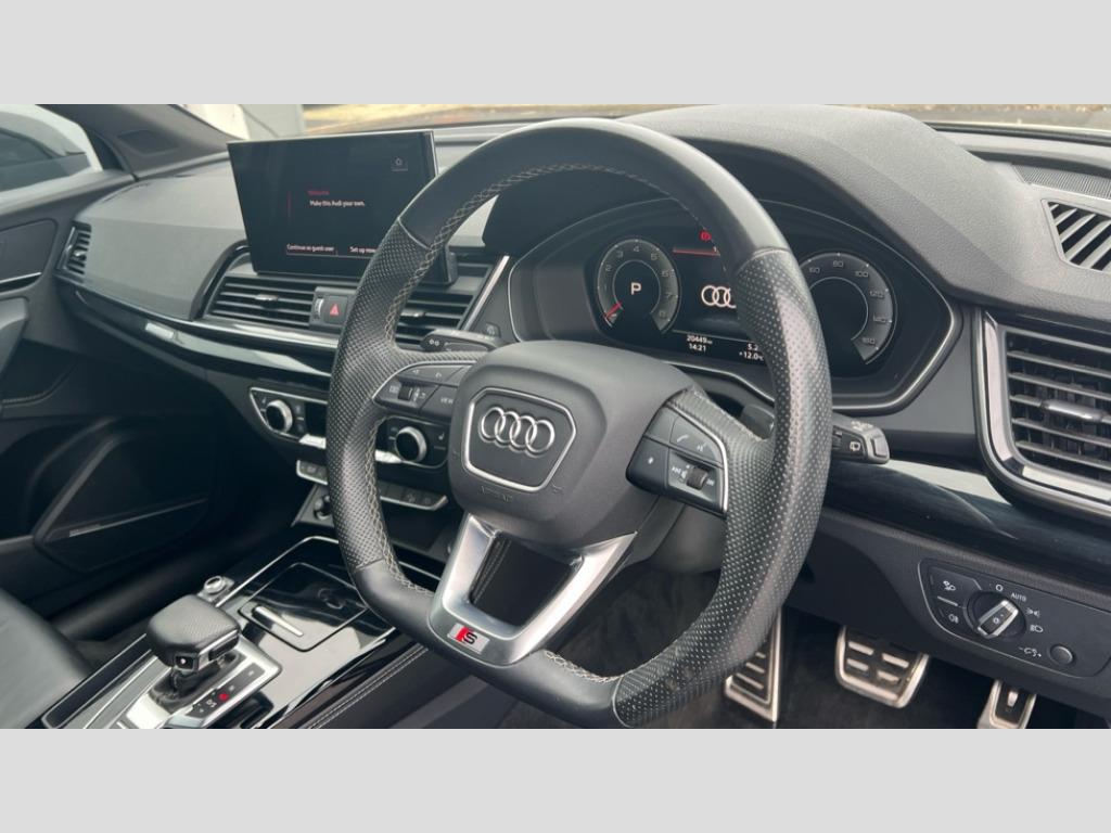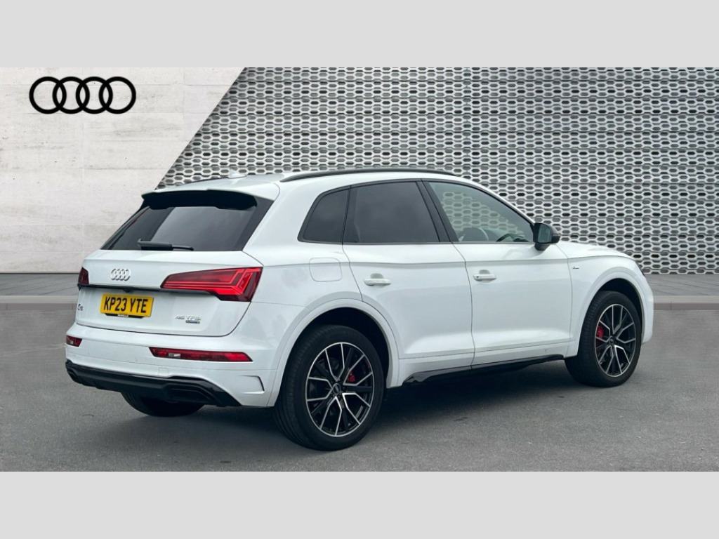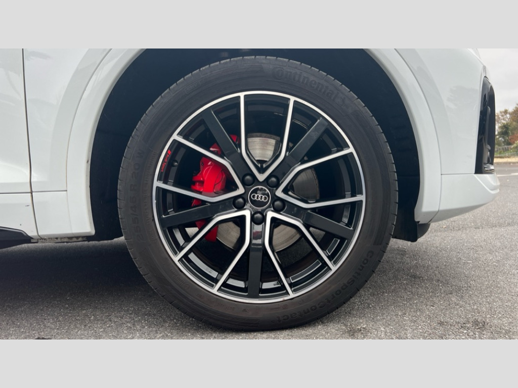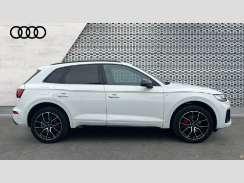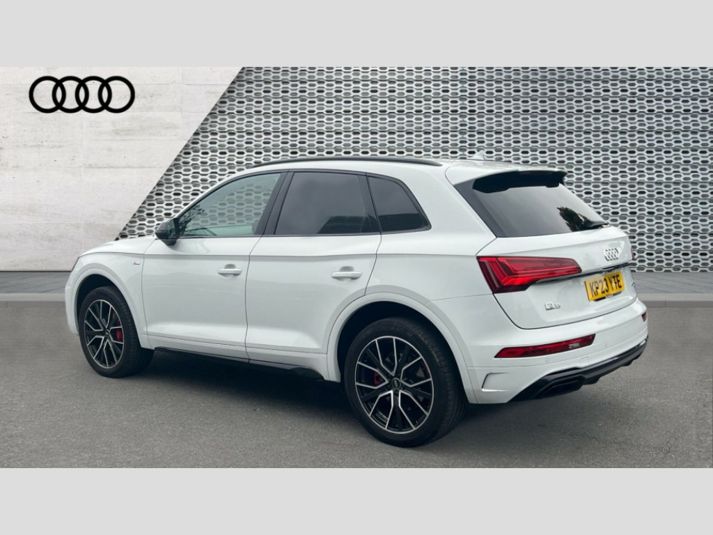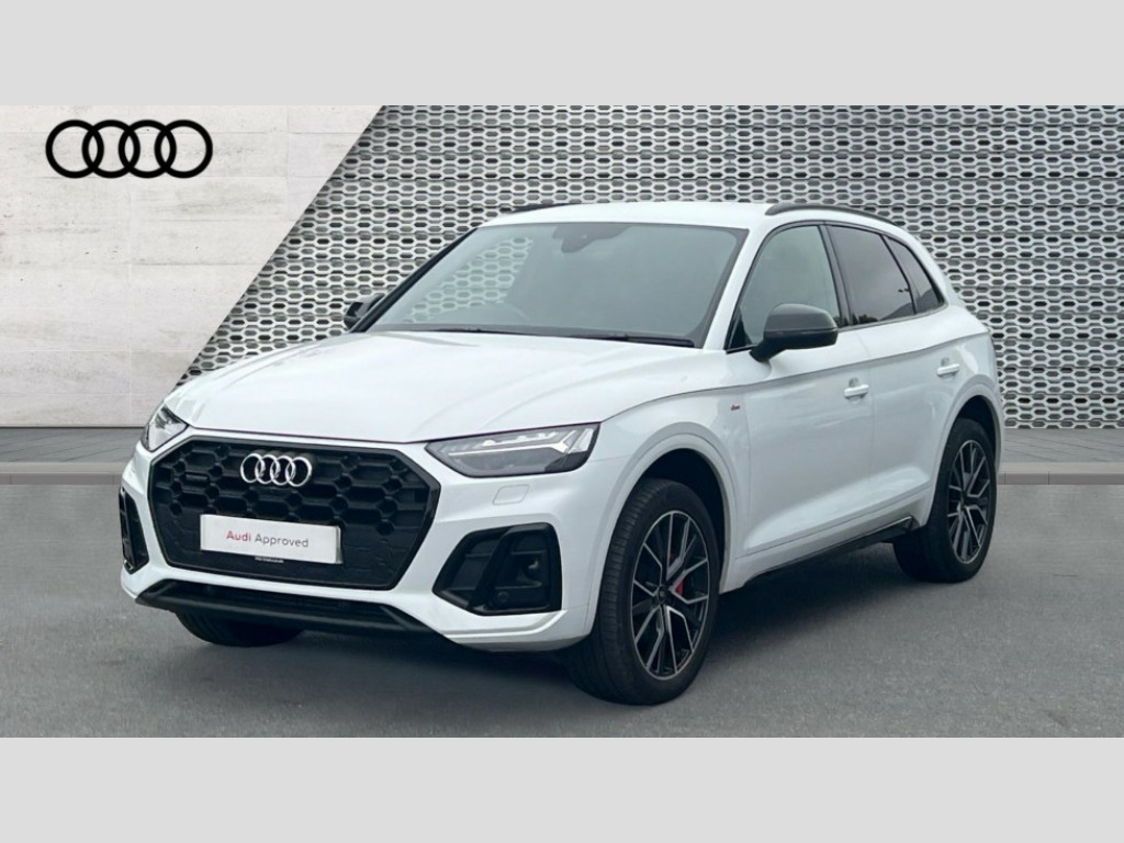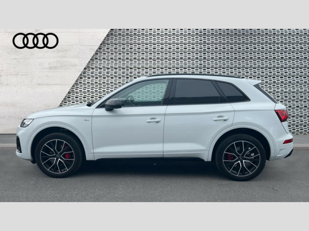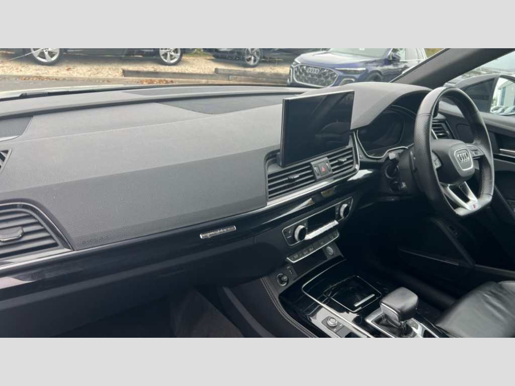 Audi Q5 45 TFSI Quattro Edition 1 5dr S Tronic 360 degree camera with top view, Acoustic front and rear parking sensor, Advanced key with electric hands free boot opening system, Audi connect safety and service (e-call), Audi connect with Amazon Alexa Integration, Audi drive select, Audi virtual cockpit plus with 12.3" screen and three different layout designs, Audi wireless smartphone interface, Automatic start-stop system with coasting functionality and efficiency programme, Bluetooth interface, Electro - mechanical power assisted steering, MMI navigation plus with 10.1" touch screen, Power tailgate, Service interval indicator, Voice control system with Audi hotword activation "Hey Audi", Quattro on demand, S line sports suspension, 2 x USB charging port with aux input socket, Bang + Olufsen sound system, DAB Digital radio, Acoustic windscreen, Audi matrix LED headlights with dynamic front and rear indicators, Audi rings at front and rear in black, Audi rings decal on rear doors, Auto dimming door mirrors, Auto dimming frameless rear view mirror, Automatic headlight adjustment, Automatic headlights and windscreen wipers, Black roof rails, Body colour bumpers, Body colour underbody protection, Chrome plated exhaust trims, Daytime running lights, Door sills in Selenite silver, Electric adjustable/heated/folding door mirrors, Front air inlet surrounds in anthracite black, Front and rear electric windows, Headlight washers, High gloss black B pillar trims and triangular rear door trim, High level LED brake light, Rear chrome trim strip below lights, Rear privacy glass and rear side windows, Rear side wing doors, Rear wiper, Roof bars, S Line rear spoiler, 3 rear headrests, 4 way electric lumbar support for driver and front passenger, 40:20:40 split folding 3 rear bench seat in 2nd row with rear centre armrest, Black cloth headlining, Comfort front centre armrest, Contrast stitching on seats, steering wheel and gear lever gaiter, Deluxe 3 zone electronic climate control, Electrically adjustable front seats, Fine Nappa leather upholstery with diamond pattern contrast stitching + front sport seats with S embossed logo, Front/rear floor mats, Gear lever in black leather, Heated front seats, Height adjustable front head restraints, Height/reach adjustable steering column, Illuminated door sill trims with S logo, Luggage compartment cover, Rear seat bench plus-adjust for forwards/backwards position/backrest angle, cupholders in the armrest, load through hatch and remote backrest release, Removable luggage compartment floor, Single front passenger seat, Stainless steel pedals, Sunvisors with vanity mirrors, Black styling package - Q5 Edition 1, Extended interior upholstery pack - Q5, Extended LED Interior multi coloured Lighting Pack - Q5, 3 point seatbelts on all seats, 6 airbags - Driver, front passenger, curtain and side airbags, Electrically operated child locks on rear doors, Electromechanical parking brake, Electronic stabilisation control including ABS, ASR and EDL, First aid kit with warning triangle and vests, Front and rear brake calipers painted in red, Front passenger airbag deactivation, Hill descent control, Hill hold assist, ISOFIX child seat mounting for front passenger seat and ISOFIX child seat mounting with Top Tether for outer rear seats, Multi collision brake assist, Pop-up bonnet for pedestrian protection, Pre sense city, Seat belt force limiter, Seatbelt monitoring, Tyre pressure warning, Anti theft alarm, Anti-theft wheel bolts, Keyless Go access/ignition system, Remote central locking, Air vents inserts and centre console in gloss black, Piano black finish inlay