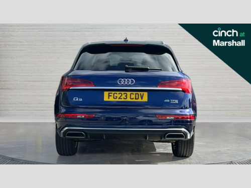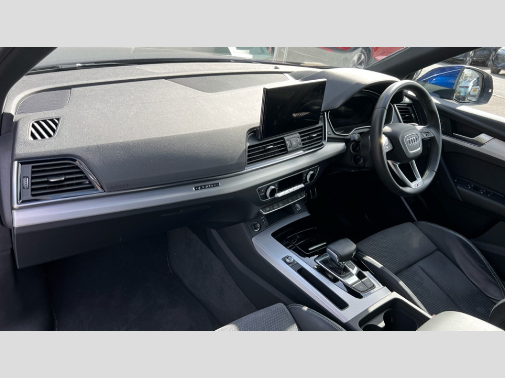 Audi Q5 45 TFSI Quattro S Line 5dr S Tronic Acoustic front and rear parking sensor, Audi connect safety and service (e-call), Audi connect with Amazon Alexa Integration, Audi drive select, Audi virtual cockpit plus with 12.3" screen and three different layout designs, Audi wireless smartphone interface, Automatic start-stop system with coasting functionality and efficiency programme, Bluetooth interface, Electro - mechanical power assisted steering, MMI navigation plus with 10.1" touch screen, Power tailgate, Reversing camera, Service interval indicator, Voice control system with Audi hotword activation "Hey Audi", Quattro on demand, S line sports suspension, 2 x USB charging port with aux input socket, 8 loudspeakers, DAB Digital radio, 3rd brake light, Acoustic windscreen, Aluminium roof rails, Audi matrix LED headlights with dynamic front and rear indicators, Auto dimming door mirrors, Auto dimming frameless rear view mirror, Automatic headlight adjustment, Automatic headlights and windscreen wipers, Body colour bumpers, Body colour door mirrors, Body colour rear diffuser with matt aluminium silver surrounds, Body colour underbody protection, Chrome plated exhaust trims, Daytime running lights, Door sills in Selenite silver, Electric adjustable/heated/folding door mirrors, Front air inlet surrounds in aluminium, Front and rear electric windows, Front radiator grille in honeycomb design, Headlight washers, Lower bumpers painted in contrast Manhattan grey, Rear chrome trim strip below lights, Rear privacy glass and rear side windows, Rear side wing doors, Rear wiper, Roof bars, S Line badges on the front wings, S Line front and rear bumpers, S Line rear spoiler, S Line side skirts, 3 rear headrests, 3 spoke leather multifunction steering wheel with S badging perforated leather grips, 40:20:40 split folding 3 rear bench seat in 2nd row with rear centre armrest, Black cloth headlining, Comfort front centre armrest, Contrast stitching on seats, steering wheel and gear lever gaiter, Deluxe 3 zone electronic climate control, Front/rear floor mats, Gear lever in black leather, Heated front seats, Height adjustable front head restraints, Height/reach adjustable steering column, Illuminated door sill trims with S logo, Luggage compartment cover, Manual seat adjustment with 4-way electric lumbar support, Removable luggage compartment floor, Single front passenger seat, Stainless steel pedals, Sunvisors with vanity mirrors, High gloss pack - Q5, LED interior light pack - Q5, 3 point seatbelts on all seats, 6 airbags - Driver, front passenger, curtain and side airbags, Electrically operated child locks on rear doors, Electromechanical parking brake, Electronic stabilisation control including ABS, ASR and EDL, First aid kit with warning triangle and vests, Front passenger airbag deactivation, Hill descent control, Hill hold assist, ISOFIX child seat mounting for front passenger seat and ISOFIX child seat mounting with Top Tether for outer rear seats, Multi collision brake assist, Pop-up bonnet for pedestrian protection, Pre sense city, Seat belt force limiter, Seatbelt monitoring, Tyre pressure warning, Anti theft alarm, Anti-theft wheel bolts, Keyless Go access/ignition system, Remote central locking, Air vents inserts and centre console in gloss black, Matt brushed aluminium inlays