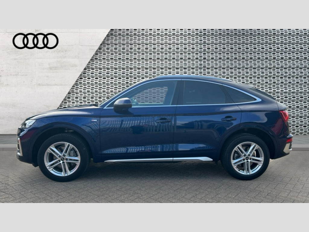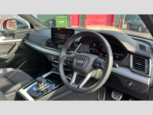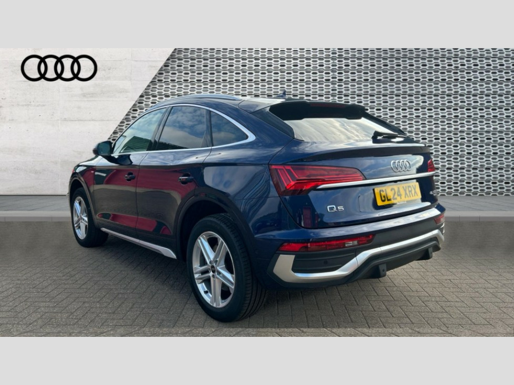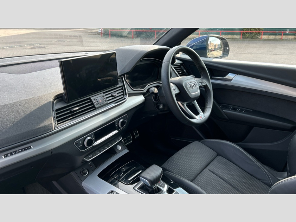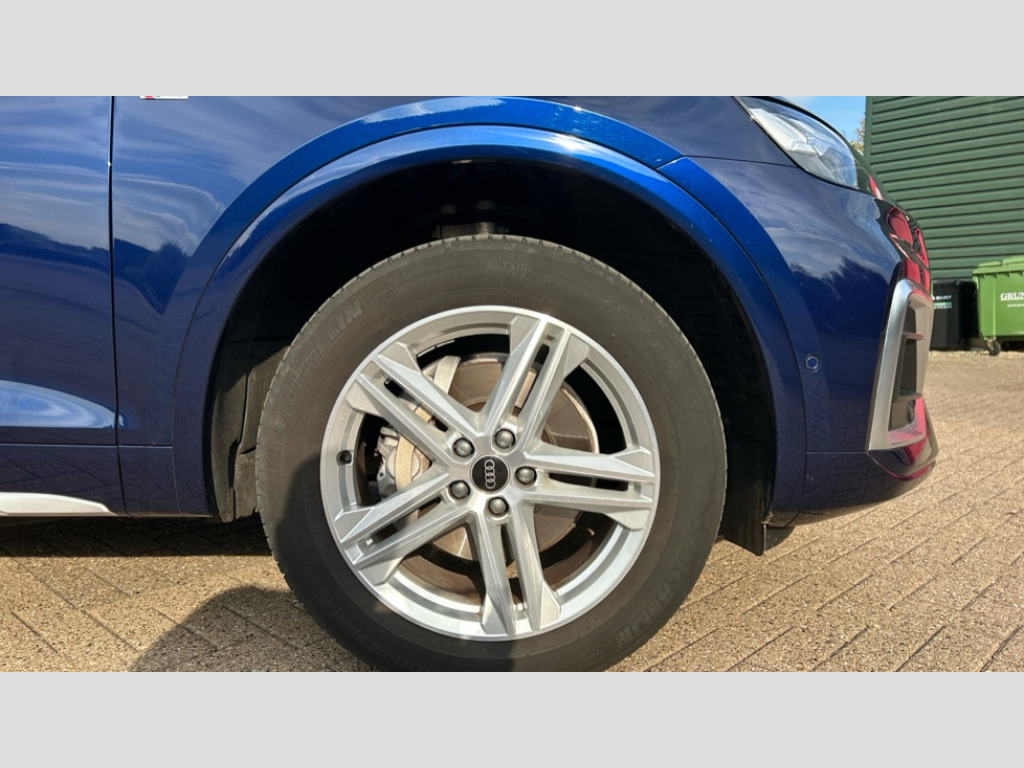 Audi Q5 45 TFSI Quattro S Line 5dr S Tronic Acoustic front and rear parking sensor, Audi connect safety and service (e-call), Audi drive select, Audi virtual cockpit plus with 12.3" screen and three different layout designs, Audi wireless smartphone interface, Automatic start-stop system with coasting functionality and efficiency programme, Bluetooth interface, Camera based traffic sign recognition, Electro - mechanical power assisted steering, Lane departure warning, MMI navigation plus with 10.1" touch screen, Power tailgate, Reversing camera, Service interval indicator, Voice control system with Audi hotword activation "Hey Audi", Quattro on demand, S line sports suspension, 2 x USB charging port with aux input socket, 8 loudspeakers, DAB Digital radio, Acoustic windscreen, Aluminium roof rails, Auto dimming door mirrors, Auto dimming frameless rear view mirror, Automatic headlight adjustment, Automatic headlights and windscreen wipers, Body colour bumpers, Body colour door mirrors, Body colour rear diffuser with matt aluminium silver surrounds, Body colour underbody protection, Chrome plated exhaust trims, Daytime running lights, Door sills in Selenite silver, Electric adjustable/heated/folding door mirrors, Front air inlet surrounds in aluminium, Front and rear electric windows, Front radiator grille in honeycomb design, LED 3rd brake light, LED headlights and LED tail lights, Loading edge protection in stainless steel, Lower bumpers painted in contrast Manhattan grey, Rear chrome trim strip below lights, Rear privacy glass and rear side windows, Rear side wing doors, Rear wiper, Roof bars, S Line badges on the front wing panels, S Line front and rear bumpers, S Line rear spoiler, S Line side skirts, 3 rear headrests, 3 spoke leather multifunction steering wheel with S badging perforated leather grips, Black cloth headlining, Comfort front centre armrest, Contrast stitching on seats, steering wheel and gear lever gaiter, Deluxe 3 zone electronic climate control, Front head restraints, Front sport seats with S embossed logo, Front/rear floor mats, Gear lever in black leather, Heated front seats, Height/reach adjustable steering column, Illuminated door sill trims with S logo, Luggage compartment cover, Manual seat adjustment with 4-way electric lumbar support, Single front passenger seat, Stainless steel pedals, Sunvisors with vanity mirrors, Top surface of the rear centre armrest in artificial leather, High gloss pack - Q5, LED interior light pack - Q5, 3 point seatbelts on all seats, 6 airbags - Driver, front passenger, curtain and side airbags, Attention and drowsiness assist, Electrically operated child locks on rear doors, Electromechanical parking brake, Electronic stabilisation control including ABS, ASR and EDL, First aid kit with warning triangle and vests, Front passenger airbag deactivation, Hill descent control, Hill hold assist, ISOFIX child seat mounting for front passenger seat and ISOFIX child seat mounting with Top Tether for outer rear seats, Multi collision brake assist, Pop-up bonnet for pedestrian protection, Pre sense city, Seatbelt monitoring, Tyre pressure warning, Anti theft alarm, Anti-theft wheel bolts, Remote central locking, Remote control key with SAFELOCK and keyless go, Air vents inserts and centre console in gloss black, Matt brushed aluminium inlays, Tool kit, Tyre repair kit