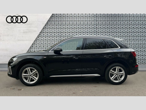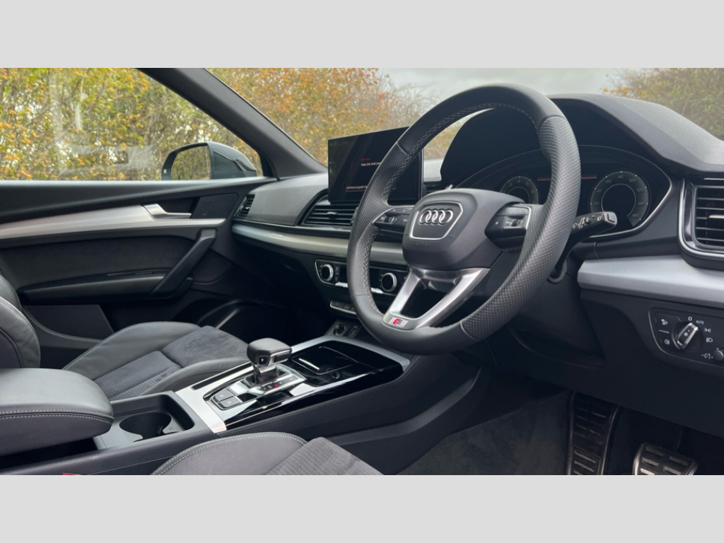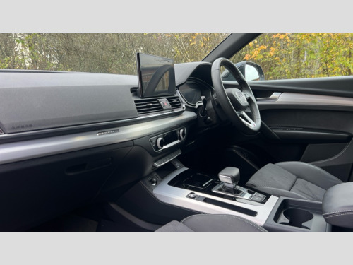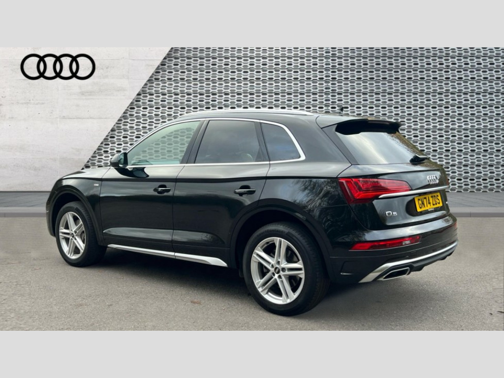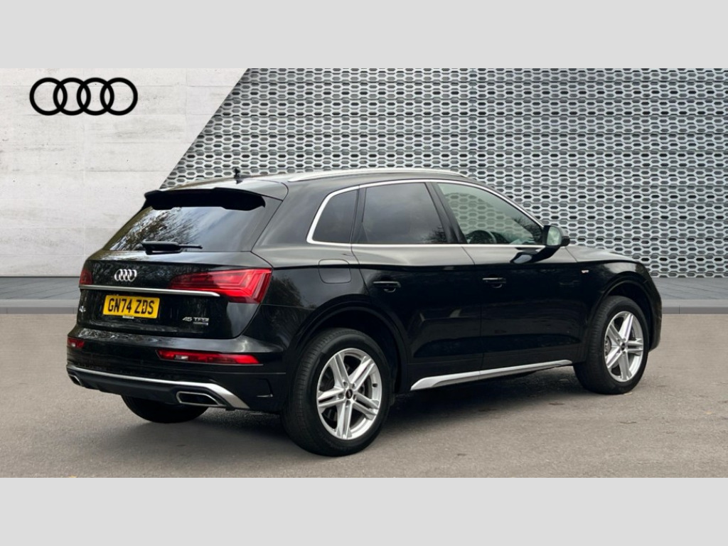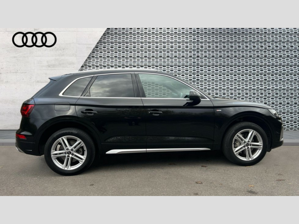 Audi Q5 45 TFSI Quattro S Line 5dr S Tronic Acoustic front and rear parking sensor, Audi connect safety and service (e-call), Audi drive select, Audi virtual cockpit plus with 12.3" screen and three different layout designs, Audi wireless smartphone interface, Automatic start-stop system with coasting functionality and efficiency programme, Bluetooth interface, Camera based traffic sign recognition, Electro - mechanical power assisted steering, Lane departure warning, MMI navigation plus with 10.1" touch screen, Power tailgate, Reversing camera, Service interval indicator, Voice control system with Audi hotword activation "Hey Audi", Quattro on demand, S line sports suspension, 2 x USB charging port with aux input socket, 8 loudspeakers, DAB Digital radio, Acoustic windscreen, Aluminium roof rails, Auto dimming door mirrors, Auto dimming frameless rear view mirror, Automatic headlight adjustment, Automatic headlights and windscreen wipers, Body colour bumpers, Body colour door mirrors, Body colour rear diffuser with matt aluminium silver surrounds, Body colour underbody protection, Chrome plated exhaust trims, Daytime running lights, Door sills in Selenite silver, Electric adjustable/heated/folding door mirrors, Front air inlet surrounds in aluminium, Front and rear electric windows, Front radiator grille in honeycomb design, LED 3rd brake light, LED headlights and LED tail lights, Loading edge protection in stainless steel, Lower bumpers painted in contrast Manhattan grey, Rear chrome trim strip below lights, Rear privacy glass and rear side windows, Rear side wing doors, Rear wiper, Roof bars, S Line badges on the front wing panels, S Line front and rear bumpers, S Line rear spoiler, S Line side skirts, 3 rear headrests, 3 spoke leather multifunction steering wheel with S badging perforated leather grips, Black cloth headlining, Comfort front centre armrest, Contrast stitching on seats, steering wheel and gear lever gaiter, Deluxe 3 zone electronic climate control, Front head restraints, Front sport seats with S embossed logo, Front/rear floor mats, Gear lever in black leather, Heated front seats, Height/reach adjustable steering column, Illuminated door sill trims with S logo, Luggage compartment cover, Manual seat adjustment with 4-way electric lumbar support, Single front passenger seat, Stainless steel pedals, Sunvisors with vanity mirrors, Top surface of the rear centre armrest in artificial leather, High gloss pack - Q5, LED interior light pack - Q5, 3 point seatbelts on all seats, 6 airbags - Driver, front passenger, curtain and side airbags, Attention and drowsiness assist, Electrically operated child locks on rear doors, Electromechanical parking brake, Electronic stabilisation control including ABS, ASR and EDL, First aid kit with warning triangle and vests, Front passenger airbag deactivation, Hill descent control, Hill hold assist, ISOFIX child seat mounting for front passenger seat and ISOFIX child seat mounting with Top Tether for outer rear seats, Multi collision brake assist, Pop-up bonnet for pedestrian protection, Pre sense city, Seatbelt monitoring, Tyre pressure warning, Anti theft alarm, Anti-theft wheel bolts, Remote central locking, Remote control key with SAFELOCK and keyless go, Air vents inserts and centre console in gloss black, Matt brushed aluminium inlays, Tool kit, Tyre repair kit
