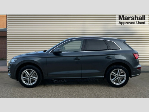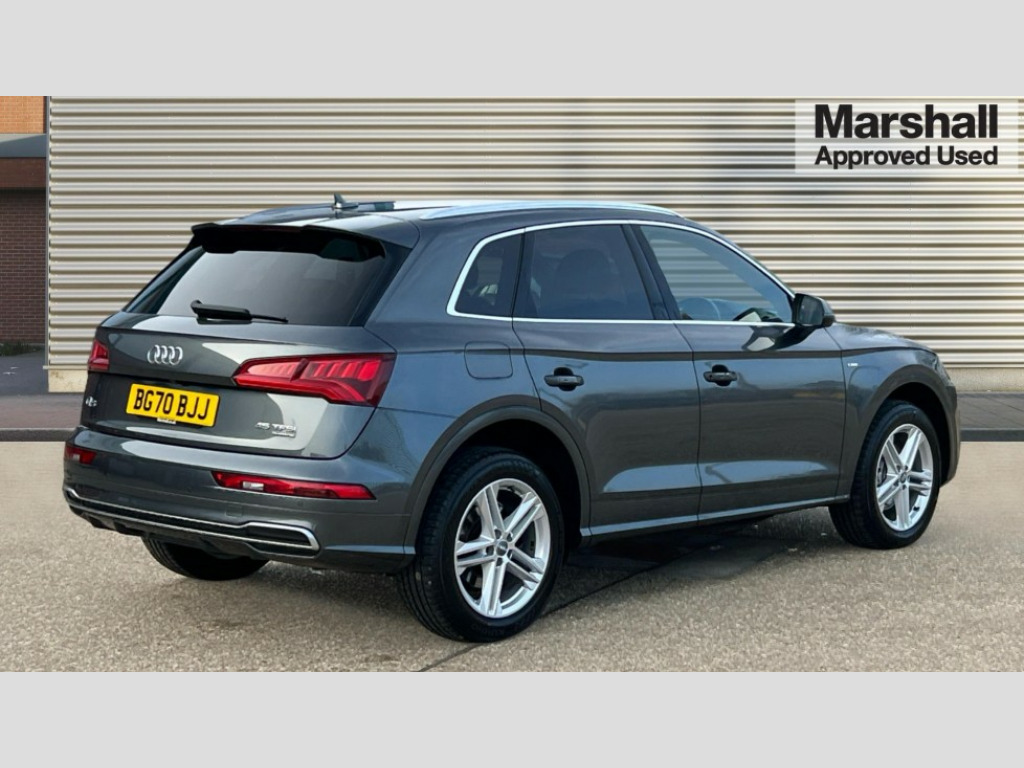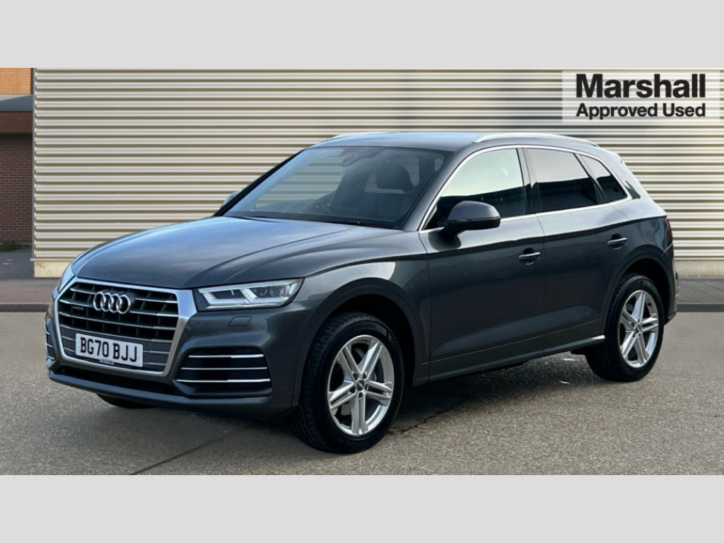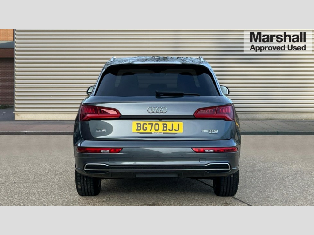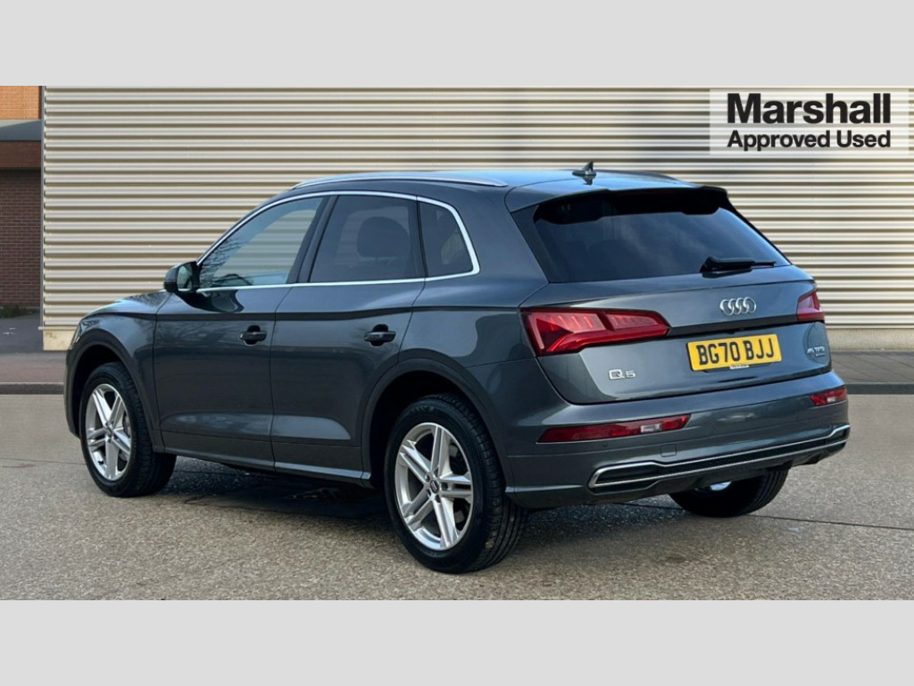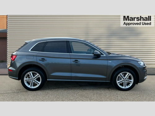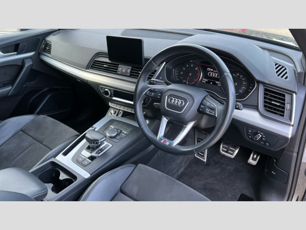 Audi Q5 45 TFSI Quattro S Line 5dr S Tronic 7" Colour driver information system, Audi connect safety and service (e-call), Audi drive select, Audi parking system plus with front and rear sensors, Audi Pre sense collision avoidance, Audi smartphone interface, Automatic start-stop system with coasting functionality and efficiency programme, Cruise control + speed limiter, Electro - mechanical power assisted steering, MMI Navigation, Mobile telephone preparation - bluetooth interface, Power tailgate, Service interval indicator, Voice control system, Dynamic suspension, Quattro on demand, 2 x USB charging port with aux input socket, 2x SD card slot, CD player, DAB Digital radio, MMI radio plus with 7" colour MMI screen and MMI controller, Acoustic windscreen, Air inlets in matt titanium black with blades in matt aluminium silver, Aluminium roof rails, Auto dimming rear view mirror, Automatic headlight levelling, Body colour bumpers, Body colour door mirrors, Body colour rear diffuser with matt aluminium silver surrounds, Body colour S Line side skirts, Body colour underbody protection, Chrome exhaust tailpipe, Electric adjustable/heated/folding door mirrors, Front and rear electric windows, High beam assistant, LED headlights with LED rear lights + dynamic rear indicators, Light and rain sensor for auto activation of lights and windscreen wipers, Loading sill protector in stainless steel, Privacy glass with front acoustic glazing, Rear wiper, S front and rear bumpers, S Line badges on the front wings, S Line rear spoiler, Twilight grey matt radiator grille with matt aluminium horizontal chrome struts, 3 rear headrests, 40:20:40 split folding rear seat with rear centre armrest, Black cloth headlining, Contrast stitching on seats, steering wheel and gear lever gaiter, Deluxe 3 zone electronic climate control, Front centre armrest, Front sport seats with S embossed logo, Front/rear floor mats, Heated front seats, Height adjustable front head restraints, Height/reach adjustable steering column, Illuminated door sill trims with S logo, ISOFIX child seat mounting and top tether, Luggage compartment carpet, Manual seat adjustment with 4-way electric lumbar support, Perforated leather gearknob, Removable luggage compartment floor, Stainless steel pedals, Sunvisors with vanity mirrors, Trunk roller cover, High gloss pack - Q5, Non Smokers pack, 3 point seatbelts on all seats, 6 airbags - Driver, front passenger, curtain and side airbags, Electromechanical parking brake, Electronic stabilisation control including ABS, ASR and EDL, Front passenger airbag deactivation, Hill descent control, Hill hold assist, Multi collision brake assist, Pop-up bonnet for pedestrian protection, Pre sense city, Seat belt force limiter, Seatbelt monitoring, Tyre pressure warning, Warning triangle and first aid kit, Anti theft alarm, Anti-theft wheel bolts, Keyless Go access/ignition system, Remote central locking, Matt brushed aluminium inlays, Tool kit