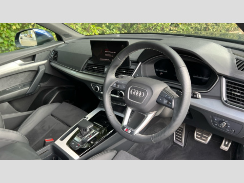 Acoustic front and rear parking sensor, Audi connect safety and service (e-call), Audi drive select, Audi virtual cockpit plus with 12.3" screen and three different layout designs, Audi wireless smartphone interface, Automatic start-stop system with coasting functionality and efficiency programme, Bluetooth interface, Camera based traffic sign recognition, Electro - mechanical power assisted steering, Lane departure warning, MMI navigation plus with 10.1" touch screen, Power tailgate, Reversing camera, Service interval indicator, Voice control system with Audi hotword activation "Hey Audi", Quattro on demand, S line sports suspension, 2 x USB charging port with aux input socket, DAB Digital radio, Acoustic windscreen, Aluminium roof rails, Auto dimming door mirrors, Auto dimming frameless rear view mirror, Automatic headlight adjustment, Automatic headlights and windscreen wipers, Body colour bumpers, Body colour door mirrors, Body colour rear diffuser with matt aluminium silver surrounds, Body colour underbody protection, Chrome plated exhaust trims, Daytime running lights, Door sills in Selenite silver, Electric adjustable/heated/folding door mirrors, Front air inlet surrounds in aluminium, Front and rear electric windows, Front radiator grille in honeycomb design, LED 3rd brake light, LED rear lights, Loading edge protection in stainless steel, Lower bumpers painted in contrast Manhattan grey, Rear chrome trim strip below lights, Rear privacy glass and rear side windows, Rear side wing doors, Rear wiper, Roof bars, S Line badges on the front wing panels, S Line front and rear bumpers, S Line rear spoiler, S Line side skirts, 3 rear headrests, 3 spoke leather multifunction steering wheel with S badging perforated leather grips, Black cloth headlining, Comfort front centre armrest, Contrast stitching on seats, steering wheel and gear lever gaiter, Deluxe 3 zone electronic climate control, Front head restraints, Front sport seats with S embossed logo, Front/rear floor mats, Gear lever in black leather, Heated front seats, Height/reach adjustable steering column, Illuminated door sill trims with S logo, Luggage compartment cover, Manual seat adjustment with 4-way electric lumbar support, Single front passenger seat, Stainless steel pedals, Sunvisors with vanity mirrors, Top surface of the rear centre armrest in artificial leather, High gloss pack - Q5, Technology pack - Q5 SUV/Sportback, 3 point seatbelts on all seats, 6 airbags - Driver, front passenger, curtain and side airbags, Attention and drowsiness assist, Electrically operated child locks on rear doors, Electromechanical parking brake, Electronic stabilisation control including ABS, ASR and EDL, First aid kit with warning triangle and vests, Front passenger airbag deactivation, Hill descent control, Hill hold assist, ISOFIX child seat mounting for front passenger seat and ISOFIX child seat mounting with Top Tether for outer rear seats, Multi collision brake assist, Pop-up bonnet for pedestrian protection, Pre sense city, Seatbelt monitoring, Tyre pressure warning, Anti theft alarm, Anti-theft wheel bolts, Remote central locking, Remote control key with SAFELOCK and keyless go, Air vents inserts and centre console in gloss black, Matt brushed aluminium inlays, Tool kit, Tyre repair kit