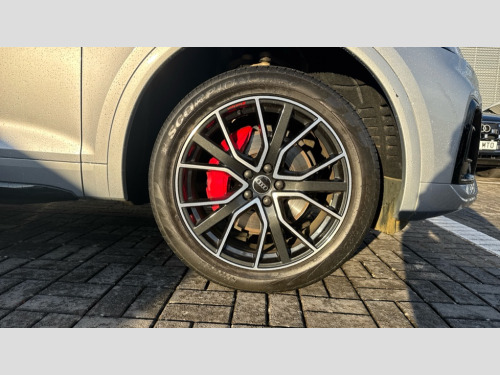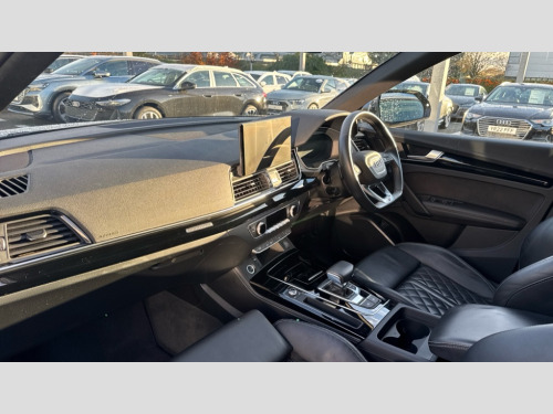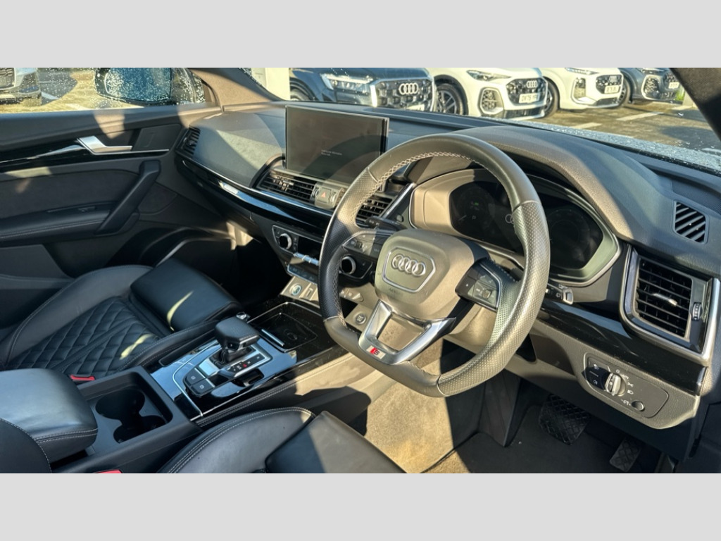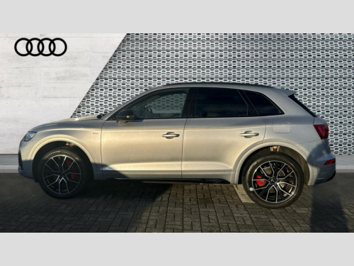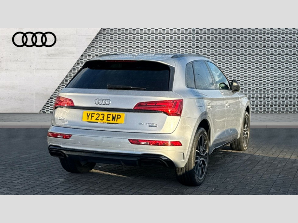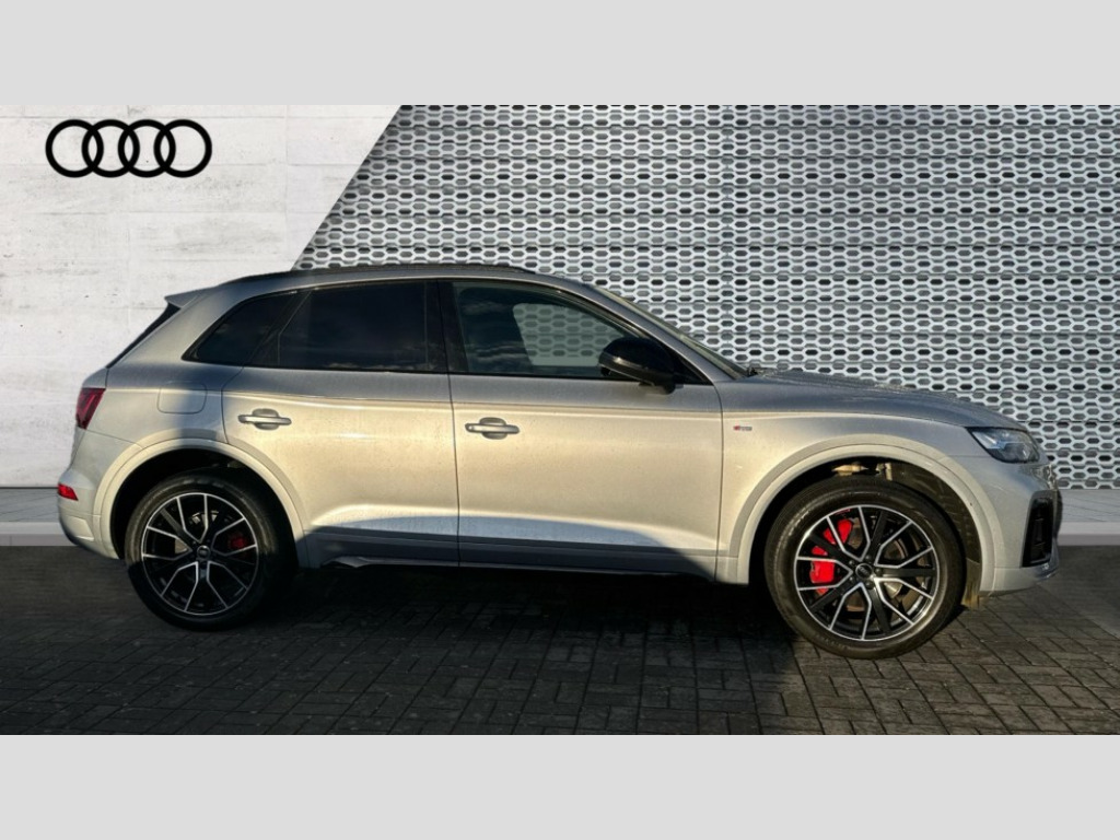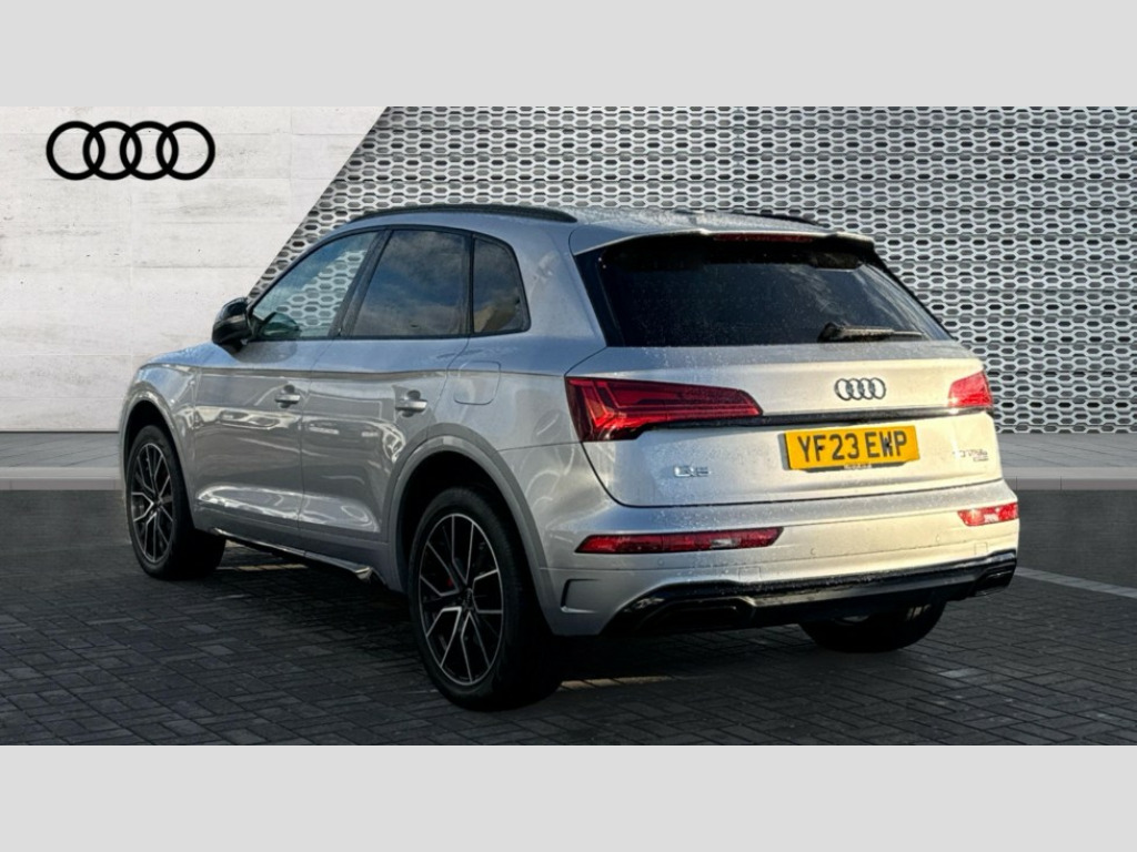 Audi Q5 50 TFSI e Quattro Edition 1 5dr S Tronic Acoustic front and rear parking sensor, Audi connect safety and service (e-call), Audi connect with Amazon Alexa Integration, Audi drive select, Audi virtual cockpit with 12.3" screen with specific display, Audi wireless smartphone interface, Automatic start-stop system with coasting functionality and efficiency programme, Bluetooth interface, Electro - mechanical power assisted steering, MMI navigation plus with 10.1" touch screen, Power tailgate, Reversing camera, Service interval indicator, Voice control system with Audi hotword activation "Hey Audi", 3 pin 10 amp domestic charging cable, 7.4 kW onboard charger, Dynamic suspension, Industrial connector CEE 32A, 230V, Quattro on demand, Type 2 mode 3 22kW 32 amp charging cable, Type 2 socket for AC charging, 2 x USB charging port with aux input socket, 8 loudspeakers, DAB Digital radio, Acoustic windscreen, Audi matrix LED headlights with dynamic front and rear indicators, Audi rings at front and rear in black, Audi rings decal on rear doors, Auto dimming door mirrors, Auto dimming frameless rear view mirror, Automatic headlight adjustment, Automatic headlights and windscreen wipers, Black roof rails, Body colour bumpers, Body colour underbody protection, Chrome plated exhaust trims, Daytime running lights, Door sills in Selenite silver, Electric adjustable/heated/folding door mirrors, Front air inlet surrounds in anthracite black, Front and rear electric windows, Headlight washers, High gloss black B pillar trims and triangular rear door trim, High level LED brake light, Rear chrome trim strip below lights, Rear privacy glass and rear side windows, Rear side wing doors, Rear wiper, Roof bars, S Line rear spoiler, 3 rear headrests, 3 seater rear seat bench, 4 way electric lumbar support for driver and front passenger, Black cloth headlining, Comfort front centre armrest, Contrast stitching on seats, steering wheel and gear lever gaiter, Deluxe 3 zone electronic climate control, Electrically adjustable front seats, Fine Nappa leather upholstery with diamond pattern contrast stitching + front sport seats with S embossed logo, Front/rear floor mats, Gear lever in black leather, Heated front seats, Height adjustable front head restraints, Height/reach adjustable steering column, Illuminated door sill trims with S logo, Luggage compartment cover, Rear seat bench plus-adjust for forwards/backwards position/backrest angle, cupholders in the armrest, load through hatch and remote backrest release, Single front passenger seat, Sunvisors with vanity mirrors, Trunk roller cover, Black styling package - Q5 Edition 1, Extended interior upholstery pack - Q5, Extended LED Interior multi coloured Lighting Pack - Q5, 3 point seatbelts on all seats, 6 airbags - Driver, front passenger, curtain and side airbags, Electrically operated child locks on rear doors, Electromechanical parking brake, Electronic stabilisation control including ABS, ASR and EDL, First aid kit with warning triangle and vests, Front and rear brake calipers painted in red, Front passenger airbag deactivation, Hill descent control, Hill hold assist, ISOFIX child seat mounting for front passenger seat and ISOFIX child seat mounting with Top Tether for outer rear seats, Multi collision brake assist, Pop-up bonnet for pedestrian protection, Pre sense city, Seat belt force limiter, Seatbelt monitoring, Tyre pressure warning, Anti theft alarm, Anti-theft wheel bolts, Keyless Go access/ignition system, Remote central locking, Air vents inserts and centre console in gloss black, Piano black finish inlay, Tool kit, Tyre repair kit
