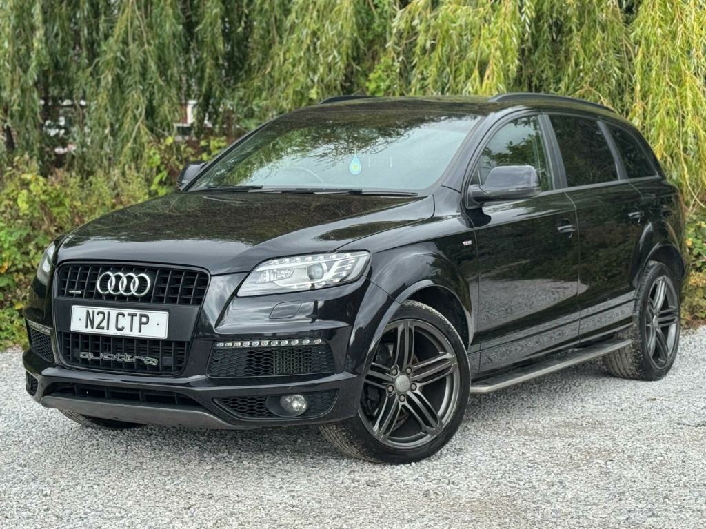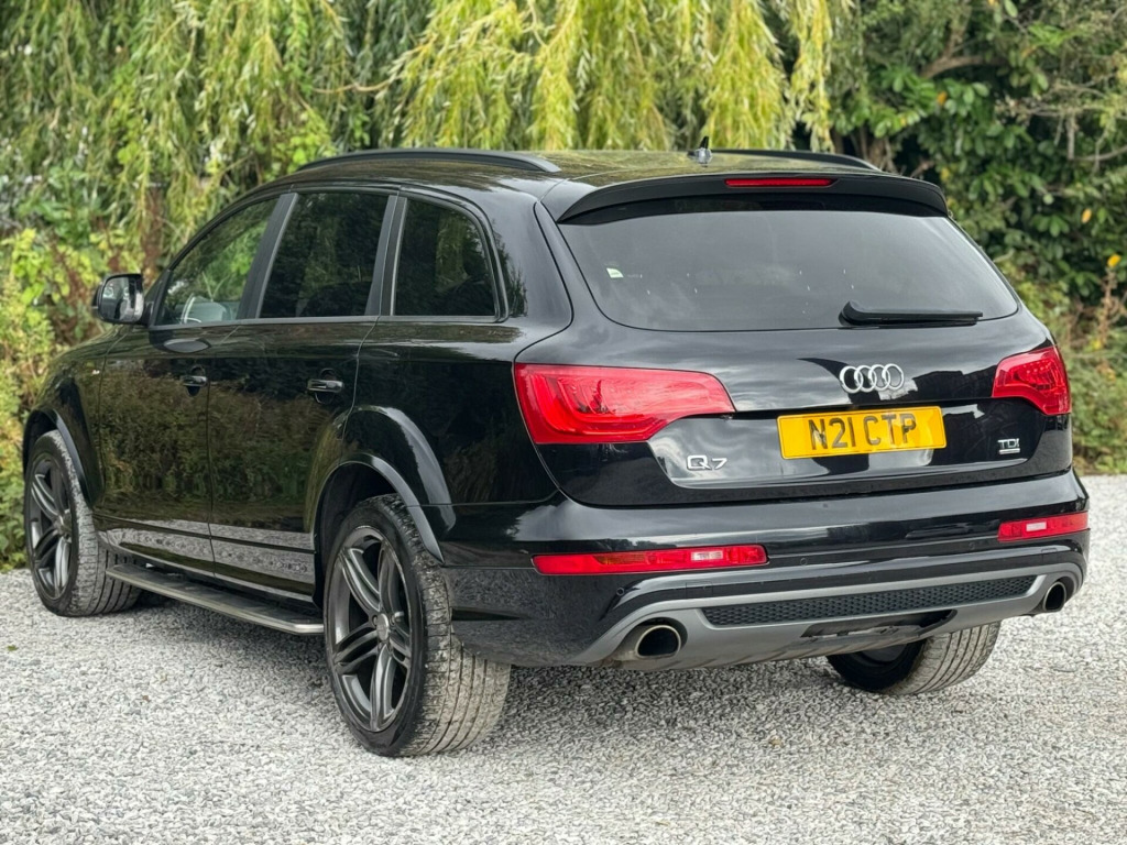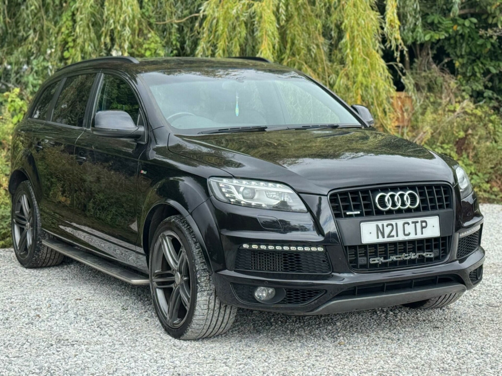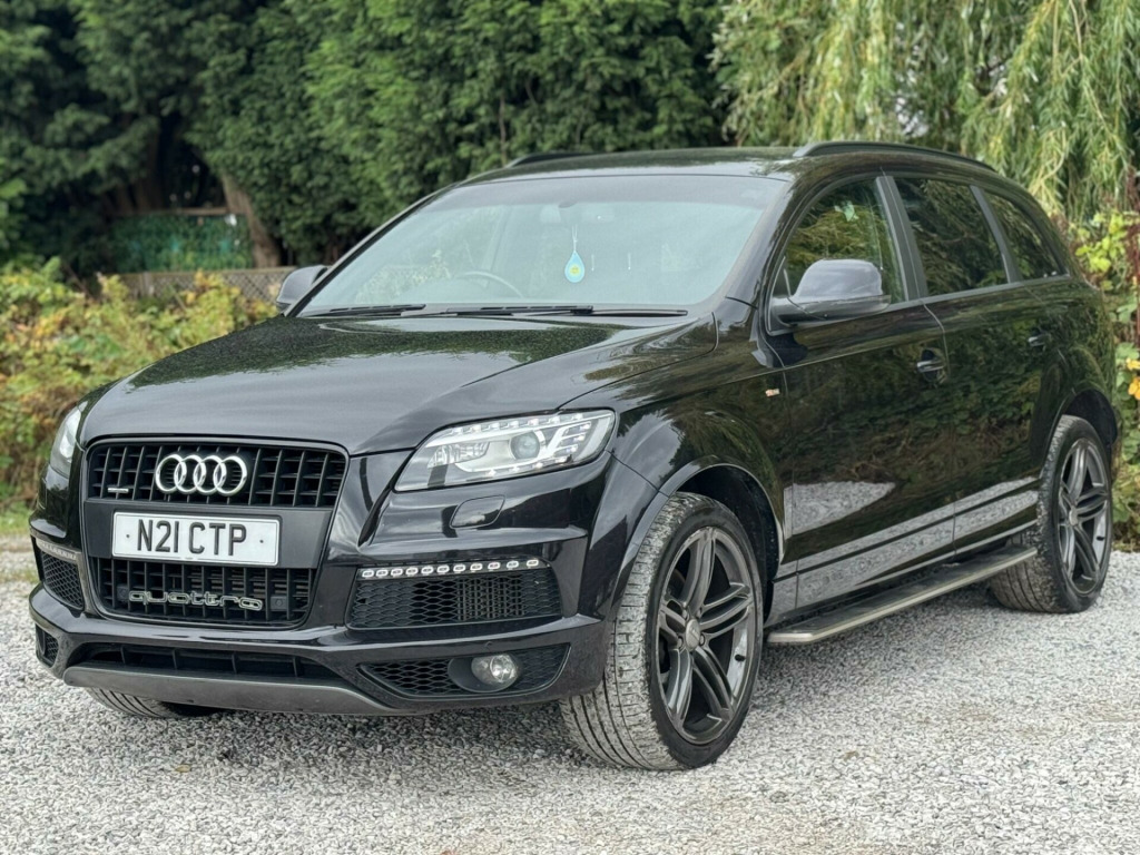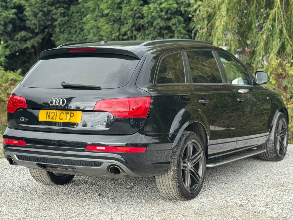 2 KEYSSERVICE HISTORY - 5 SERVICESEquipment:Navigation HDDParking Sensor(s)Climate ControlLeather Trim7 Seats21'' Alloy WheelsPrivacy GlassThis 2013 Audi Q7 TDI V6 S line Plus is presented in excellent condition, offering a premium driving experience. As a 7 seater, this Four Wheel Drive model boasts a powerful 3.0L Diesel engine, ensuring robust performance. The S line Plus trim level signifies a higher specification, and this particular vehicle comes equipped with Bi Xenon Plus headlights for superior visibility. Parking is made effortless thanks to the Audi Parking System Rear with Acoustic Indicators, front parking sensors, and the advanced parking system which includes a rear view camera. Inside, you can enjoy the comfort of Dual Zone Electronic Climate Control, ensuring a pleasant environment for all occupants.The Audi Q7 TDI V6 S line Plus offers several advantages that set it apart. Its impressive acceleration, reaching 0-62mph in just 7.8 seconds, demonstrates its dynamic capability. Furthermore, the generous boot space provides ample room for luggage or shopping, making it a practical choice for families. The vehicle also benefits from a low insurance group, which can contribute to lower running costs. With a substantial towing weight of 3200 kg, this Q7 is well suited for towing caravans or trailers. di exclusive piping, adaptive cruise control, cd changer, 21in alloy wheels - 7-double-spoke design, digital tv reception, tyre pressure loss indicator, 21in alloy wheels - 5-segment-spoke design titanium finish, black styling package, verano leather - sports seats - black, 12v power socket - centre console, 12v power socket - luggage compartment, 12v power socket - rear x2, 21in alloy wheels - 5-segment-spoke design, 3d and topographical mapping, 6.5in display screen, abs - anti-lock braking system, ami - audi music interface, aux-in socket, active door reflectors, adaptive air suspension, advanced 3d building display, advanced speech recognition, air vent sleeves - aluminium look, airbags - driver, airbags - front passenger, airbags - front side system, airbags - sideguard curtain, alarm - thatcham category 1, aluminium roof rails, ambient lighting - centre console, anti theft locking wheel bolts, audi parking system advanced with rear view camera, audi parking system rear with acoustic indicators, auto-dimming rear-view mirror, automatic wipers with rain sensor, bumpers - contrasting, cd/radio, cables x2 - mp3 connection including ipod, car jack, cloth headlining in black, collapsible spare wheel, colour drivers information system - dis, comfort front centre armrest, cruise control, cup holders - centre console, cup holders in rear armrest x2, cupholders in front centre armrest, cupholders x2 in third row, display screen colour 7in high resolution, door mirrors - heated-electrically adjustable-folding, door sill trims - s line, door lock switches on all 4 doors, double load floor, dual-zone electronic climate control, ebd - electronic brakeforce distribution, edl - electronic differential lock, esp - electronic stability programme, efficiency program in the drivers information system - dis, electric windows - front and rear, electrically adjustable 4-way lumbar support, fm-am radio, first aid kit, folding storage compartment in front centre armrest, front door exit lights, front fog lights, front passenger airbag deactivation switch, front and rear floor mats, front and rear footwell lighting, hard drive - 40gb, headlights - automatic adjustment, headlights - bi-xenon plus, headlights - coming-leaving home function, headlights - light sensor, headlights washers, heated front seats, isofix - front passenger - second and third row seats, illuminated air vents in b-pillar, illuminated ashtray in rear, illuminated vanity mirrors, inlays - matt brushed aluminium, led daytime running lights, led indicators, led rear lights, lighting package, luggage compartment - net, luggage compartment - side net, luggage compartment cover, mmi radio plus with dsp sound system, mp3 and wma compatible cd player, mobile telephone preparation - high with audi connect, parking brake - foot operated, parking sensors - front, pollen filter, power operated tailgate, power steering - servotronic speed-dependent, privacy glass, rear centre armrest, rear door exit lights, remote boot release, remote central locking, s line badge on wings, s line badging, s line body styling, sd card reader x2, sdhc card reader x2, satellite navigation system - hdd based, seats - backrests - storage net, seats - front electric adjustment, seats - front electric height adjustment, side impact protection, single cd-dvd player, split-folding rear seats, stainless steel running boards, steering column - rake and reach adjustment, steering wheel - 3-spoke leather-multi-function-shift paddles, steering wheel - gear shift paddles, steering wheel - multi-function, storage - glasses holder in roof module, tp memo - automatically saves traffic news, technology package - high, through-load facility, tool kit, trailer stabilisation system via the electronic stability programme, voice dialogue system, warning triangle, window surrounds - aluminium