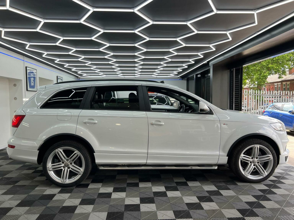 Registered in 2013, this Audi Q7 S line Plus combines power, luxury, and practicality. Its powered by a refined 3.0L diesel engine with four-wheel drive, delivering confident performance in all conditions. With just 69,000 miles and only two previous owners, it has clearly been well cared for. This vehicle is also enhanced by the Audi Exclusive Line and a host of premium optional extras. Inside, enjoy heated front and outer rear seats, dual-zone electronic climate control, and a spacious seven-seat layout. For added convenience, this Q7 features front and rear parking sensors, Audi Parking System Advanced with reversing camera, and an electric tailgate. Visibility is enhanced by Bi-Xenon Plus headlights, while a Colour Drivers Information System (DIS) keeps you informed behind the wheel. Standout factory extras include a panoramic sunroof with dark tint, 21-inch titanium 5-segment-spoke alloy wheels, and stainless steel running boards. It also features metallic paint, black styling pack, privacy glass, and the Audi Music Interface. This Q7 doesnt just offer style—its also incredibly practical. With its massive boot, 7-seat configuration, and an impressive towing capacity of 3,200 kg, its ready for family life, road trips, or caravan getaways. It accelerates from 0-62mph in just 7.8 seconds, combining performance and luxury in a way few SUVs can match. Supplied with a fresh MOT, recent service, and a warranty for added peace of mind. Call us to confirm your interest! We accept cash, bank transfer or finance and are proud to be SAF & FCA approved. We operate on a first-come, first-served basis unless you book a same-day appointment. Next-day appointments can only be secured by leaving a non-refundable deposit. Please check availability with us to avoid disappointment.???? Location: 92-100 Darlaston Road, Walsall, WS2 9RE ???? Contact us: 01922 633004.