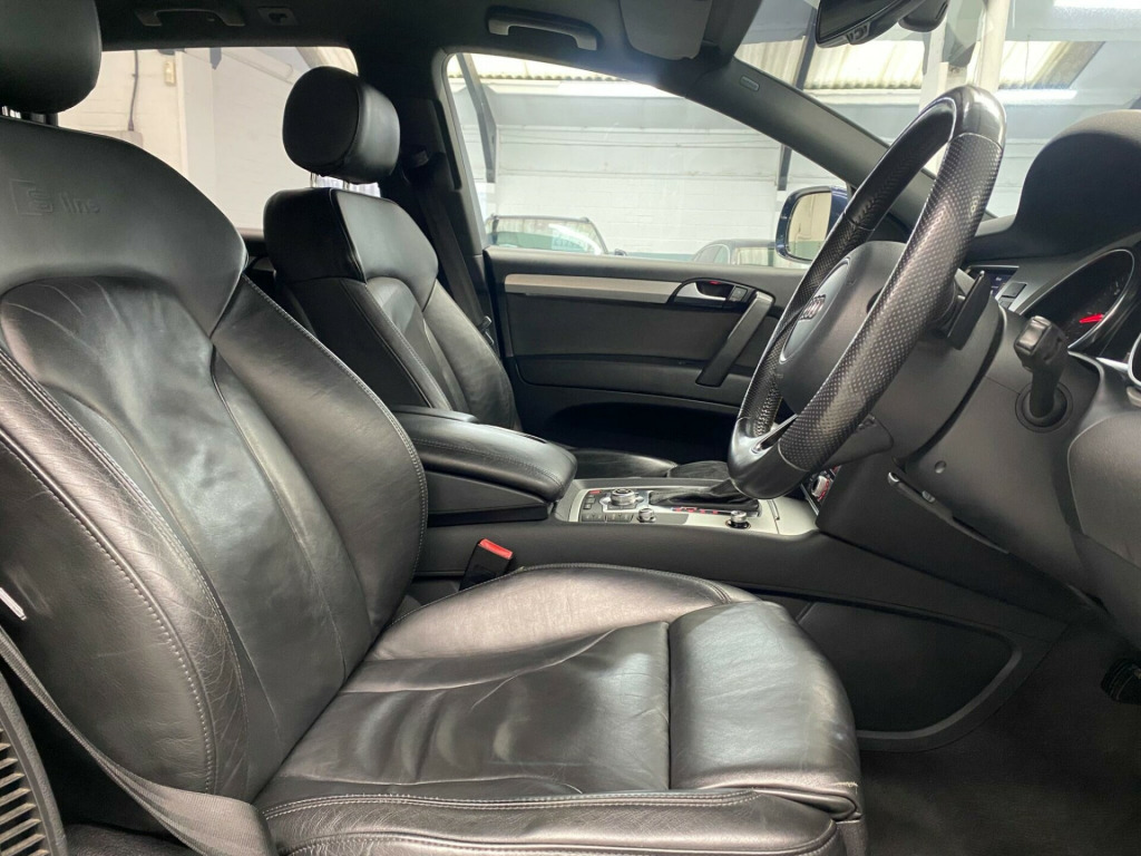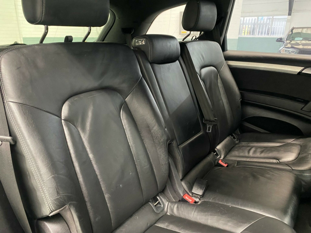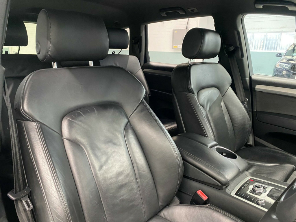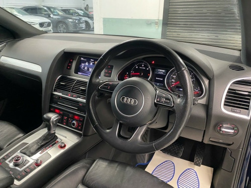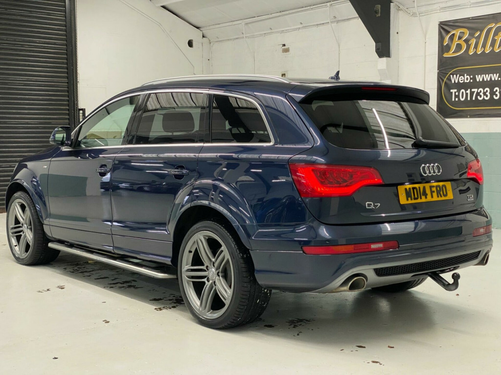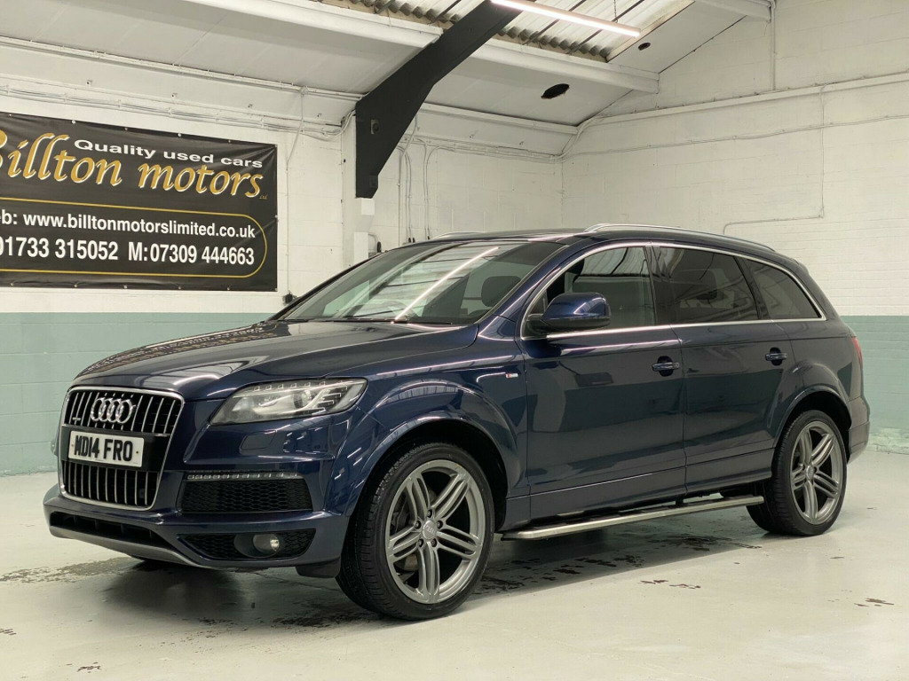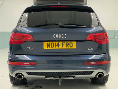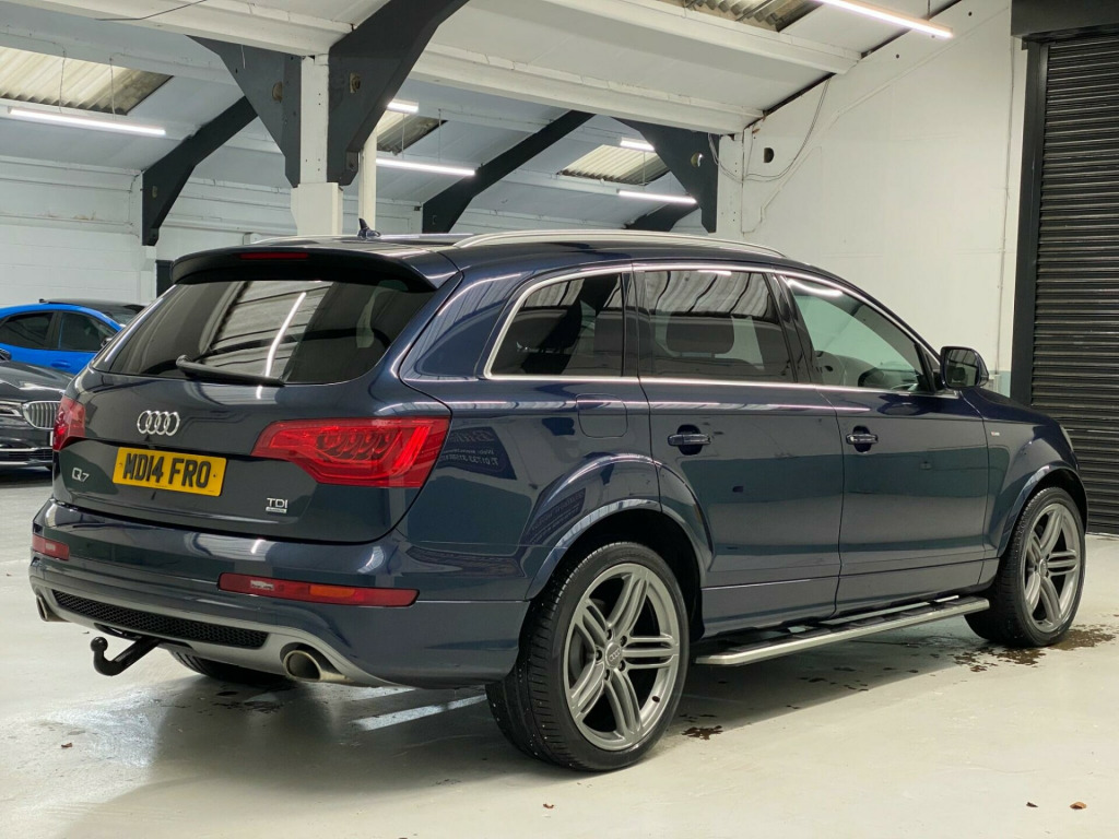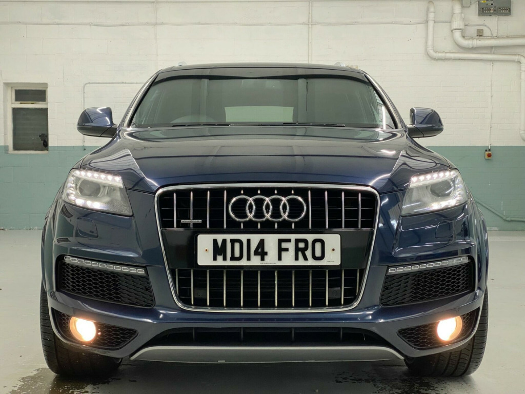 REGISTRATION: MD14FROWith a clear vehicle history and a recent service at 115,900 miles, this 2014 Audi Q7 TDI V6 S line Plus offers excellent provenance. This seven seat, four wheel drive SUV is powered by a 3.0 litre diesel engine and boasts the desirable S line Plus trim. Notable features include front and rear parking sensors with acoustic indicators, heated front seats for added comfort, and a high specification mobile telephone preparation with Audi Connect and Bluetooth connectivity. The Bi Xenon Plus headlights provide superior illumination, enhancing both visibility and the vehicle's sophisticated appearance.This Audi Q7 stands out with its impressive performance, achieving 0-62mph in just 7.8 seconds, demonstrating its dynamic capability. Furthermore, its low insurance group rating indicates that running costs are kept competitive compared to similar vehicles. The substantial towing weight of 3200 kg makes it a practical choice for those needing to tow. A three month warranty is included, providing peace of mind for the new owner.TO AVOID DISAPPOINTMENT, WE RECOMMEND RESERVING A VEHICLE WITH A REFUNDABLE HOLDING DEPOSIT OF £99. WITHOUT A HOLDING DEPOSIT, WE ARE WITHIN OUR RIGHTS TO SELL THE VEHICLE. PLEASE NOTE, THE SPECIFICATION OUTLINED WITHIN THIS ADVERT MAY NOT BE ACCURATE. PLEASE CONTACT US IF YOU HAVE ANY QUESTIONS REGARDING THE SPEC., wing bracket - electrically folding, bose surround sound system, 12v power socket - centre console, 12v power socket - rear x2, 21in alloy wheels - 5-segment-spoke design, 3d and topographical mapping, 6.5in colour display screen, abs - anti-lock braking system, ami - audi music interface, active door reflectors, adaptive air suspension, advanced 3d building display, advanced speech recognition, air vent sleeves - aluminium look, airbags - driver, airbags - front passenger, airbags - front side system, airbags - sideguard curtain, alarm - thatcham category 1, aluminium roof rails, ambient lighting - centre console, anti theft locking wheel bolts, audi parking system advanced, audi parking system rear with acoustic indicators, auto-dimming rear-view mirror, automatic wipers with rain sensor, bumpers - contrasting, cd/radio, car jack, cloth headlining in black, collapsible spare wheel, colour drivers information system - dis, comfort front centre armrest, cruise control, cup holders - centre console, cup holders in rear armrest x2, cupholders in front centre armrest, cupholders x2 in third row, dab digital radio, display screen colour 7in high resolution, door mirrors - heated-electrically adjustable-folding, door sill trims - s line, door lock switches on all 4 doors, double glazing, double load floor, dual-zone electronic climate control, ebd - electronic brakeforce distribution, edl - electronic differential lock, esp - electronic stability programme, efficiency program in the drivers information system - dis, electric windows - front and rear, electrically adjustable 4-way lumbar support, fm-am radio, first aid kit, folding storage compartment in front centre armrest, front door exit lights, front fog lights, front passenger airbag deactivation switch, front and rear floor mats, front and rear footwell lighting, hard drive - 40gb, headlights - automatic adjustment, headlights - bi-xenon plus, headlights - coming-leaving home function, headlights - light sensor, headlights washers, heated front seats, isofix - front passenger - second and third row seats, illuminated air vents in b-pillar, illuminated ashtray in rear, illuminated vanity mirrors, inlays - matt brushed aluminium, led daytime running lights, led indicators, led rear lights, lighting package, luggage compartment - net, luggage compartment - side net, luggage compartment cover, mmi radio plus with dsp sound system, mp3 and wma compatible cd player, mobile telephone preparation - high with audi connect, parking brake - foot operated, parking sensors - front, pollen filter, power operated tailgate, power steering - servotronic speed-dependent, privacy glass - double glazing, rear centre armrest, rear door exit lights, remote boot release, remote central locking, s line badge on wings, s line badging, s line body styling, sd card reader x2, sdhc card reader x2, satellite navigation system - hdd based, seats - backrests - storage net, seats - front electric adjustment, seats - front electric height adjustment, side impact protection, single cd-dvd player, split-folding rear seats, stainless steel running boards, steering column - rake and reach adjustment, steering wheel - 3-spoke leather-multi-function-shift paddles, steering wheel - multi-function, storage - glasses holder in roof module, tp memo - automatically saves traffic news, technology package, through-load facility, tool kit, warning triangle, window surrounds - aluminium
