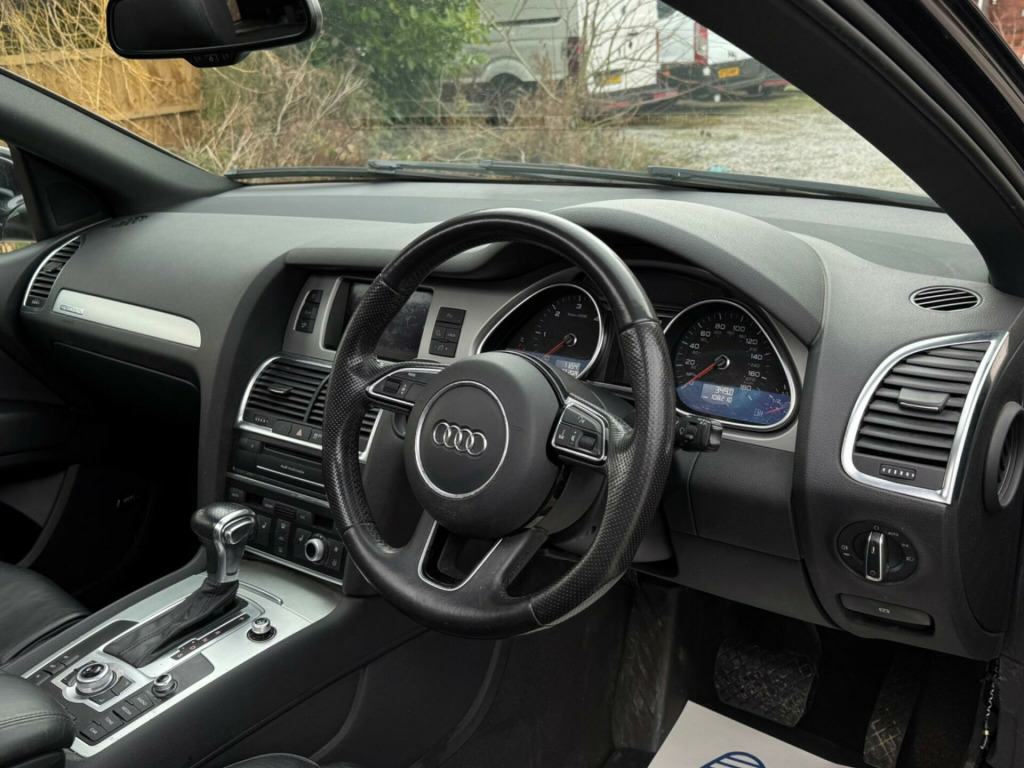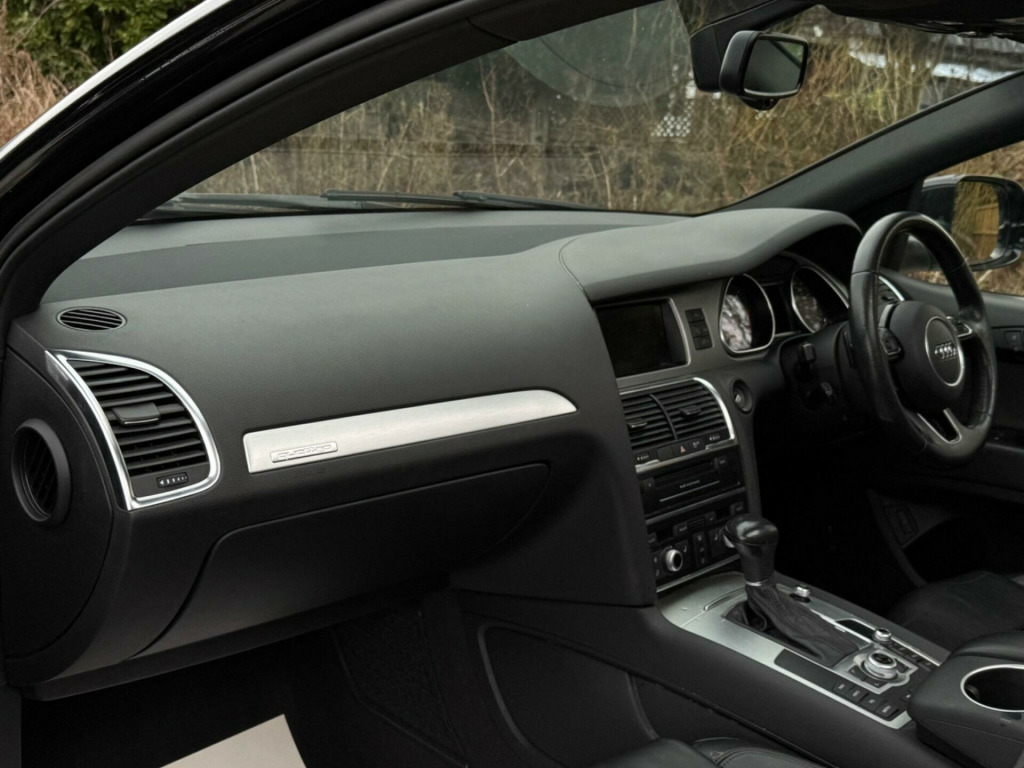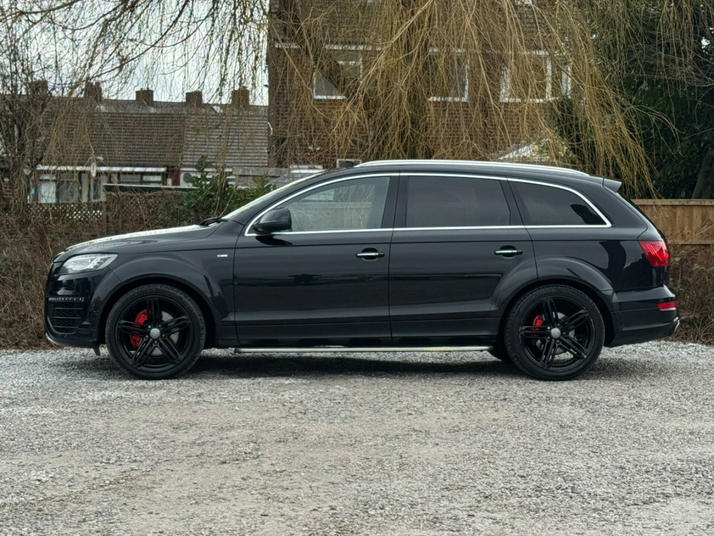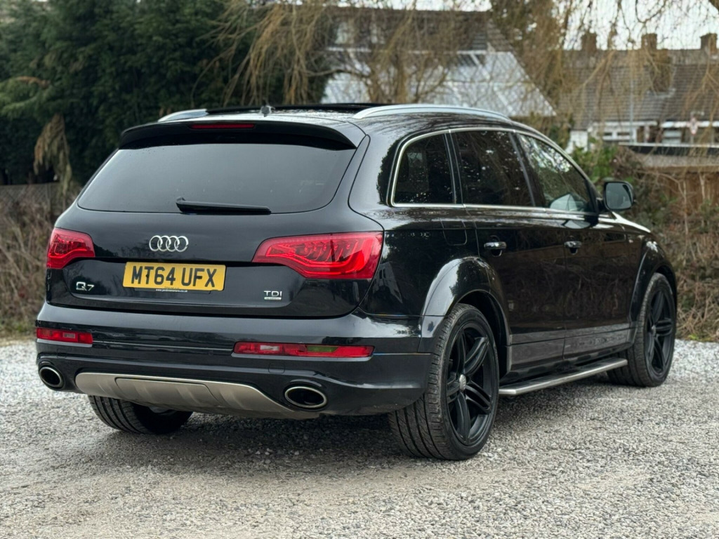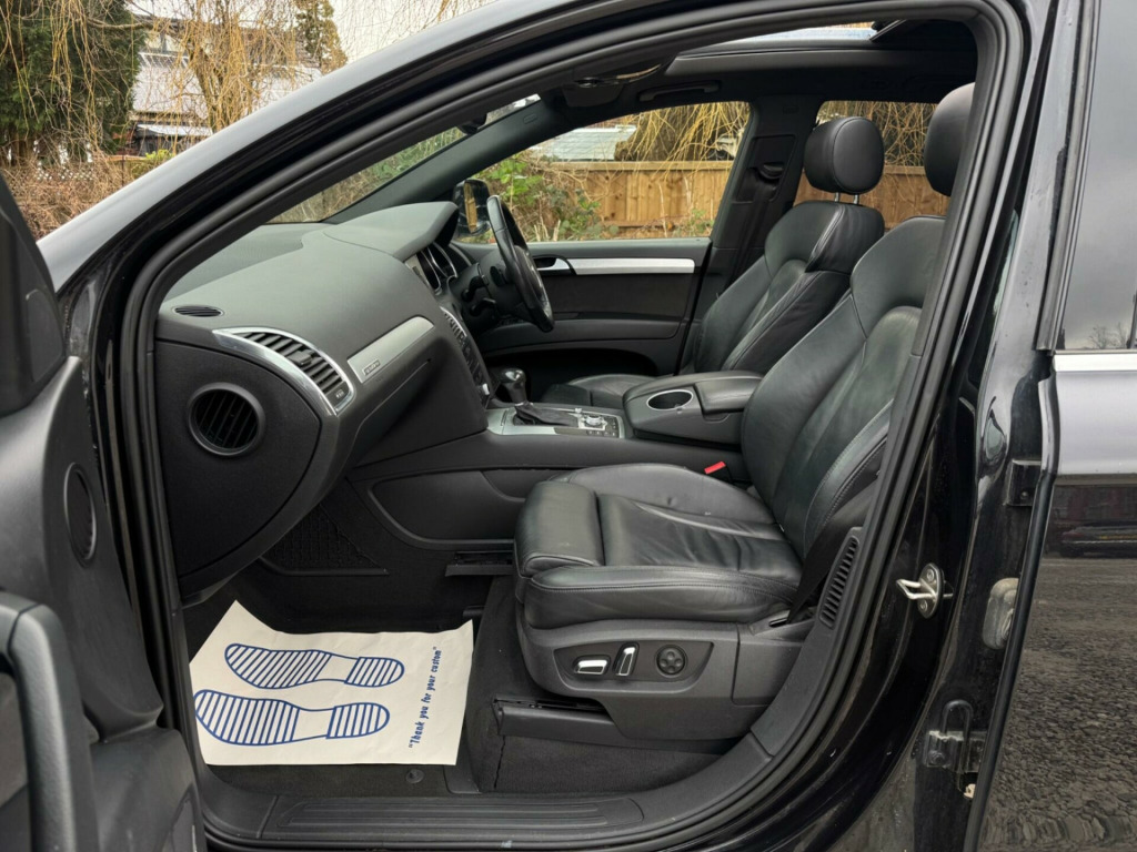 2 FORMER KEEPERSPART SERVICE HISTORYLOGBOOKK2BOSE Surround Sound SystemValuableAudi Entertainment MobileVery rarePanoramic Glass SunroofValuableTV Reception - DigitalVery rareCD ChangerVery rareDoor Mirrors - Heated-Electrically Adjustable-Folding-Auto-DimmingRareVerano Leather - S Line Sports Seats - Black21in Alloy Wheels - 5-Segment-Spoke DesignDigital TV ReceptionEquipment:7 SeatsAir ConditioningAuto Climate ControlAutomatic LightsCruise ControlDual Zone ClimateElectric Sun RoofFull Leather TrimPanoramic RoofRear Parking SensorsThis 2014 Audi Q7 TDI V6 S line Sport Edition offers a compelling blend of performance and practicality, boasting a powerful 3.0 litre diesel engine and a smooth four wheel drive system. With seating for seven, this spacious SUV is ideal for families or those who require extra versatility. The S line Sport Edition trim ensures a premium feel throughout, complemented by desirable features such as heated front seats for added comfort and Audi Parking System Advanced, which includes a reversing camera and front and rear parking sensors to make manoeuvring effortless. Stay connected on the go with Mobile Telephone Preparation featuring Audi Connect and Bluetooth connectivity.Experience impressive acceleration with this Q7, reaching 0 to 62 miles per hour in just 7.8 seconds, a testament to its potent 3.0L diesel engine. This performance, combined with its substantial 3200 kg towing weight, positions it as a capable choice for a variety of needs. Furthermore, its placement in a low insurance group highlights its cost effectiveness, making it an attractive option compared to similar vehicles. se surround sound system, audi entertainment mobile, panoramic glass sunroof, tv reception - digital, cd changer, door mirrors - heated-electrically adjustable-folding-auto-dimming, verano leather - s line sports seats - black, 21in alloy wheels - 5-segment-spoke design, digital tv reception, 12v power socket - centre console, 21in alloy wheels - 5-segment-spoke design titanium finish, 6.5in colour display screen, abs - anti-lock braking system, ami - audi music interface, air vent sleeves - aluminium look, airbags - driver, airbags - front passenger, airbags - front side system, airbags - sideguard curtain, ambient lighting - centre console, anti theft locking wheel bolts, anti-theft alarm, audi parking system advanced with reversing camera, auto-dimming rear-view mirror, automatic wipers with rain sensor, bumpers - contrasting paint finish, car jack, cloth headlining in black, collapsible spare wheel, colour drivers information system - dis, comfort front centre armrest, cruise control, cupholders, dab digital radio, dsp sound system, display screen colour tft 7in high resolution, door lower protection strips, door mirrors - heated-electrically adjustable-folding, door sill trims - s line, double glazing, double load floor, dual-zone electronic climate control, ebd - electronic brakeforce distribution, edl - electronic differential lock, esp - electronic stability programme, electric windows - front and rear, electrically adjustable 4-way lumbar support, electromechanical parking brake, exhaust tailpipe - dual oval shaped, extended wheel arches and door trims, fm-am radio, first aid kit, front lower bumper spoilers, front sports seats, front and rear floor mats, hard drive - 40gb, headlights - automatic adjustment, headlights - bi-xenon plus, headlights washers, heated front seats, isofix child seat mounting for rear seats, illuminated vanity mirrors, inlays - matt brushed aluminium, led daytime running lights, led indicators, led rear lights, large side air intakes with high-gloss black painted horizontal side bars, lighting package, lights in footwell - led, luggage compartment - storage net, luggage compartment cover, mmi radio plus, mobile telephone preparation - high with audi connect, parking sensors - front, parking sensors - rear, power operated tailgate, power steering - servotronic, privacy glass, rear centre armrest, remote central locking, reversing camera, roof rails - high-gloss black, s line badges on front wings, s line design body styling, sd card reader x2, sdhc card reader x2, satellite navigation system - hdd based, seats - backrests - storage net, seats - drivers electric adjustment, seats - passengers electric adjustment, side impact protection, single cd-dvd player, stainless steel running boards, stainless steel underbody protection, steering wheel - 3-spoke, steering wheel - 3-spoke leather, steering wheel - gear-shift paddles, steering wheel - multi-function, styling package - contrast colour exterior, suspension - adaptive air - s models, technology package, tool kit, usb connection, voice dialogue system, warning triangle, window surrounds - aluminium