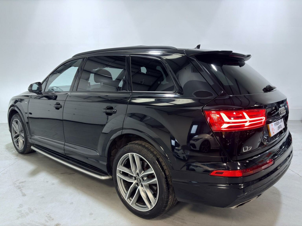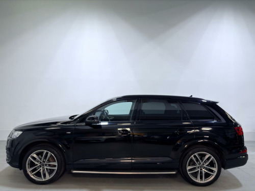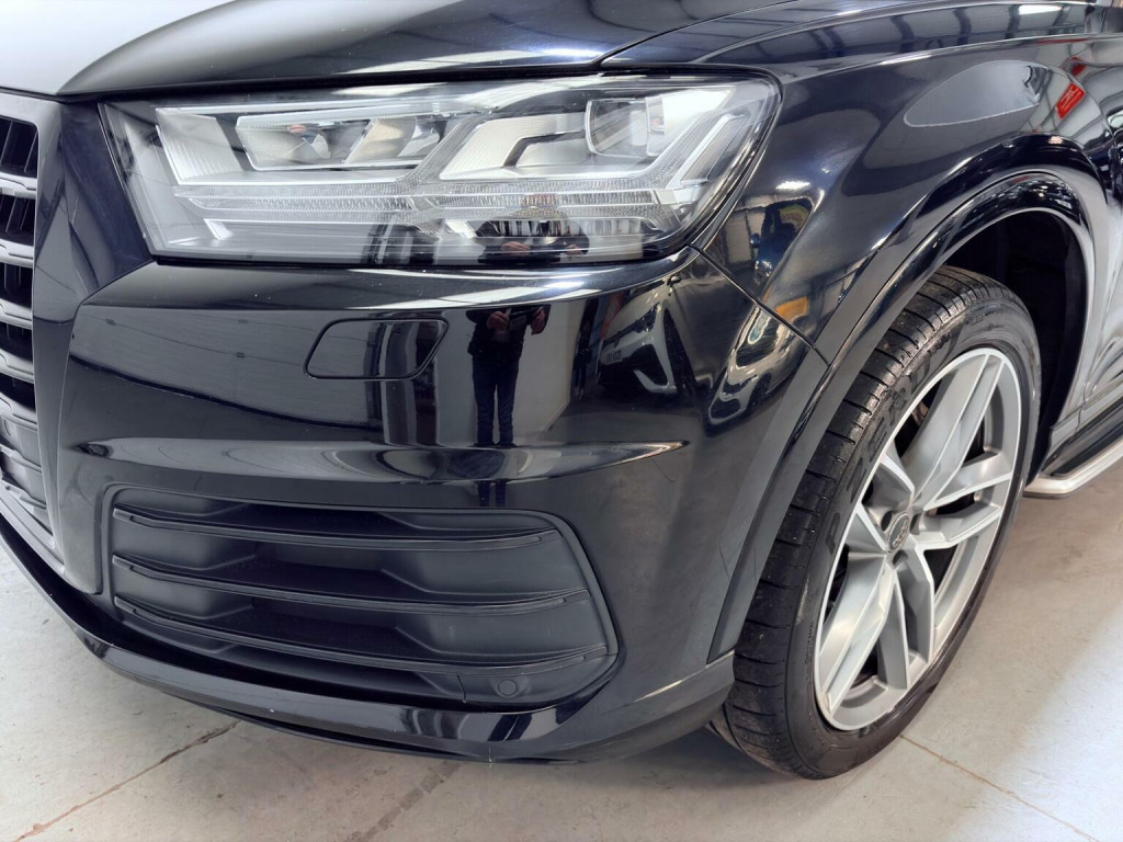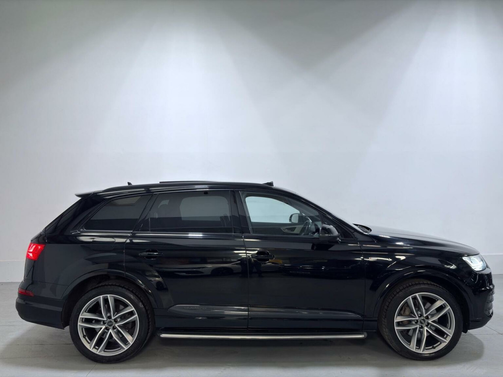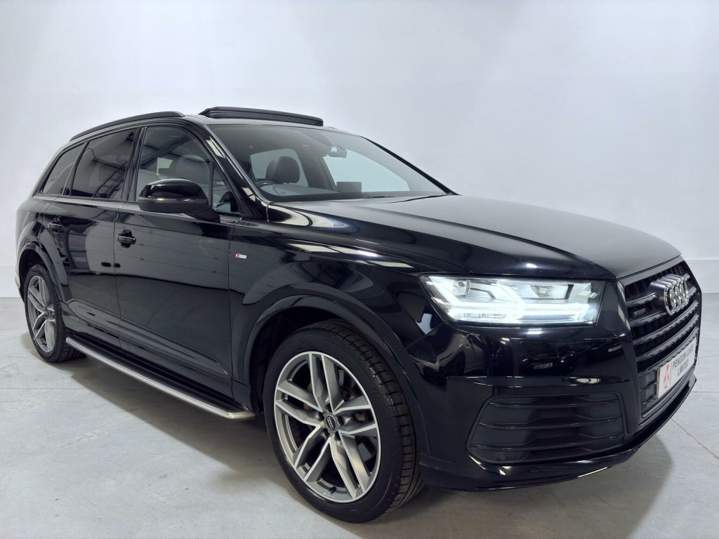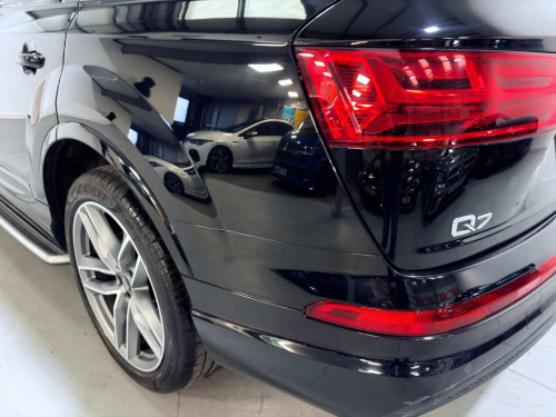 This 2018 Audi Q7 TDI V6 S line boasts a full dealership service history. Finished in Mythos Black Metallic, 21 Alloys and running boards as well as Audi Styling Pack makes this a very attractive car. Also benefiting from a high spec of features that include Audi Rear Entertainment Screens, Panoramic Glass opening Roof, Adaptive Air Suspension, Audi Hill Hold Assist, Cruise Control with Speed Limiter, Heated Front Seats, Keyless Go, LED Headlights with LED Rear Lights and Dynamic Rear Indicators and High-Beam Assist, Auto Lights and Auto Wipers, Dual Zone Climate Control, DAB Radio, SATNAV, Power Operated Tailgate, Voice Control System to name just a few. This Audi Q7 is designed for both performance and practicality, with a substantial towing weight of 2800 kg. Its fuel economy is a notable highlight, achieving an impressive 49 miles per gallon, which is better than many similar vehicles. The acceleration is also strong, reaching 0 to 62 miles per hour in just 7.3 seconds, demonstrating its dynamic capabilities. With a 6 month warranty and 12 months MOT provided on purchase, alongside a low insurance group rating, this vehicle offers excellent value and reassurance.