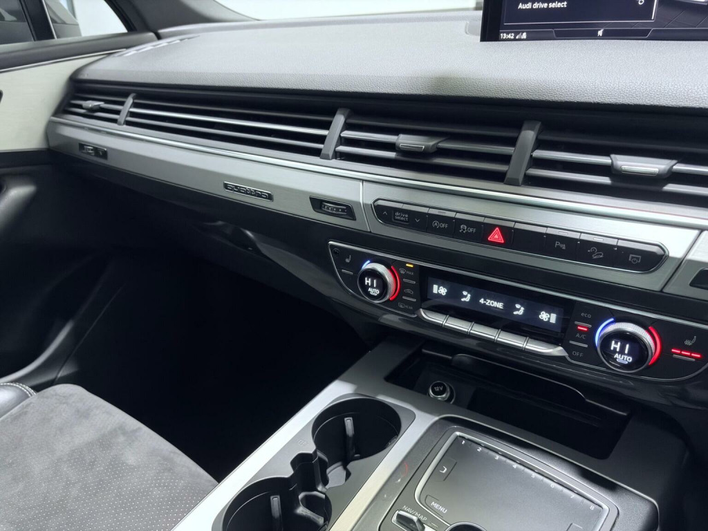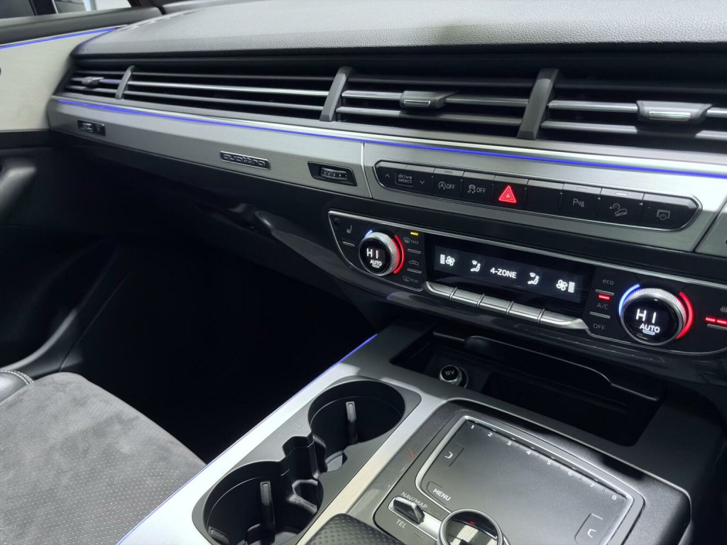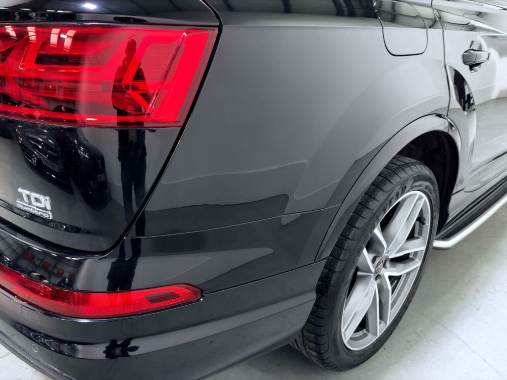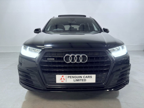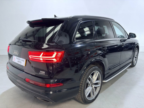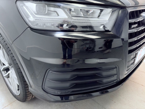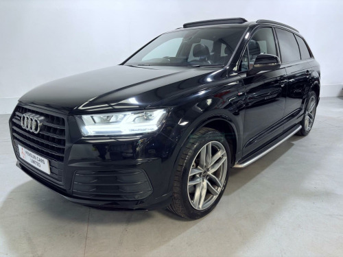 This 2018 Audi Q7 TDI V6 S line boasts a full dealership service history. Finished in Mythos Black Metallic, 21 Alloys and running boards as well as Audi Styling Pack makes this a very attractive car. Also benefiting from a high spec of features that include Audi Rear Entertainment Screens, Panoramic Glass opening Roof, Adaptive Air Suspension, Audi Hill Hold Assist, Cruise Control with Speed Limiter, Heated Front Seats, Keyless Go, LED Headlights with LED Rear Lights and Dynamic Rear Indicators and High-Beam Assist, Auto Lights and Auto Wipers, Dual Zone Climate Control, DAB Radio, SATNAV, Power Operated Tailgate, Voice Control System to name just a few. This Audi Q7 is designed for both performance and practicality, with a substantial towing weight of 2800 kg. Its fuel economy is a notable highlight, achieving an impressive 49 miles per gallon, which is better than many similar vehicles. The acceleration is also strong, reaching 0 to 62 miles per hour in just 7.3 seconds, demonstrating its dynamic capabilities. With a 6 month warranty and 12 months MOT provided on purchase, alongside a low insurance group rating, this vehicle offers excellent value and reassurance.