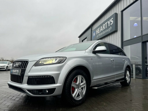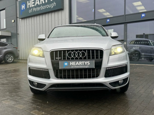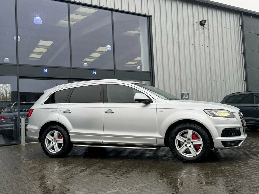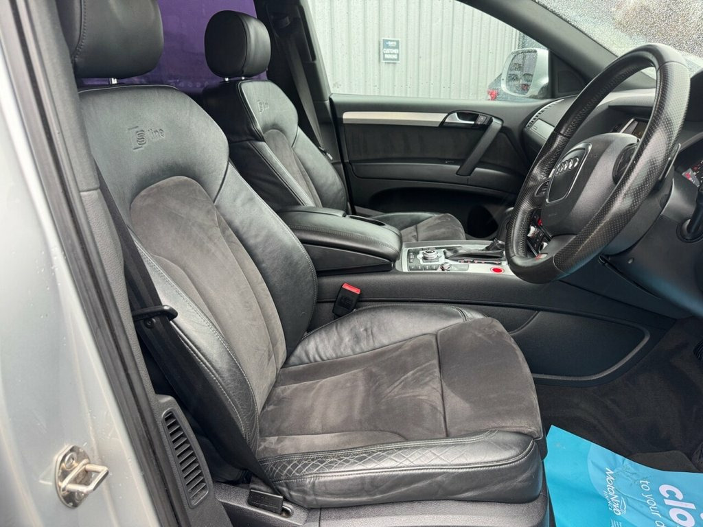 DRIVE HOME IN THIS EXTREMLY RARE AUDI Q7 4.2 V8 TDI S-LINE TIPTRONIC QUATTRO 340 BHP FINISHED IN SILVER AND TRIMMED WITH HEATED ELECTRIC ADJUSTABLE PART LEATHER SPORTS SEATING. SENSIBLE MILES ONLY 106K WITH A SERVICE HISTORY INC 12X SERVICES WITH THE LAST SERVICE @ 98K WITH THE LAST OWNER SINCE 2021. A WONDERFUL COMBINATION OF STYLE, LUXURY, PRACTICALITY AND PERFORMANCE. HUGE SPEC INC PRIVACY GLASS, SAT-NAV, REAR CAMERA, SIDE STEPS, 18"ALLOY WHEELS, CLIMATE & CRUISE CONTROL, 7 SEATS ALONG WITH THE USUAL AUDI REFINEMENTS. Leather & Alcantara-, Bluetooth phone prep- Low, Ice Silver, Dark tinted Glass behind B pillar, 3Spoke Leather Multifunction S Line Stee, 8 Speakers, Acoustic Parking System- Rear, Black Cloth headlining, Cruise Control, Delete Row3 Seats, Delete engine designation at Rear, Deletion of model & engine designati, Drivers information System, Fresco carpets, Front Ashtray & cigar Lighter, Front&Rear floor mats, Heated Front Seats, Leather gear knob, MMI- Multi Media Interface Control Syste, Matt brushed Aluminium fascia & door, Mobile phone preparation with Bluetooth , Non smoking Pack, Polished Aluminium RoofRails, Radiator grille is S Line look, Reach & rake adjust Stee