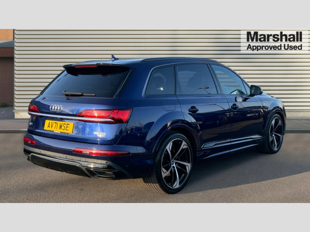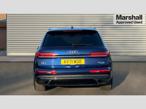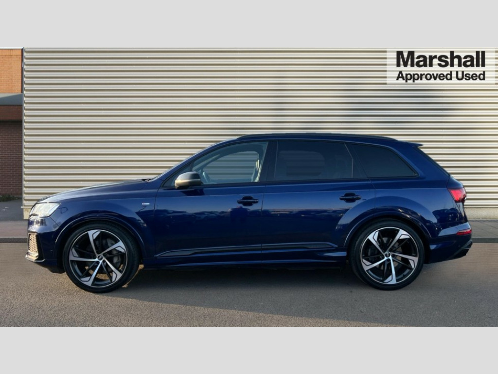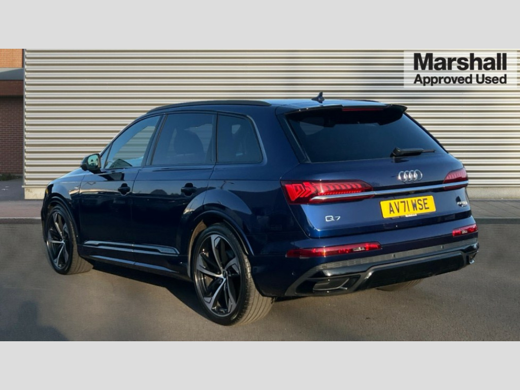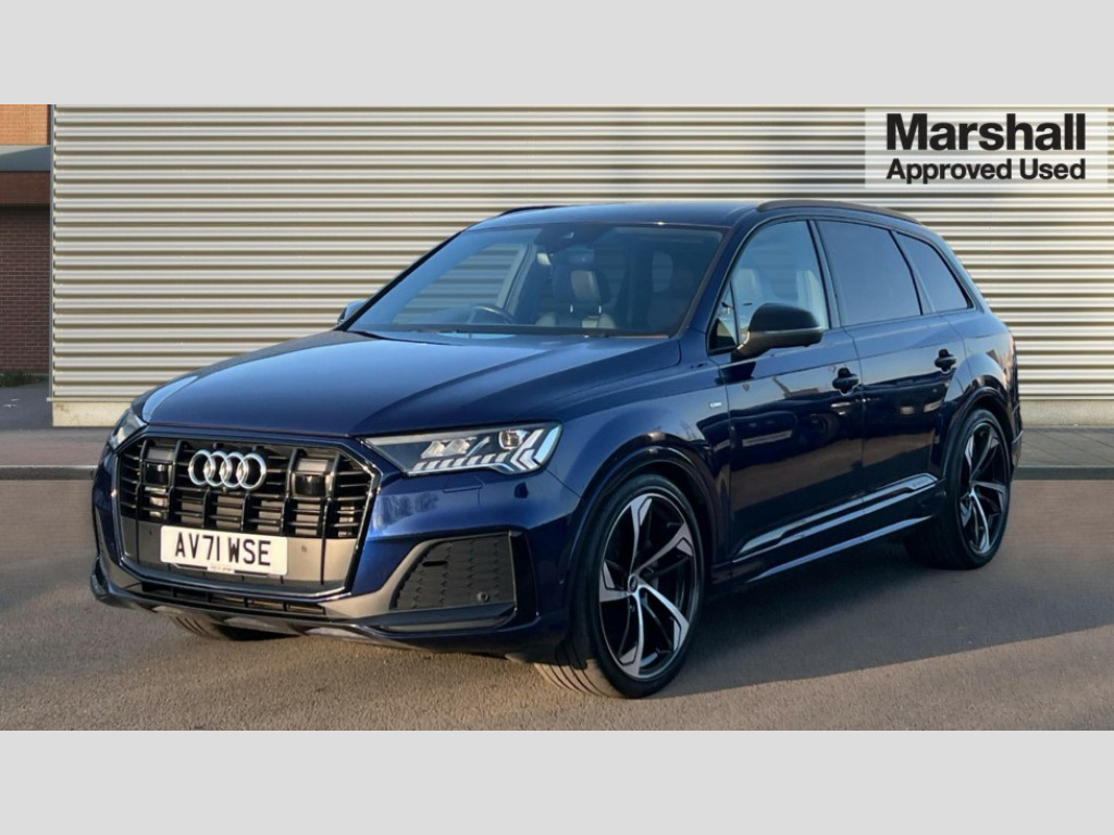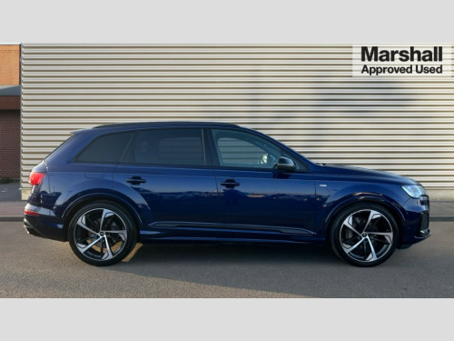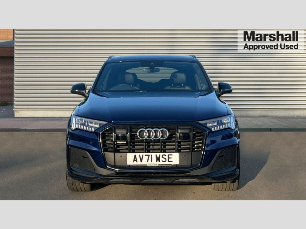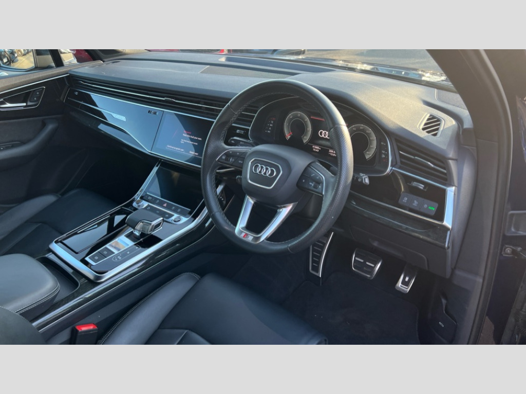 Audi Q7 50 TDI Quattro Black Edition 5dr Tiptronic Audi connect safety and service (e-call), Audi connect with Amazon Alexa Integration, Audi drive select (Auto, Comfort, Dynamic, Efficiency, Individual, Off-road and All road), Audi phone box with wireless charging, Camera based traffic sign recognition, Electromechanical steering, MMI navigation plus with MMI touch screens includes 10.1" and 8.6" screens with haptic feedback, Natural voice recognition, Parking system plus with 360 degree display (front, rear and side sensors) - acoustic and visual park assist system, Power operated tailgate, Rear view camera, Smartphone interface includes wireless Apple carplay/Android Auto, Start/stop system, 48V Mild hybrid technology, Adaptive air sports suspension, Quattro all wheel drive with self locking centre differential, Audi music interface - front 2 USB-C ports with charger and data functions, Audi sound system with 6 channel amplifier, 180 watt amplifying capacity and 10 loudspeakers including subwoofer, DAB digital radio module, Audi matrix LED headlights with dynamic front and rear indicators, Auto dimming frameless rear view mirror, Black roof rails, Bumpers in contrast paint scandium grey finish includes door trim and wheel arch trim strips, inlays in door strip contain quattro embossing, Electrically adj heated/folding + automatically dimming exterior mirrors with memory + automatic kerb side function for passenger side exterior mirror, Heat insulating glass in windshield, Integrated LED indications in door mirrors, LED daytime running lights, LED rear tail lights, Privacy glass - dark tinted rear and rear side windows from B-pillar backwards, 4 zone deluxe automatic climate control, 7 seat layout with ISOFIX points for the front passenger seat and rear passenger seat, Black cloth headlining, Comfort front centre armrest, Electric adjustable front seat with 4 way lumbar support, driver memory functionality, Folding rear seats, Front head restraints, Front/rear floor mats, Heated front seats, Illuminated door sill trims with S logo, LED interior ambient lighting, Luggage compartment cover, Luggage compartment sill protection in stainless steel, Rear head restraints, Stainless steel pedals, Sunvisors with illuminated vanity mirrors, Titanium black styling pack - Q7/SQ7, 3 point seatbelts on all rear seats, Audi pre sense front, Driver and front passenger, front side and curtain airbags, Electromechanical parking brake, Electronic Stabilisation Control (ESC) including ABS, ASR and EDL, Extended pedestrian protection measures, Hill hold assist, Seatbelt monitoring, Tyre pressure loss indicator, Warning triangle and first aid kit, Anti theft alarm, Anti-theft wheel bolts and wheel loosening detection, Keyless Go, Remote central locking, Polished oak trim with grey finish inlay, Tool kit, Tyre repair kit