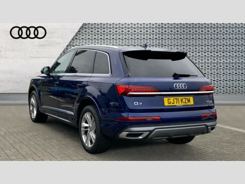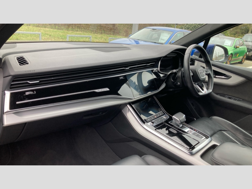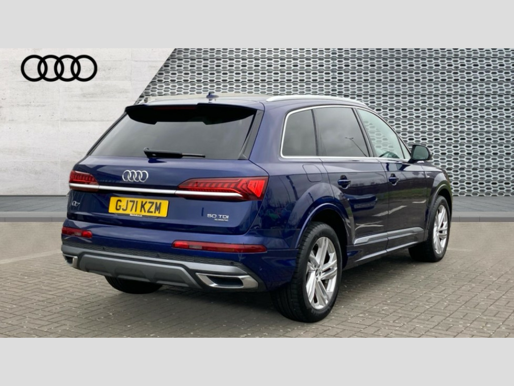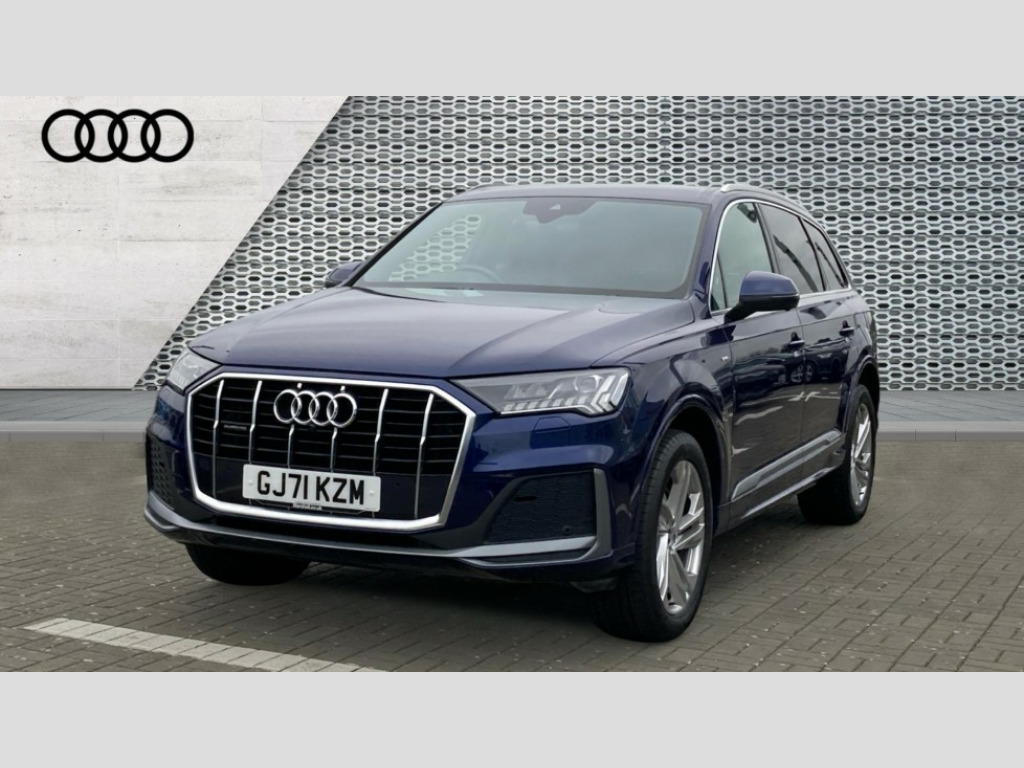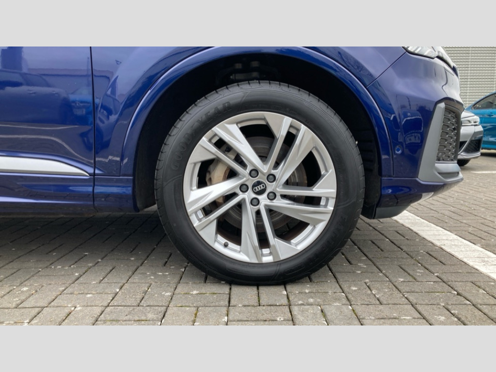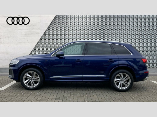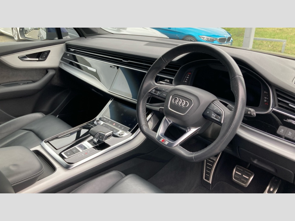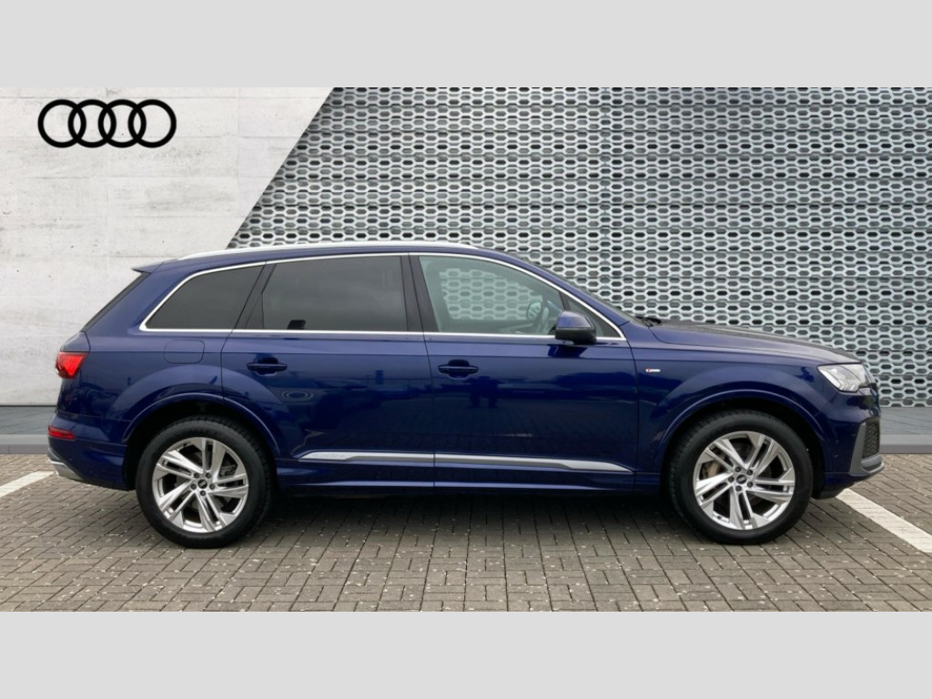 Audi Q7 50 TDI Quattro S Line 5dr Tiptronic Audi connect safety and service (e-call), Audi connect with Amazon Alexa Integration, Audi drive select (Auto, Comfort, Dynamic, Efficiency, Individual, Off-road and All road), Bluetooth interface, Camera based traffic sign recognition, Electromechanical steering, MMI navigation plus with MMI touch screens includes 10.1" and 8.6" screens with haptic feedback, Natural voice recognition, Parking system plus with 360 degree display (front, rear and side sensors) - acoustic and visual park assist system, Power operated tailgate, Rear view camera, Smartphone interface includes wireless Apple carplay/Android Auto, Start/stop system, 48V Mild hybrid technology, Adaptive air suspension, Quattro all wheel drive with self locking centre differential, Audi music interface - front 2 USB-C ports with charger and data functions, Audi sound system with 6 channel amplifier, 180 watt amplifying capacity and 10 loudspeakers including subwoofer, DAB digital radio module, Aluminium roof rails, Aluminium window trim, Audi matrix LED headlights with dynamic front and rear indicators, Auto dimming frameless rear view mirror, Body coloured door mirrors, Electrically adj heated/folding + automatically dimming exterior mirrors with memory + automatic kerb side function for passenger side exterior mirror, Heat insulating glass in windshield, Integrated LED indications in door mirrors, LED daytime running lights, LED rear tail lights, Privacy glass - dark tinted rear and rear side windows from B-pillar backwards, S Line badge on wings, S line bumpers in full body colour paint finish, S line roof spoiler, S line styling side ventilation grilles and side skirts, 2 zone automatic climate control, 7 seat layout with ISOFIX points for the front passenger seat and rear passenger seat, Black cloth headlining, Comfort front centre armrest, Electric adjustable front seat with 4 way lumbar support, driver memory functionality, Folding rear seats, Front head restraints, Front/rear floor mats, Heated front seats, Illuminated door sill trims with S logo, LED interior ambient lighting, Luggage compartment cover, Luggage compartment sill protection in stainless steel, Rear head restraints, Stainless steel pedals, Sunvisors with illuminated vanity mirrors, 3 point seatbelts on all rear seats, Audi pre sense front, Driver and front passenger, front side and curtain airbags, Electromechanical parking brake, Electronic Stabilisation Control (ESC) including ABS, ASR and EDL, Extended pedestrian protection measures, Hill hold assist, Seatbelt monitoring, Tyre pressure loss indicator, Warning triangle and first aid kit, Anti theft alarm, Anti-theft wheel bolts and wheel loosening detection, Keyless Go, Remote central locking, Darkened matt brushed aluminium inlays, Tool kit, Tyre repair kit