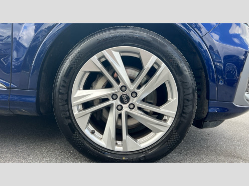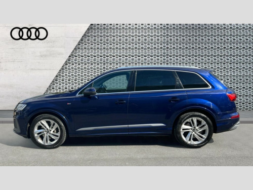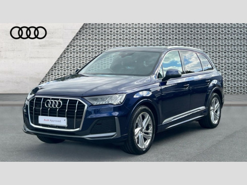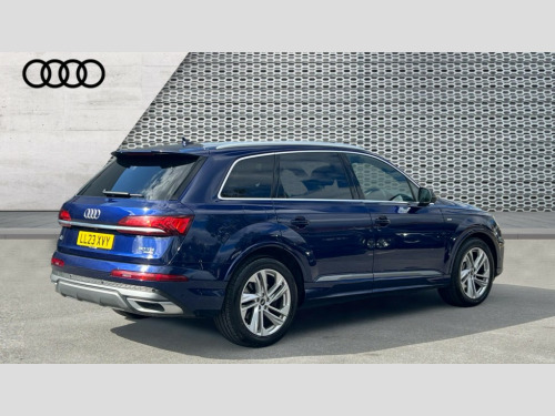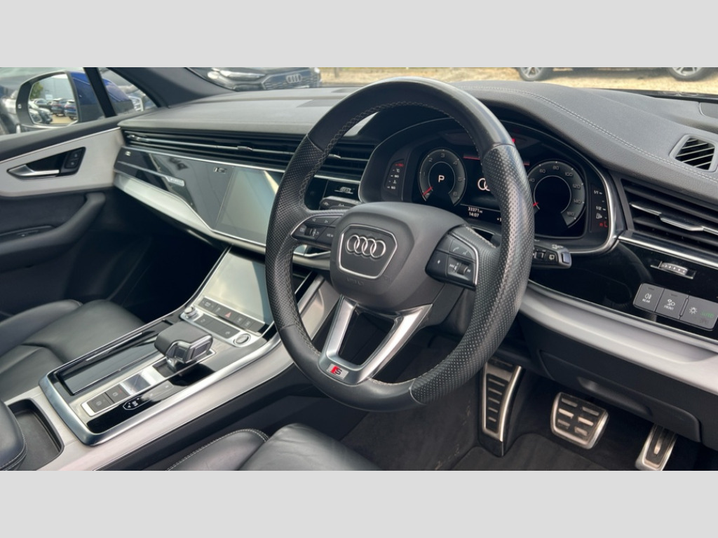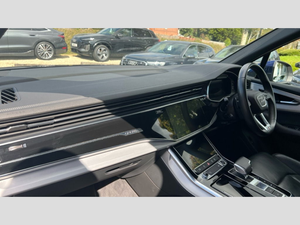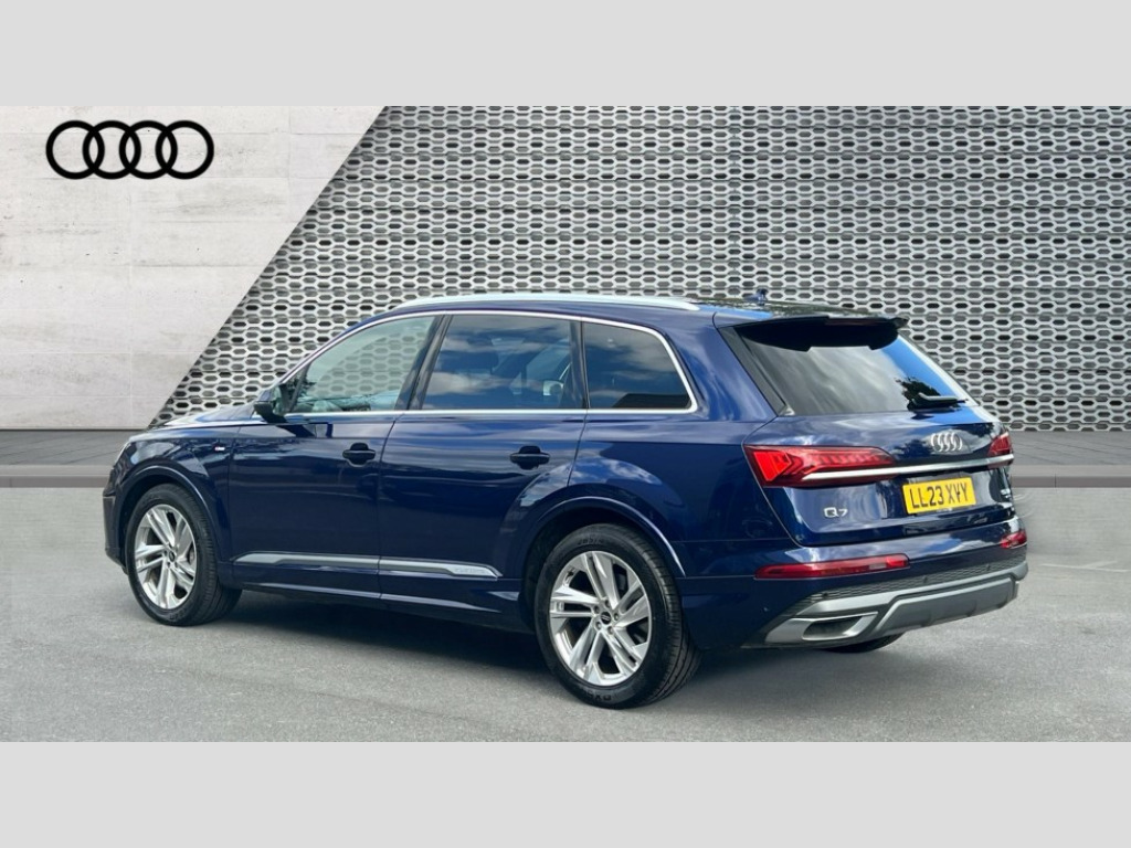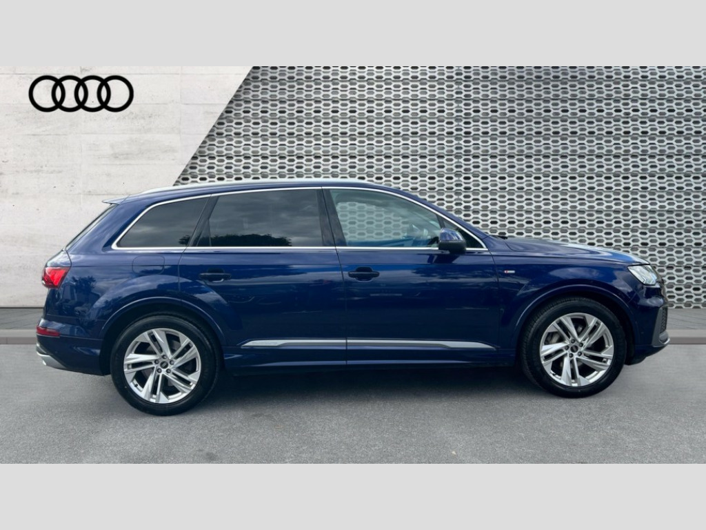 Audi Q7 50 TDI Quattro Black Edition 5dr Tiptronic Audi connect safety and service (e-call), Audi connect with Amazon Alexa Integration, Audi drive select (Auto, Comfort, Dynamic, Efficiency, Individual, Off-road and All road), Audi phone box light with wireless charging, Audi virtual cockpit - 12.3" high-resolution LCD display with fully customisable instrument cluster, Bluetooth interface, Camera based traffic sign recognition, Electromechanical steering, MMI navigation plus with MMI touch screens includes 10.1" and 8.6" screens with haptic feedback, Natural voice recognition, Power operated tailgate, Smartphone interface includes wireless Apple carplay/Android Auto, Start/stop system, 48V Mild hybrid technology, Adaptive air suspension, Quattro all wheel drive with self locking centre differential, Audi music interface - front 2 USB-C ports with charger and data functions, DAB digital radio module, 3rd brake light, Aluminium roof rails, Aluminium window trim, Auto dimming frameless rear view mirror, Body coloured door mirrors, Bumpers in contrast paint scandium grey finish includes door trim and wheel arch trim strips, inlays in door strip contain quattro embossing, Dark tinted Matrix LED headlights with dynamic front and rear indicators, Electrically adj heated/folding + automatically dimming exterior mirrors with memory + automatic kerb side function for passenger side exterior mirror, Heat insulating glass in windshield, Integrated LED indications in door mirrors, LED daytime running lights, LED rear tail lights, Privacy glass - dark tinted rear and rear side windows from B-pillar backwards, Rear side wing doors, Rear wiper, S Line badge on wings, S line bumpers in full body colour paint finish, S line roof spoiler, S line styling side ventilation grilles and side skirts, 2 seat bench in 3rd row, 2 zone automatic climate control, 3 seat bench in 2nd row, 7 seat layout with ISOFIX points for the front passenger seat and rear passenger seat, Black cloth headlining, Comfort front centre armrest, Electric adjustable front seat with 4 way lumbar support, driver memory functionality, Folding rear seats, Front head restraints, Front/rear floor mats, Heated front seats, Illuminated door sill trims with S logo, Luggage compartment cover, Luggage compartment sill protection in stainless steel, Rear head restraints, Single front passenger seat, Stainless steel pedals, Sunvisors with illuminated vanity mirrors, Tech Pack - Q7, 3 point seatbelts on all rear seats, Audi pre sense front, Child locks on rear doors, Driver and front passenger, front side and curtain airbags, Electromechanical parking brake, Electronic Stabilisation Control (ESC) including ABS, ASR and EDL, Extended pedestrian protection measures, Hill hold assist, Seatbelt monitoring, Tyre pressure loss indicator, Warning triangle and first aid kit, Anti theft alarm, Anti-theft wheel bolts and wheel loosening detection, Keyless Go, Remote central locking, Darkened matt brushed aluminium inlays, Tool kit, Tyre repair kit