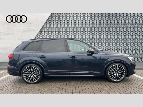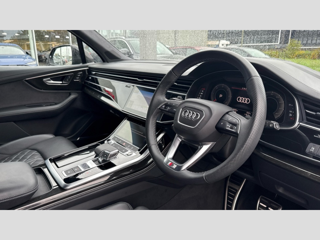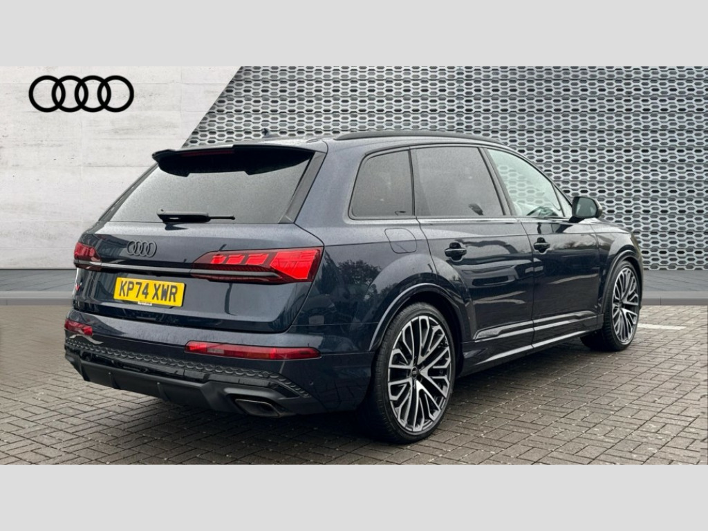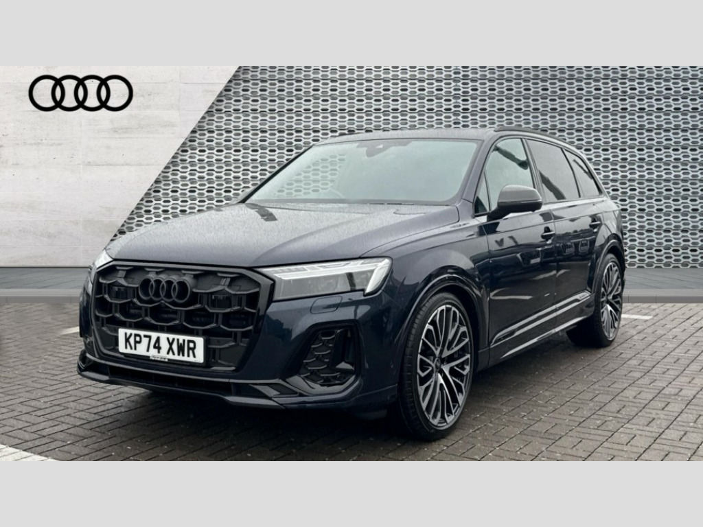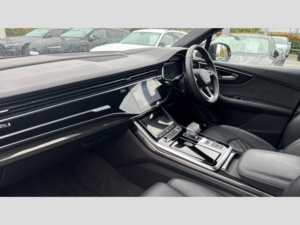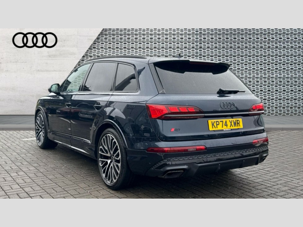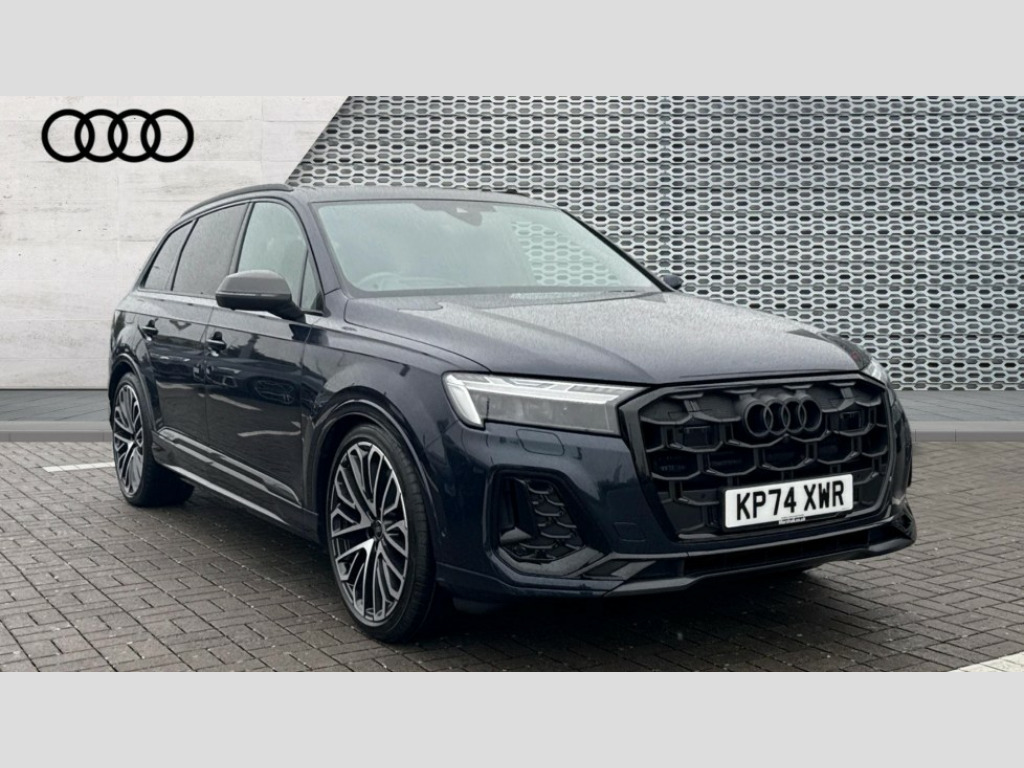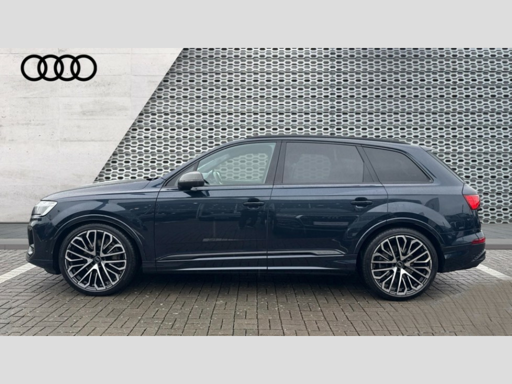Audi Q7 50 TDI Quattro Vorsprung 5dr Tiptronic All wheel steering, Audi connect safety and service (e-call), Audi connect with Amazon Alexa Integration, Audi drive select (Auto, Comfort, Dynamic, Efficiency, Individual, Off-road and All road), Audi phone box light with wireless charging, Audi virtual cockpit plus, Bluetooth interface, Camera based traffic sign recognition, Electromechanical power steering, MMI navigation plus with MMI touch screens includes 10.1" and 8.6" screens with haptic feedback, Natural voice recognition, Operating buttons in Matte black, Power door closure, Power operated tailgate, Smartphone interface includes wireless Apple carplay/Android Auto, Start/stop system, 48V Mild hybrid technology, Adaptive air sports suspension, Quattro all wheel drive with self locking centre differential, Audi music interface - front 2 USB-C ports with charger and data functions, DAB digital radio module, Audi Beam uses LEDs to project Vorsprung logo onto the ground as you exit your Q7, Auto dimming frameless rear view mirror, Black exhausts, Black roof rails, Digital OLED rear combination lamps, Electrically adj heated/folding + automatically dimming exterior mirrors with memory + automatic kerb side function for passenger side exterior mirror, HD Matrix LED headlights with Audi laser light, Headlight washers, Heat insulating glass in windshield, Integrated LED indications in door mirrors, LED 3rd brake light, LED daytime running lights, Loading edge protection in stainless steel, Panoramic sunroof, Privacy glass - dark tinted rear and rear side windows from B-pillar backwards, Rear side wing doors, Rear wiper, 2 seat bench in 3rd row, 3 seat bench in 2nd row, 3 spoke heated leather multi-function sport steering including paddle shift, 3 zone climate control, 7 seat layout with ISOFIX points for the front passenger seat and rear passenger seat, Black dinamica headlining, Comfort front centre armrest, Double sun visors with illuminated vanity mirrors, Electric adjustable front seats/backrest bolsters, lumbar support, memory functionality, Electric steering wheel adjustment, Folding rear seats, Front head restraints, Front/rear floor mats, Heated front seats, Illuminated door sill trims with S logo, ISOFIX child seat mounting for front passenger seat and 2 outer rear seats with top tether child seat mounting for all 3 rear seats, Luggage compartment sill protection in stainless steel, Manual sunblind for the rear side windows and manual sunblind for the rear window, Rear head restraints, Seat ventilation and massage function in the front, Single front passenger seat, Stainless steel pedals, Valcona leather upholstery with front super sport seat S embossed logo, Black styling pack plus - Q7, City assist pack - Q7, Extended leather pack - Q7, Multi-coloured extended LED Interior lighting pack - Q7, Technology Pack Pro Without Advance Key - Q7, Tour pack without Pre sense basic - Q7, 3 point seatbelts on all rear seats, Audi pre sense front, Child locks on rear doors, Convenience key with safelock and gesture tailgate, Driver and front passenger, front side and curtain airbags, Electromechanical parking brake, Electronic Stabilisation Control (ESC) including ABS, ASR and EDL, Extended pedestrian protection measures, Hill hold assist, Seatbelt reminder, Tyre pressure loss indicator, Warning triangle and first aid kit, Anti theft alarm with tow away protection, Anti-theft wheel bolts and wheel loosening detection, Remote central locking, Polished oak trim with grey finish inlay, Tool kit, Tyre repair kit