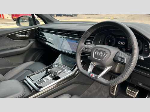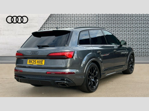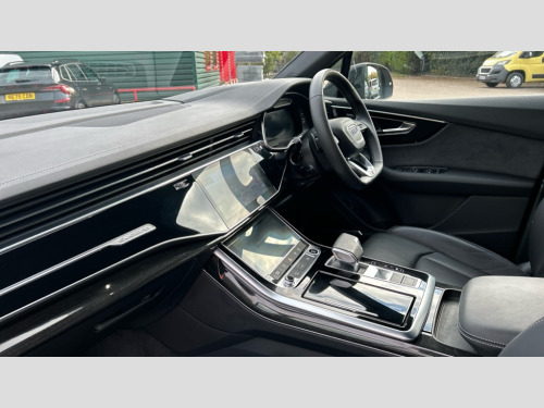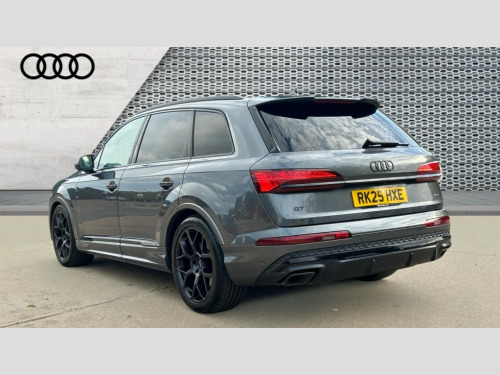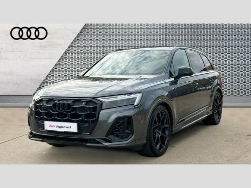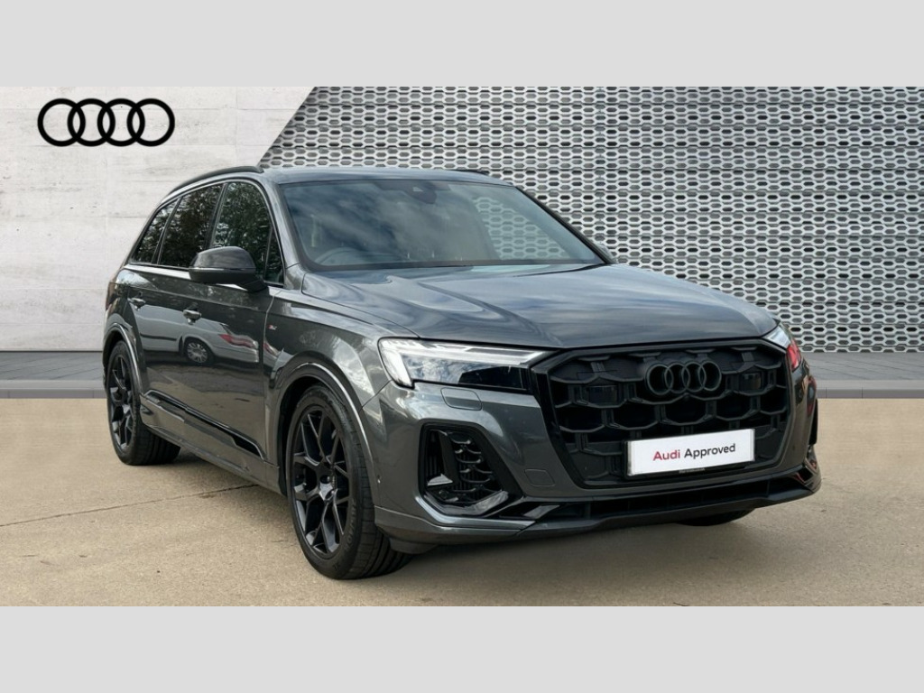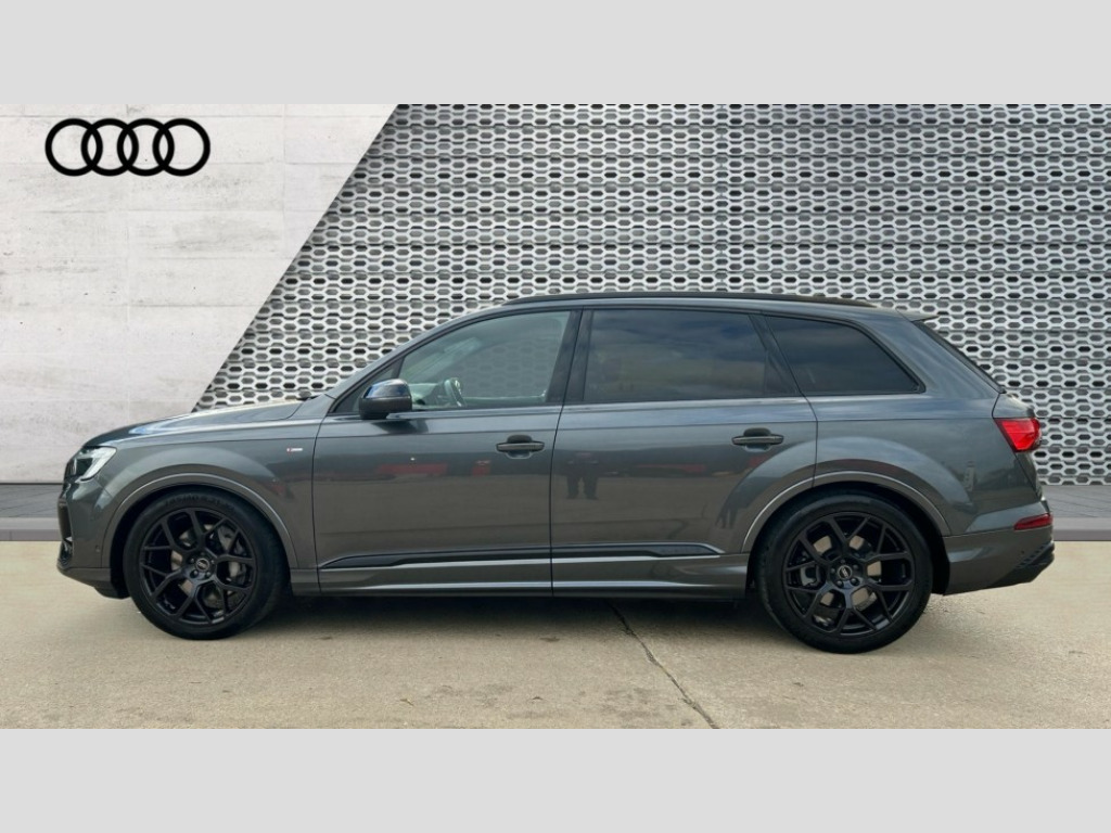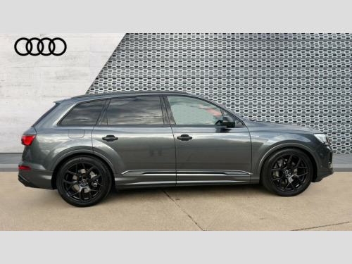 Audi Q7 55 TFSI Quattro Black Edition 5dr Tiptronic Audi connect safety and service (e-call), Audi connect with Amazon Alexa Integration, Audi drive select (Auto, Comfort, Dynamic, Efficiency, Individual, Off-road and All road), Audi phone box light with wireless charging, Audi virtual cockpit - 12.3" high-resolution LCD display with fully customisable instrument cluster, Bluetooth interface, Camera based traffic sign recognition, Electromechanical power steering, MMI navigation plus with MMI touch screens includes 10.1" and 8.6" screens with haptic feedback, Natural voice recognition, Operating buttons in Matte black, Parking system plus with 360 degree display (front, rear and side sensors) - acoustic and visual park assist system, Power operated tailgate, Rear view camera, Smartphone interface includes wireless Apple carplay/Android Auto, Start/stop system, 48V Mild hybrid technology, 85 litre fuel tank, Adaptive air sports suspension, Quattro all wheel drive with self locking centre differential, Audi music interface - front 2 USB-C ports with charger and data functions, Audi sound system with 6 channel amplifier, 180 watt amplifying capacity and 10 loudspeakers including subwoofer, DAB digital radio module, Aluminium window trim, Audi Beam uses LEDs to project S emblem with red rhombus onto the ground when opening the side doors (front/rear), Auto dimming frameless rear view mirror, Black exhausts, Black roof rails, Electrically adj heated/folding + automatically dimming exterior mirrors with memory + automatic kerb side function for passenger side exterior mirror, Heat insulating glass in windshield, Integrated LED indications in door mirrors, LED 3rd brake light, LED daytime running lights, LED rear tail lights, Loading edge protection in stainless steel, Matrix LED headlights with dynamic front and rear indicators, Privacy glass - dark tinted rear and rear side windows from B-pillar backwards, Rear side wing doors, Rear wiper, 2 seat bench in 3rd row, 2 zone automatic climate control, 3 seat bench in 2nd row, 7 seat layout with ISOFIX points for the front passenger seat and rear passenger seat, Black carpets, Black cloth headlining, Comfort front centre armrest, Electric adjustable front seat with 4 way lumbar support, driver memory functionality, Folding rear seats, Front head restraints, Front/rear floor mats, Heated front seats, Illuminated door sill trims with S logo, ISOFIX child seat mounting for front passenger seat and 2 outer rear seats with top tether child seat mounting for all 3 rear seats, LED interior ambient lighting, Luggage compartment cover, Luggage compartment sill protection in stainless steel, Rear head restraints, Rear seat bench plus for the second row, with forwards/backwards sliding adjustment and backrest angle adjustment, Single front passenger seat, Stainless steel pedals, Sunvisors with illuminated vanity mirrors, Black styling pack plus - Q7, 3 point seatbelts on all rear seats, Audi pre sense front, Child locks on rear doors, Convenience key with safelock and gesture tailgate, Driver and front passenger, front side and curtain airbags, Electromechanical parking brake, Electronic Stabilisation Control (ESC) including ABS, ASR and EDL, Extended pedestrian protection measures, Hill hold assist, Seatbelt reminder, Tyre pressure loss indicator, Warning triangle and first aid kit, Anti theft alarm with tow away protection, Anti-theft wheel bolts and wheel loosening detection, Keyless Go, Remote central locking, Black dashboard, Polished oak trim with grey finish inlay, Tool kit, Tyre repair kit