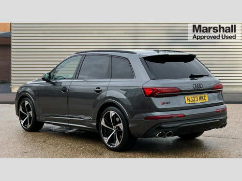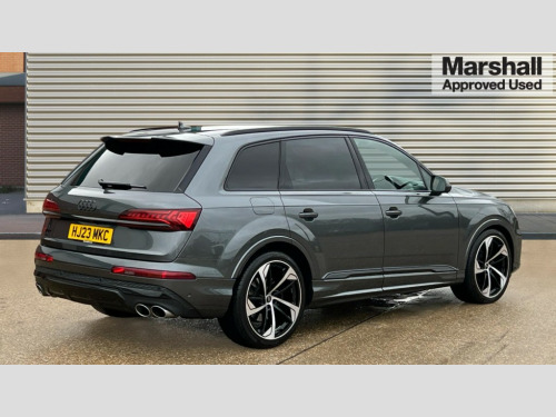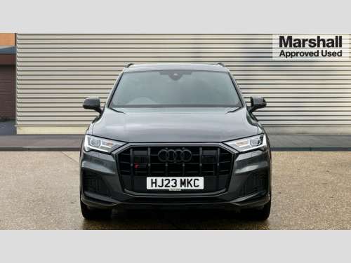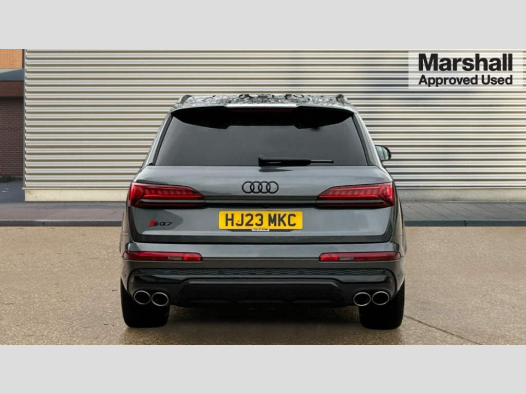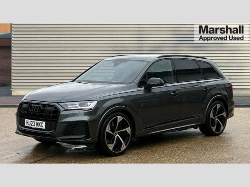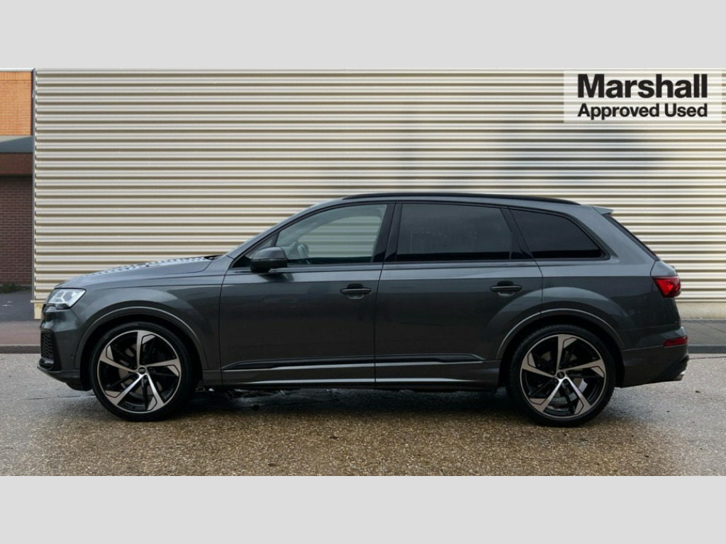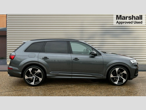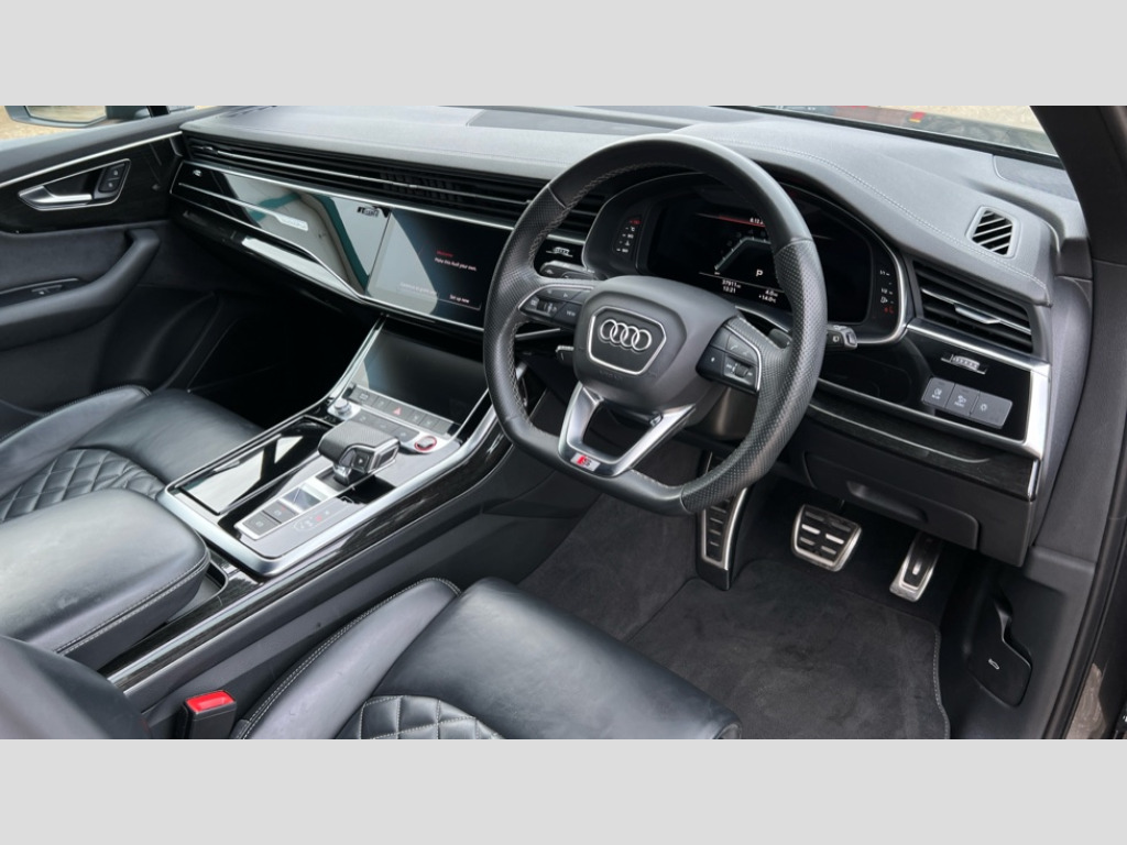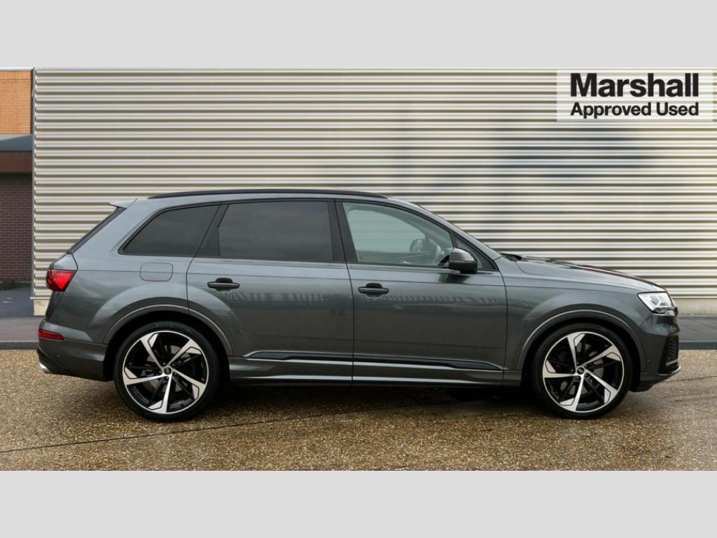 Audi Q7 SQ7 TFSI Quattro Black Edition 5dr Tiptronic All wheel steering, Audi connect safety and service (e-call), Audi connect with Amazon Alexa Integration, Audi drive select (Auto, Comfort, Dynamic, Efficiency, Individual, Off-road and All road), Audi virtual cockpit - 12.3" high-resolution LCD display with fully customisable instrument cluster, Bluetooth interface, Camera based traffic sign recognition, MMI navigation plus with MMI touch screens includes 10.1" and 8.6" screens with haptic feedback, Natural voice recognition, Parking system plus with 360 degree display (front, rear and side sensors) - acoustic and visual park assist system, Power operated tailgate, Rear view camera, Smartphone interface includes wireless Apple carplay/Android Auto, Start/stop system, 48V Mild hybrid technology, 85 litre fuel tank, Quattro all wheel drive with self locking centre differential, S specific adaptive air sport suspension, Audi music interface - front 2 USB-C ports with charger and data functions, Audi sound system with 6 channel amplifier, 180 watt amplifying capacity and 10 loudspeakers including subwoofer, DAB digital radio module, 3rd brake light, Audi Beam uses LEDs to project Audi logo onto the ground as you exit your SQ7, Auto dimming frameless rear view mirror, Black roof rails, Dark tinted Matrix LED headlights with dynamic front and rear indicators, Electrically adj heated/folding + automatically dimming exterior mirrors with memory + automatic kerb side function for passenger side exterior mirror, Gloss black finish for exterior Audi rings and SQ7 logos, Heat insulating glass in windshield, Integrated LED indications in door mirrors, LED daytime running lights, LED rear tail lights, Privacy glass - dark tinted rear and rear side windows from B-pillar backwards, Rear side wing doors, Rear wiper, S front and rear bumpers, S specific rear bumper with 4 exhaust pipes, 2 seat bench in 3rd row, 3 seat bench in 2nd row, 3 spoke heated leather multi-function steering wheel including paddle shift, 4 zone deluxe automatic climate control, 7 seat layout with ISOFIX points for the front passenger seat and rear passenger seat, Black cloth headlining, Comfort front centre armrest, Electric adjustable front seats/backrest bolsters, lumbar support, memory functionality, Folding rear seats, Front head restraints, Front/rear floor mats, Heated front seats, Illuminated door sill trims with S logo, LED interior ambient lighting, Luggage compartment cover, Luggage compartment sill protection in stainless steel, Rear head restraints, Single front passenger seat, Stainless steel pedals, Sunvisors with illuminated vanity mirrors, Valcona leather upholstery with front super sport seat S embossed logo, Anthracite black styling pack - Q7/SQ7, 3 point seatbelts on all rear seats, Audi pre sense front, Child locks on rear doors, Driver and front passenger, front side and curtain airbags, Electromechanical parking brake, Electronic Stabilisation Control (ESC) including ABS, ASR and EDL, Extended pedestrian protection measures, Hill hold assist, Seatbelt monitoring, Tyre pressure loss indicator, Warning triangle and first aid kit, Anti theft alarm, Anti-theft wheel bolts and wheel loosening detection, Keyless Go, Remote central locking, Polished oak trim with grey finish inlay, 22" 5 arm trapezoid design audi sport alloy wheels in anthracite black with gloss turned finish, Tool kit, Tyre repair kit