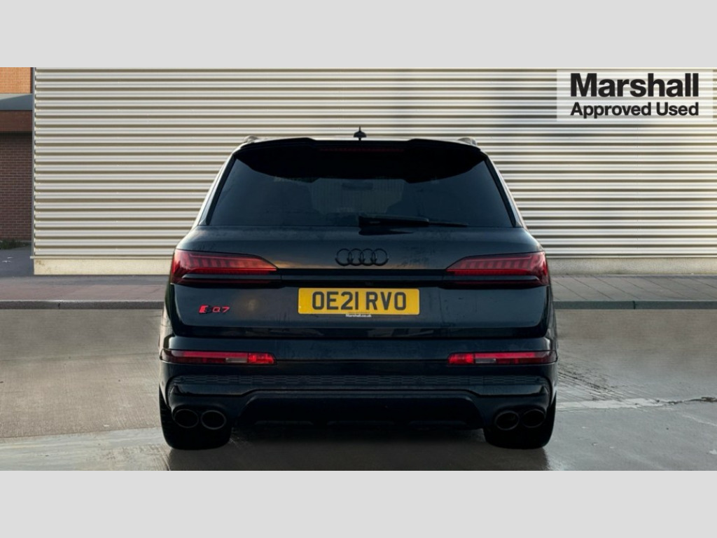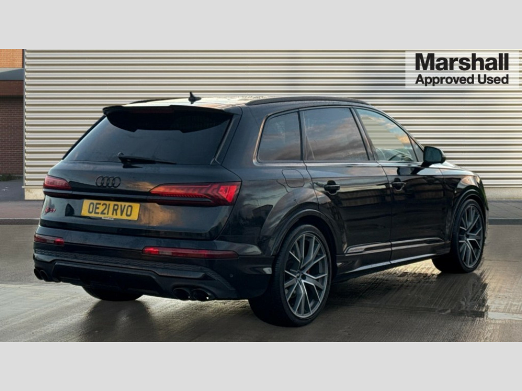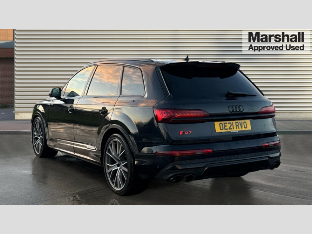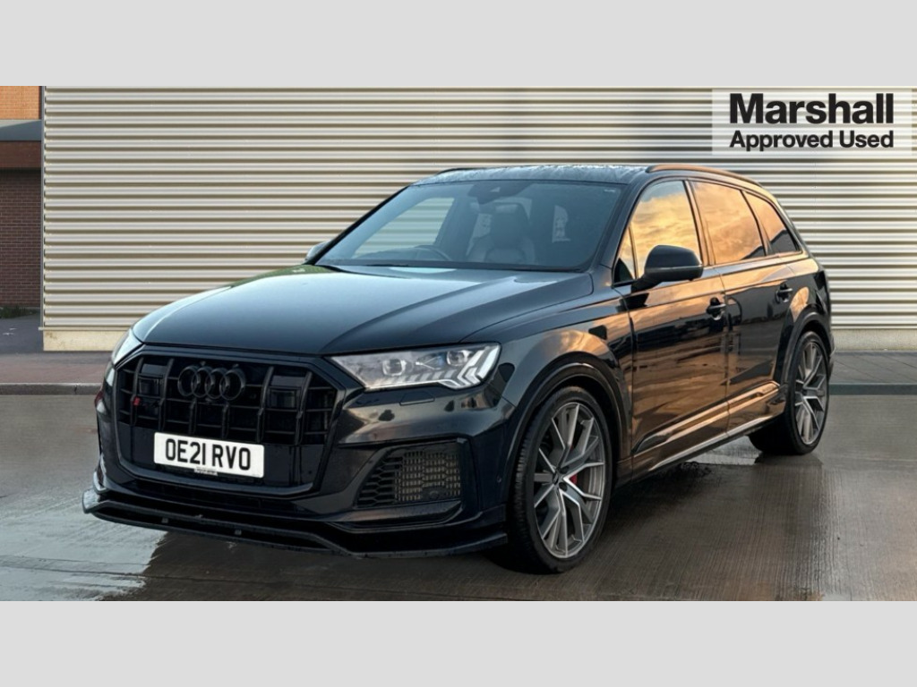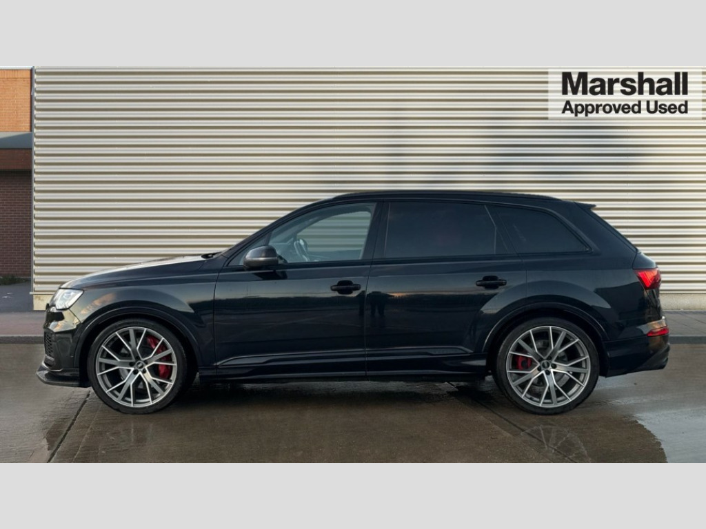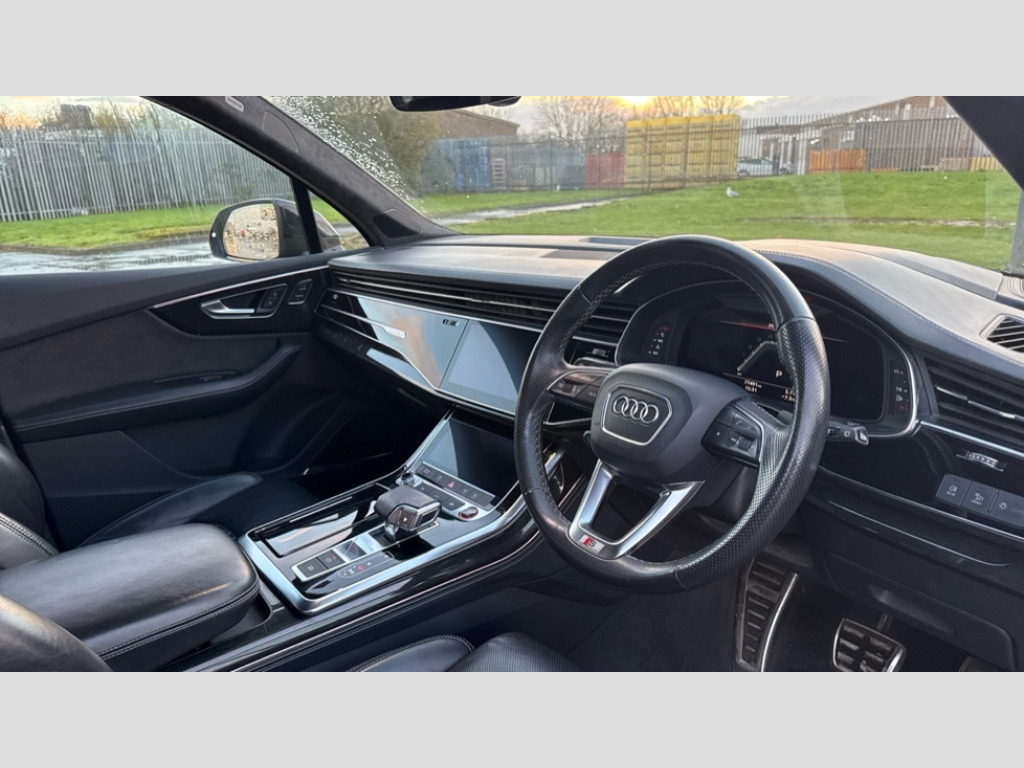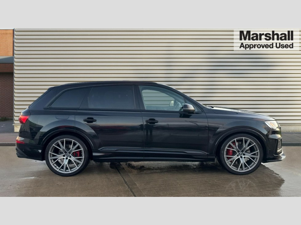 Audi Q7 SQ7 TFSI Quattro Vorsprung 5dr Tiptronic All wheel steering, Audi connect safety and service (e-call), Audi drive select (Auto, Comfort, Dynamic, Efficiency, Individual, Off-road and All road), Audi phone box with wireless charging, Audi virtual cockpit - 12.3" high-resolution LCD display with fully customisable instrument cluster, Camera based traffic sign recognition, Head up Display, MMI navigation plus with MMI touch screens includes 10.1" and 8.6" screens with haptic feedback, Natural voice recognition, Power door closure, Power operated tailgate, Smartphone interface includes wireless Apple carplay/Android Auto, Start/stop system, 48V Mild hybrid technology, 85 litre fuel tank, Quattro all wheel drive with self locking centre differential, S specific adaptive air sport suspension, 2 USB-C ports with charging functionality in the rear, Audi music interface - front 2 USB-C ports with charger and data functions, DAB digital radio module, Audi Beam uses LEDs to project Audi logo onto the ground as you exit your SQ7, Audi HD matrix LED headlights with Audi laser light + dynamic front and rear indicators, Auto dimming frameless rear view mirror, Black roof rails, Electric panoramic glass sunroof, Electrically adj heated/folding + automatically dimming exterior mirrors with memory + automatic kerb side function for passenger side exterior mirror, Gloss black finish for exterior Audi rings and SQ7 logos, Headlight washers, Heat insulating glass in windshield, Integrated LED indications in door mirrors, LED daytime running lights, LED rear tail lights, Privacy glass - dark tinted rear and rear side windows from B-pillar backwards, S front and rear bumpers, S specific rear bumper with 4 exhaust pipes, 3 spoke heated leather multi-function sport steering including paddle shift, 4 zone deluxe automatic climate control, 7 seat layout with ISOFIX points for the front passenger seat and rear passenger seat, Black Alcantara headlining, Comfort front centre armrest, Double sun visors with illuminated vanity mirrors, Folding rear seats, Front head restraints, Front/rear floor mats, Heated front and outer rear seats for second row, Illuminated door sill trims with S logo, Manual sunblind for the rear side windows and manual sunblind for the rear window, Rear head restraints, Seat ventilation and massage function in the front, Stainless steel pedals, Valcona leather upholstery with front super sport seat + S embossed, electric adj front seats/backrest bolsters, lumbar support, memory functionality, City assist pack - Q7, Comfort and sound pack with Bang + Olufsen premium sound system - Q7, Extended leather pack - SQ7, Titanium black styling pack - Q7/SQ7, Tour pack with Adaptive cruise assist - Q7, 3 point seatbelts on all rear seats, Audi pre sense front, Driver and front passenger, front side and curtain airbags, Electromechanical parking brake, Electronic Stabilisation Control (ESC) including ABS, ASR and EDL, Extended pedestrian protection measures, Hill hold assist, Seatbelt monitoring, Tyre pressure loss indicator, Warning triangle and first aid kit, Anti theft alarm, Anti-theft wheel bolts and wheel loosening detection, Remote central locking, Polished oak trim with grey finish inlay, Tool kit, Tyre repair kit