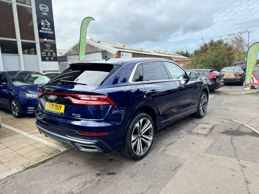Beautiful Audi Q8 3.0 TDI V6 50 S line Tiptronic quattro in excellent condition. Top Specs, Navigation , Heated Seats, 360 Camera ,Panoramic Sun Roof ,Apple Car Pay/Android Auto ,Smart Phone Charger, Parking Sensors, Electric Windows, Electric Side Mirrors, Climate Control, Steering Control, Cruise Control, Bluetooth Connection, Aux Connection, Alloys, Isofix,Arm Rest and many more...., Great Mpg, cheap to Tax and Insure. ULEZ compliant, 3 Previous Owners & 2 Keys. The car has been very well looked after and comes with FULL-Service history/ 2 NEW TYRES. We had it serviced recently at 95700 miles on 27/10/2025 . It has also been MOTed till 26/10/2026 with no advisory. 3 Months essential warranty with Customer Protect is also included for your peace of mind. It is in very good condition and drives very smoothly with no fault whatsoever. ALL OUR CARS ARE FULLY INSPECTED BY PROFESSIONALS PRIOR TO ADVERTISEMENT & COME WITH 12 MONTHS FREE BASIC AA BREAKDOWN COVER. Finance is also available on request. DRIVE-AWAY INSURANCE IS ALSO AVAILABLE AT A COST. TO VIEW MORE STOCK PLEASE VISIT OUR WEBSITE AT: WWW.MEGAMOTORSUK.CO.UK , in alloy wheels - 5-segment-spoke design, 48 volt mild hybrid technology, ami - audi music interface, adaptive air sport suspension, airbags - driver, airbags - front curtain, airbags - front passenger, aluminium window trims, anti theft locking wheel bolts and wheel loosening detection, anti-theft alarm with tow-away protection, audi connect, audi connect safety and service, audi drive select, audi hd matrix led headlights, audi phone box with wireless charging, audi pre-sense front, audi smartphone interface, audi sound system, audi virtual cockpit, auto dimming and frameless rear view mirror, cloth headlining in black, comfort front centre armrest, coming-leaving home animations in front and rear, cruise control with speed limiter, dab digital radio, deluxe 2-zone electronic climate control, door mirrors - heated-electrically adjustable-folding and auto dimming with memory function, esc - electronic stabilisation control inc abs - asr and edl, electric windows - front and rear, electrically adjustable front seats with memory function for drivers side, electromechanical parking brake, electromechanical power steering - speed-sensitive provides a precise steering feel at high speeds and excellent assistance when parking., extended pedestrian protection, exterior mirror housings in body colour, first aid kit and warning triangle, front and rear floor mats, front and rear side airbags with head airbag system, headlight washers, heat insulating glass - windscreen, heated front seats, hill descent control, hill hold assist, isofix child seat mounting for the front passenger seat with front passenger airbag deactivation and isofix child seat mounting and top tether for the outer rear seats, illuminated door sill trims with s logo, illuminated sun visors with vanity mirrors, inlays - darkened matt brushed aluminium, keyless go with remote central locking, led interior ambient lighting pack, lane departure warning, leather gear lever, light and rain sensor, luggage compartment sill protection in stainless steel, mmi navigation plus with mmi touch, natural voice recognition, operating buttons in black - glass look with haptic feedback, parking system plus - front and rear sensors, pedals in stainless steel, power operated tailgate, privacy glass, rear-view camera, s line badges on the front wings, s line body styling, s line styling, s line front and rear bumpers - air inlets - door trim strips, seat belt monitoring, seats - split folding rear - 40-20-40, signature led daytime-running lights, steering wheel - 3-spoke leather multi-function with shift paddles, tool kit, tyre pressure loss indicator, tyre repair kit, quattro all-wheel drive, bang and olufsen premium sound system, 22in alloy wheels - 5-parallel-spoke design - contrasting grey - partly polished, panoramic glass sunroof, leather-alcantara - sport seats with s embossed logo - black with grey stitching