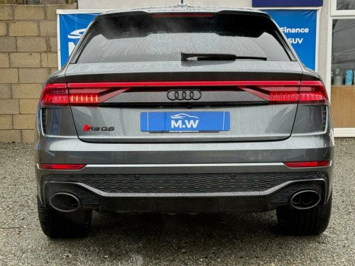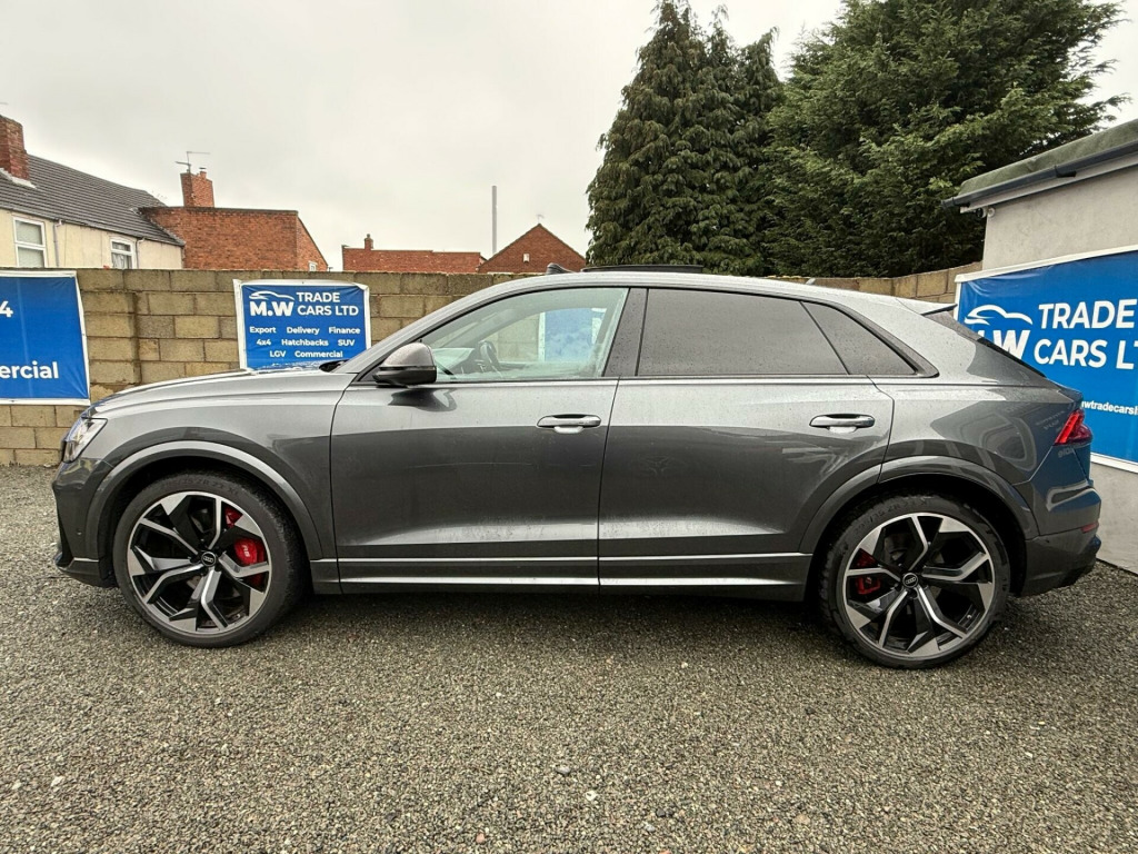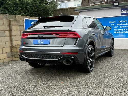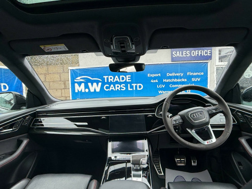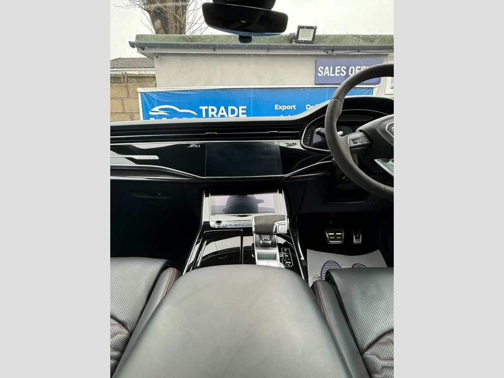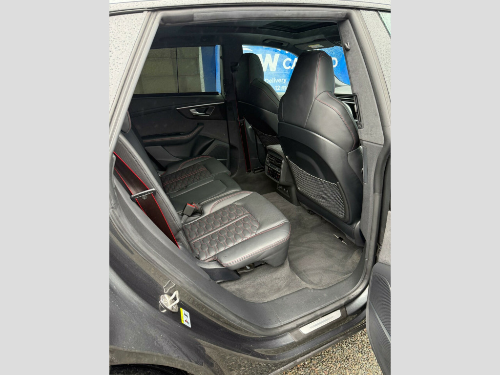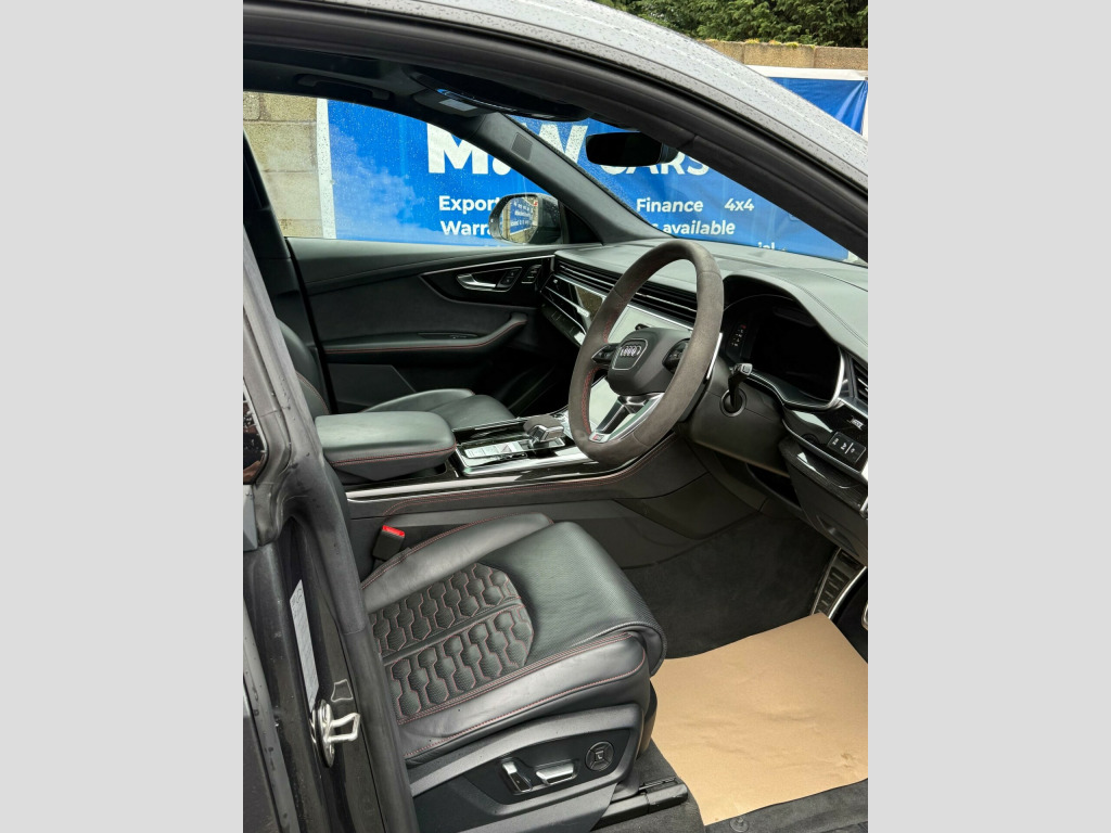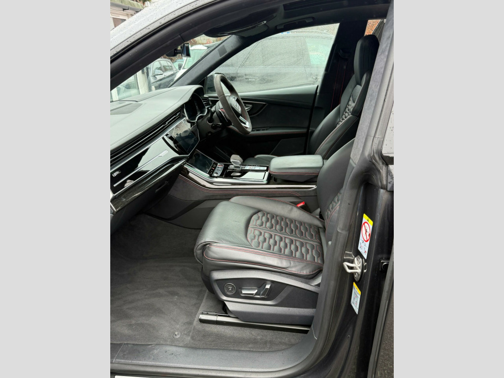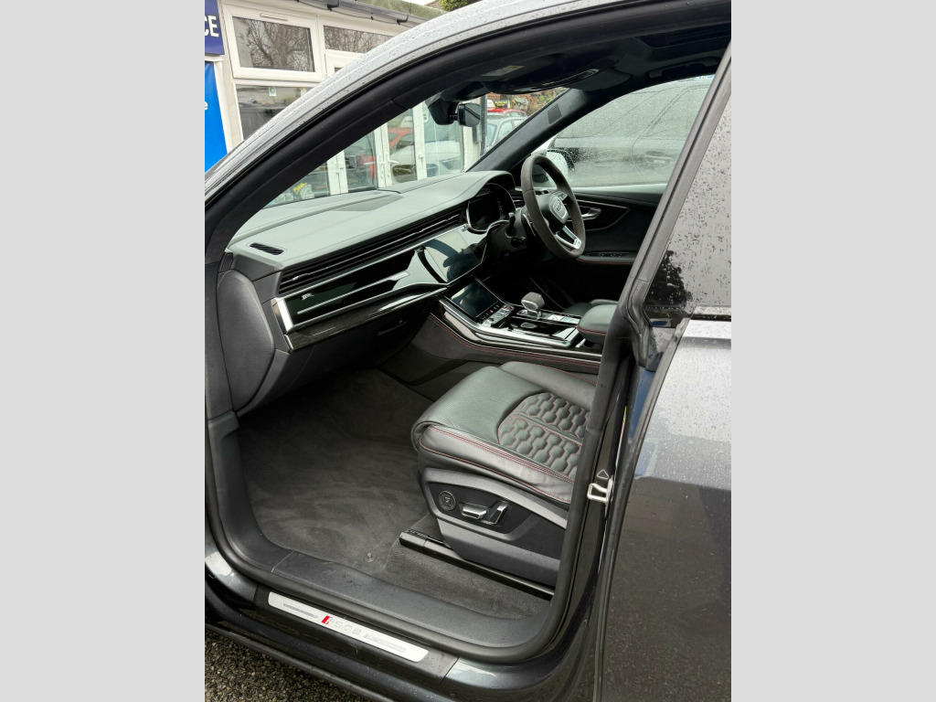 This 2023 Audi RSQ8 TFSI V8 Vorsprung boasts a full dealership service history, with its last service completed on 12 January 2026 at 24,000 miles, and has had only one owner from new. This impressive performance SUV features a powerful 4.0 litre petrol engine paired with a four wheel drive drivetrain, meeting Euro 6 emission standards. It offers a substantial towing weight of 3500 kg and benefits from a large boot space, making it both capable and practical. Notable features include Advanced Key with keyless entry, a Comfort and Sound Package with parking assistance and a 360 degree camera, and a Tour Pack with adaptive cruise control. The driver and front passenger seats offer memory functions for their electrically adjustable positions, complemented by Audi HD Matrix LED headlights in RS specific design with dynamic front and rear indicators.The Audi RSQ8 TFSI V8 Vorsprung stands out with its remarkable acceleration, achieving 0-62mph in just 3.8 seconds, a performance that places it ahead of many comparable vehicles. The inclusion of features like the 360 degree camera and adaptive cruise control enhances the driving experience, offering greater convenience and safety. The heated seats and memory function for the front seats provide exceptional comfort for all journeys, while the advanced LED lighting system ensures excellent visibility. This combination of potent performance, advanced technology, and thoughtful features makes this particular RSQ8 a compelling choice for those seeking a premium and capable SUV. usb-c ports with charging functionality in the rear, 23in alloy wheels - 5-y-spoke rotor design - gloss anthracite black with diamond finish, 4-way lumbar support for front seats, 4-zone automatic air conditioning, ami - audi music interface, adaptive windscreen wipers with integrated washer jets, advanced key, air quality pack, all-wheel steering, anthracite black door mirrors, anthracite black styling pack, anti-theft alarm with tow-away protection, anti-theft wheel bolts and wheel loosening warning, audi beam, audi connect (3 year subscription from new), audi connect safety and service - e-call, audi connect with amazon alexa integration, audi hd matrix led headlights in rs specific design with dynamic front and rear indicators, audi music interface in the rear, audi smartphone interface, audi virtual cockpit - 12.3in high resolution lcd display, auto dimming and frameless rear view mirror, black dinamica headlining, city assist pack, comfort front centre armrest, comfort and sound package, dab digital radio, door mirrors - electrically adjustable - heated - folding - automatically dimming with memory function and integrated led indicators with kerb view function for passenger side, double sun visor, driver - front passenger - front side and curtain airbag system, driver and front passenger memory function for the electrically adjustable front seats, esc - electronic stabilisation control inc abs - asr and edl, electric sunblinds for the rear side windows and manual sunblind for the rear window, electric windows - front, electromechanical active roll stabilisation, electromechanical parking brake, electromechanical power steering, extended led interior lighting package - multi-coloured, exterior audi rings and rs q8 logos with gloss black finish, first aid kit and warning triangle, head-up display, headlight washers, hill descent control, hill hold assist, isofix child seat mounting for front passenger, illuminated door sill trims with rs logo, inlays - polished oak with grey finish, lane departure warning, light and rain sensor, luggage compartment sill protection in stainless steel, mmi navigation plus including mmi touch, natural voice recognition, operating buttons in black - glass look, panoramic glass sunroof, parking system plus with 360 degree display - front - rear and side sensors, pedals in stainless steel, power door closure, power operated tailgate, privacy glass - dark-tinted rear and rear-side windows - from b-pillar backwards, rs 3-spoke heated leather multi-function sport steering wheel with rs mode button, rs adaptive air suspension, rs audi drive select, rs badges on the front wings, rs coming-leaving home animations in front and rear, rs front super sport seats with rs embossed logo in valcona leather, rs manhattan grey front spoiler lip and rear diffuser insert, rs specific bumpers in full body colour, rs specific styling, rs sport exhaust system, rs steel brakes with black calipers with rs logo, rs styling package - grey, rear bench seat plus, seat belt monitoring, seat ventilation and massage function for front seats, signature led daytime-running lights, standard pedestrian protection measures, steering column - electrically adjustable with memory, tool kit, tour pack, tyre pressure loss indicator, tyre repair kit, upper and lower interior elements in leather, windshield with heat insulated glass, quattro all-wheel drive with sport differential