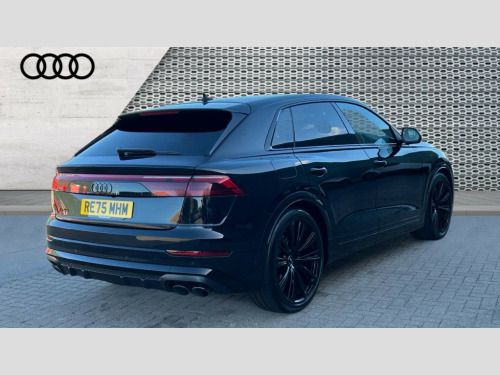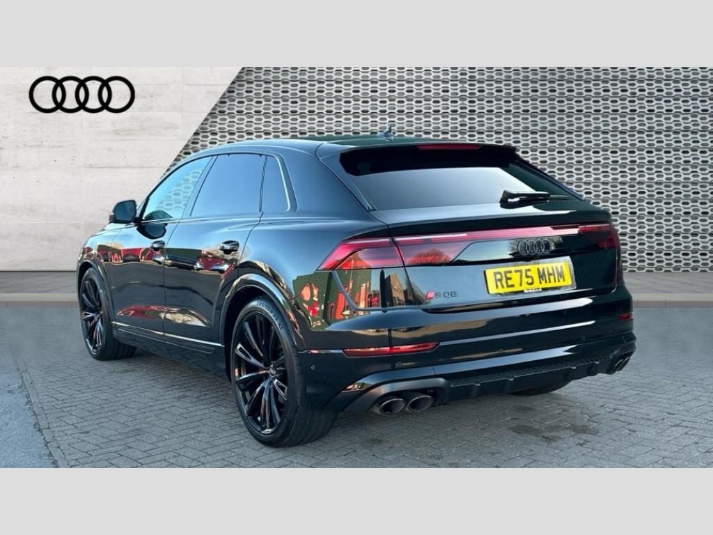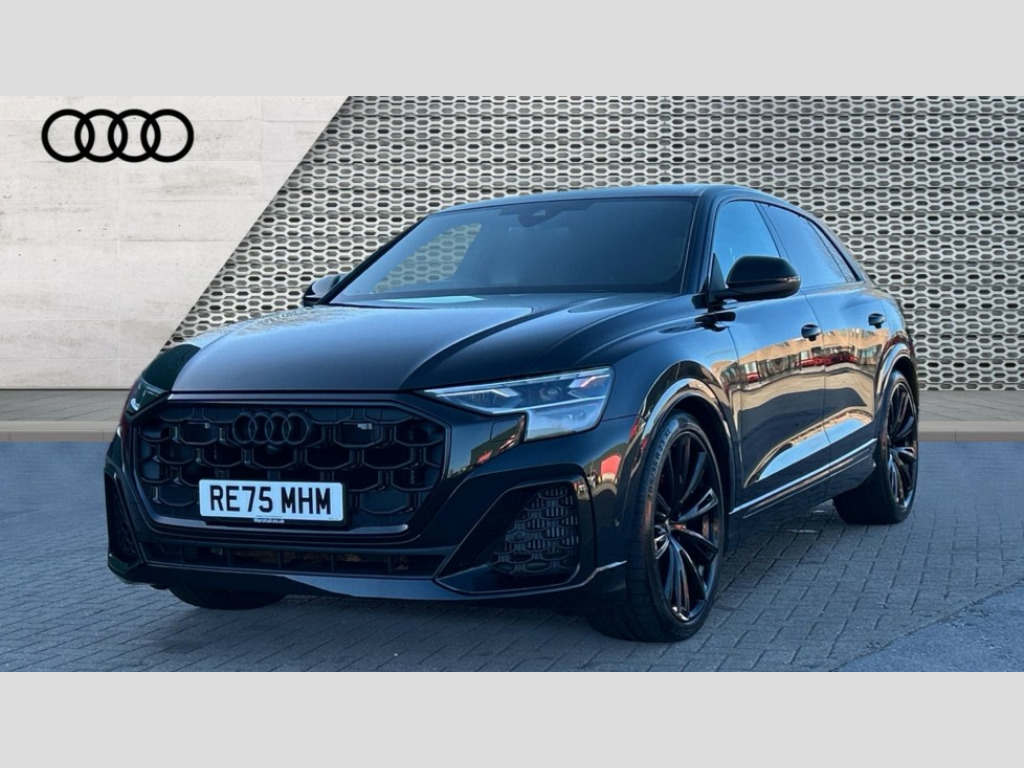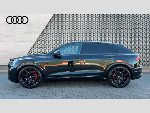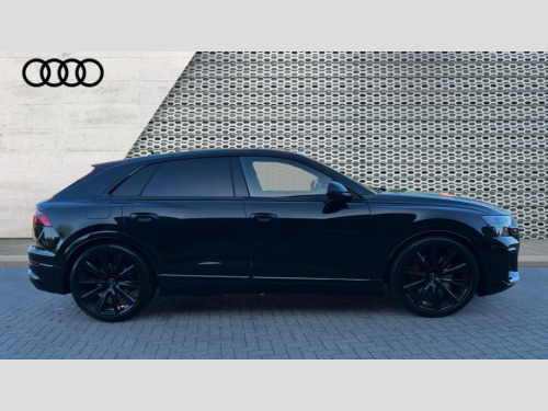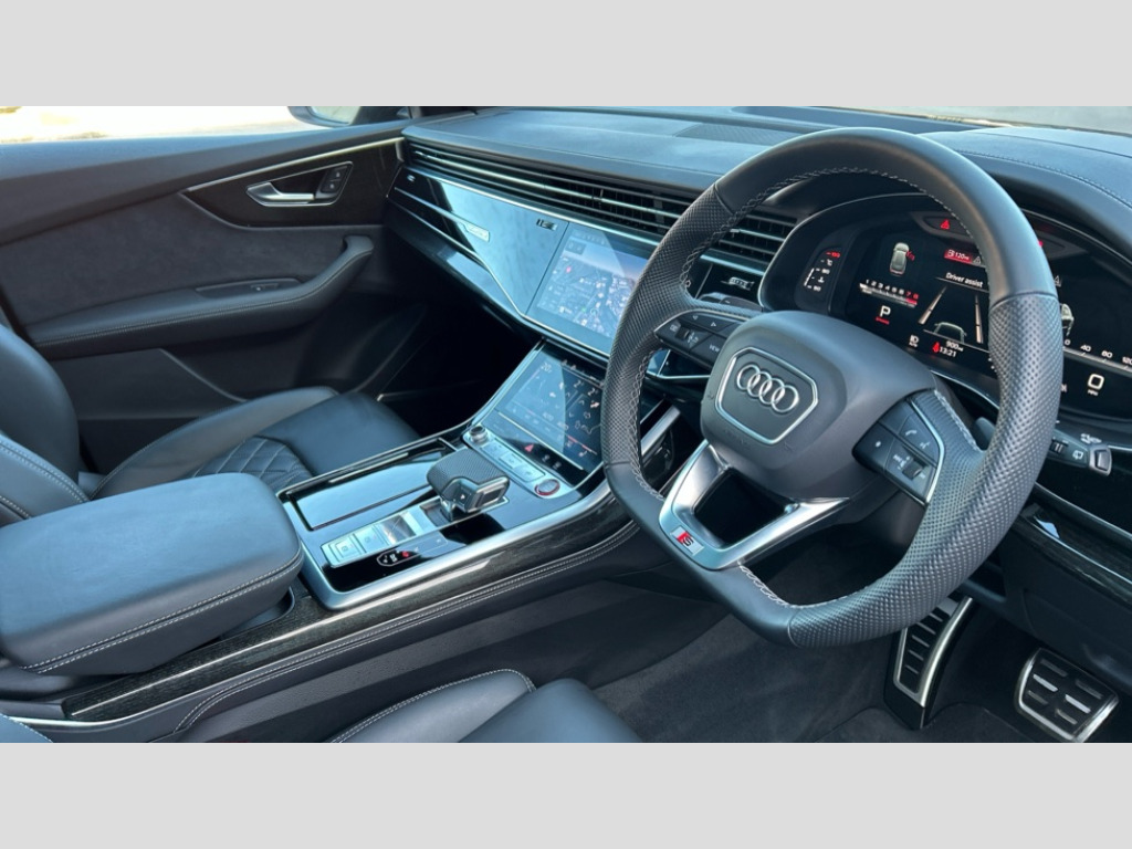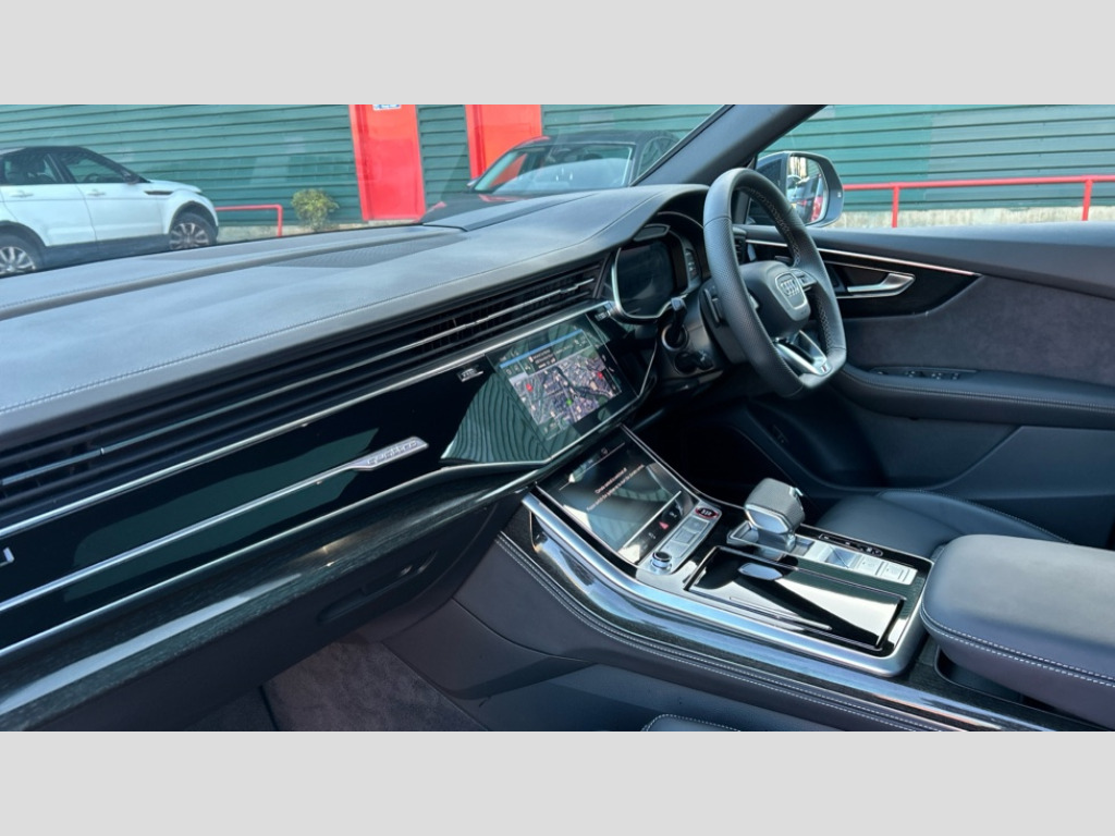 Audi Q8 SQ8 TFSI Quattro 507 Black Edition 5dr Tiptronic 10.1" and 8.6" Dual colour touchscreens, 2 USB C ports with charging functionality in the rear, 360 degree camera with top view, All wheel steering, Audi application store, Audi connect safety and service (e-call), Audi connect with Amazon Alexa Integration, Audi drive select, Audi phone box light with wireless charging, Audi virtual cockpit plus, Automatic start/stop system, Bluetooth, Camera based traffic sign recognition, Collision avoidance assistant, Electro-mechanical PAS, Head up Display, Low washer fluid indicator, MMI navigation plus with MMI touch, Natural voice recognition, On board computer, Operating buttons in black, glass look with haptic feedback, Power door closure, Power operated tailgate, Remote park assist plus, Service interval indicator, Smartphone interface includes wireless Apple carplay/Android Auto, 48V Mild hybrid technology, 85 litre fuel tank, Quattro all wheel drive with self locking centre differential, S specific Adaptive air suspension, Audi music interface with 2 USB ports with charge and data functions, Aux-in socket, Bang + Olufsen sound system, DAB Digital radio, 3rd brake light, Adaptive windscreen wipers with integrated washer jets, Audi beam, Auto dimming frameless rear view mirror, Black single frame mask, Coming/leaving home lighting function, Digital OLED rear combination lamps, Electric front+rear windows, Electric panoramic glass sunroof, Electrically folding auto dimming/adjustable/heated door mirrors with memory function, LED side indicators and kerb view function for passenger side, Headlight washers, Heat insulating glass in windshield, LED rear light plus, LED signature daytime running lights, Loading edge protection in stainless steel, Matrix LED headlights with dynamic front and rear indicators, Platinum grey front spoiler lip and diffuser insert with honeycomb grille in black, Privacy glass - dark tinted rear and rear side windows from B-pillar backwards, Rain and light sensors, Rear side wing doors, Rear wiper, S specific dual brach chrome tailpipes on both the left and right, S specific front and rear bumpers, Singleframe grille surround in matte platinum grey, 3 bench rear seats in 2nd row, 4 zone deluxe automatic climate control, 4-way lumbar support for front seats, 40:20:40 split folding rear bench seat, Black dinamica headlining, Black leather instrument panel and centre console band with rock grey contrast stitching, artificial leather door armrest with contrast stitching, Comfort front centre armrest, Double sun visor with illuminated vanity mirror on driver and passenger side extendable, Driver seat memory function, Electric luggage compartment cover, Electric sunblind for the rear side windows and manual sunblind for the rear window, Electrically adjustable front seats, Front head restraints, Front/rear floor mats, Heated front and outer rear seats, ISOFIX child seat mounting for front passenger seat and 2 outer rear seats with top tether child seat mounting for all 3 rear seats, Luggage compartment sill protection in stainless steel, Massage and ventilation function for front seats, Power adjustable steering wheel, Rear centre armrest with 2 cupholders, Rear headrests, Seat cushion displaceable by 100mm in the ratio 60:40, Single front passenger seat, Stainless steel pedals, Valcona leather upholstery + front super sport seats with S embossed logo, Ambient lighting package plus - Q8, Black styling pack plus - SQ8, Multi coloured extended LED Interior lighting pack - Q8, 3 point seatbelts on all seats, Audi pre sense front, Convenience key with safelock, Driver and front passenger, front side and curtain airbags, Electromechanical parking brake, Electronic Stability Control (ESC) including ABS, ASR and EDL, Front passenger airbag deactivation, Hill descent control, Hill hold assist, Predictive pedestrian protection, Seatbelt monitoring, Traction control, Tyre pressure loss indicator, Warning triangle and first aid kit, Anti theft alarm with tow away protection, Anti-theft wheel bolts and wheel loosening detection, Electronically operated child lock, Immobiliser, Keyless go with remote central locking, Polished oak trim with grey finish inlay, Tool kit, Tyre repair kit