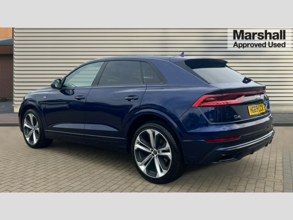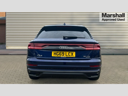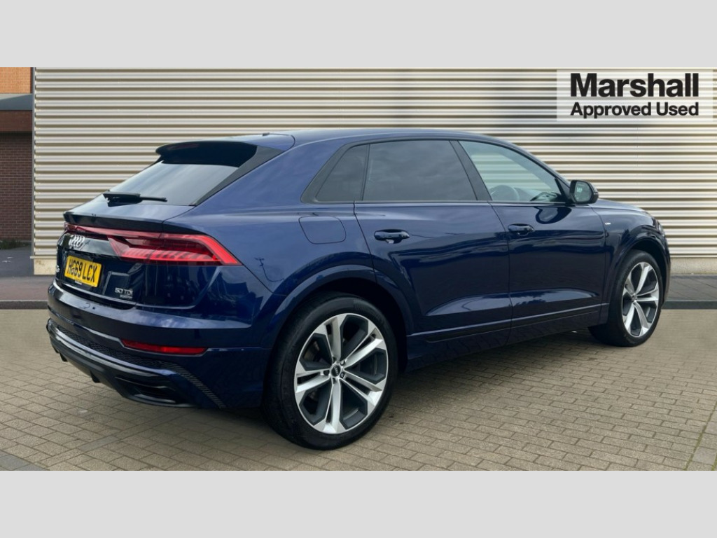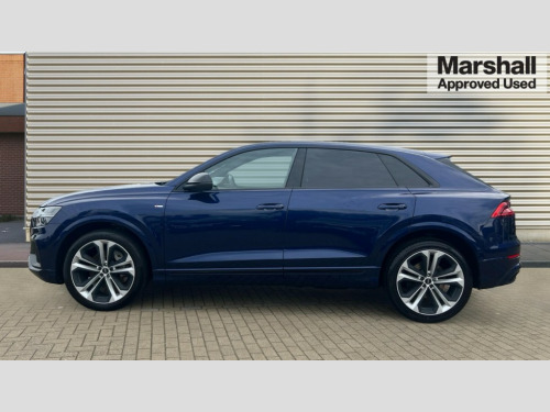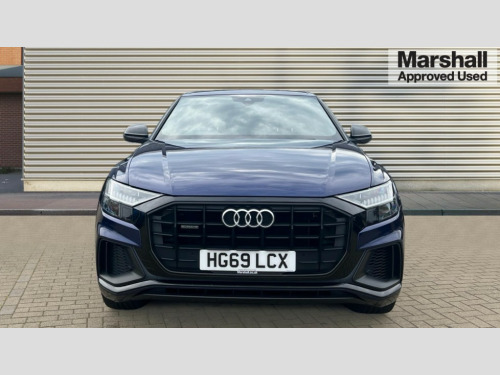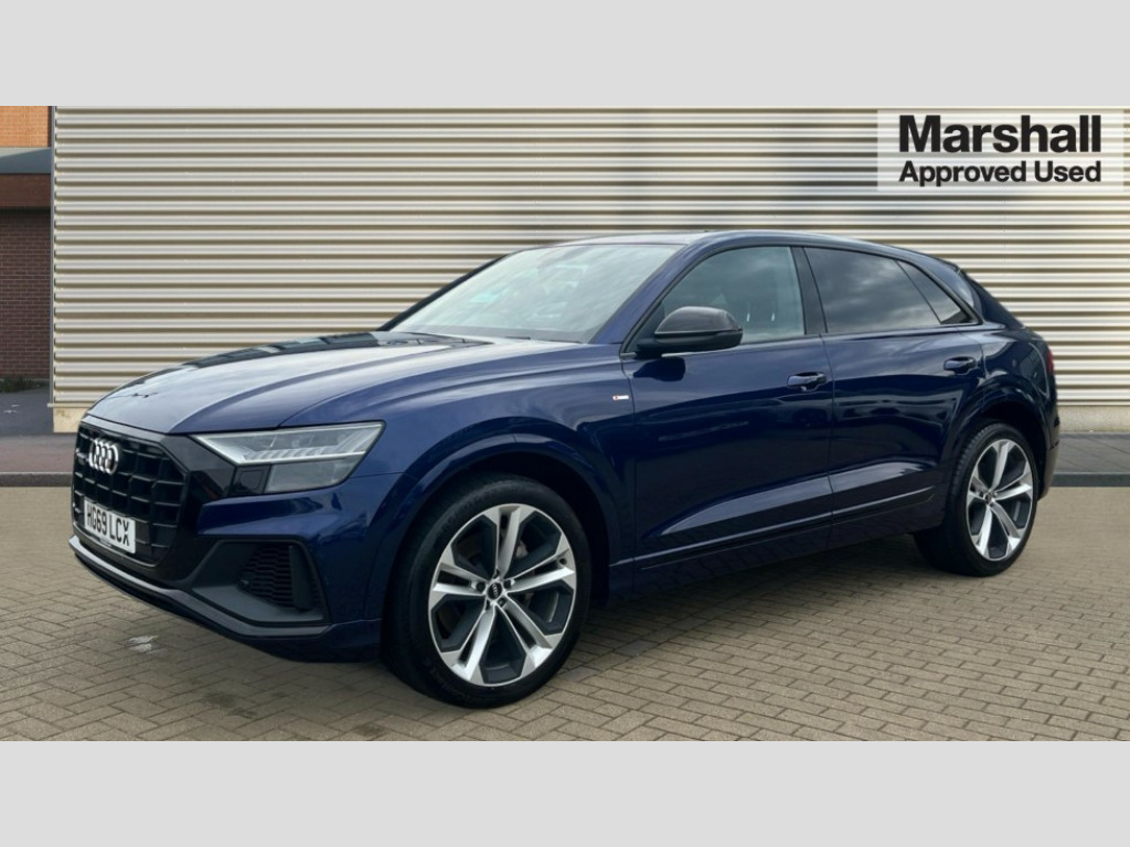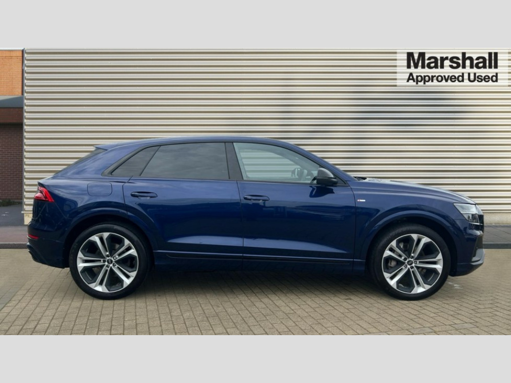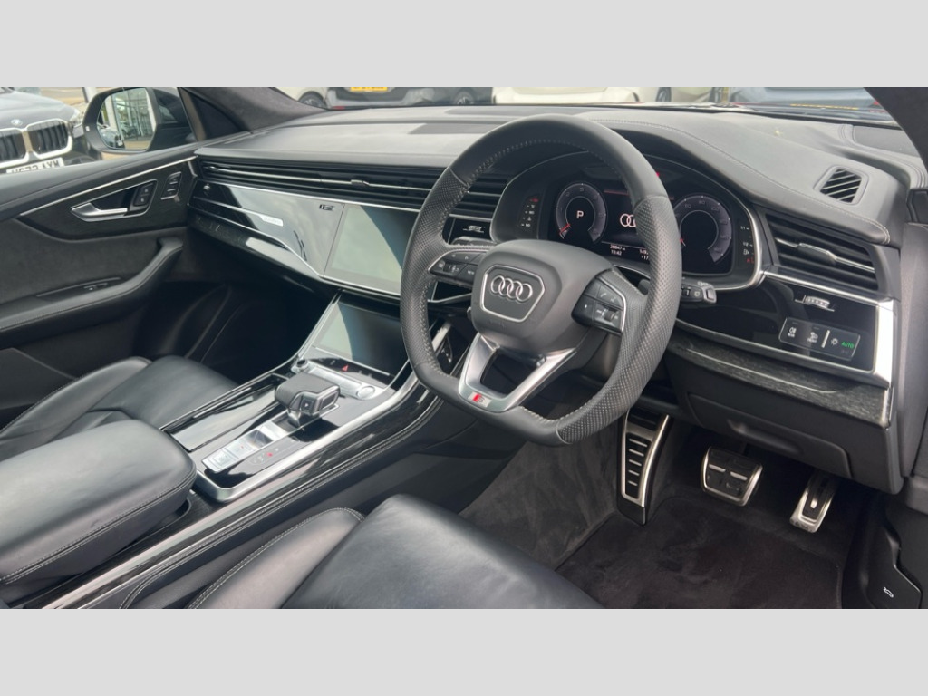 Audi Q8 50 TDI Quattro Edition 1 5dr Tiptronic 10.1" and 8.6" Dual colour touchscreens, Audi connect safety and service (e-call), Audi drive select, Audi parking system plus with front and rear sensors, Audi phone box with wireless charging, Audi smartphone interface, Audi virtual cockpit plus, Automatic start/stop system, Electro-mechanical PAS, Low washer fluid indicator, MMI - Multi Media Interface control system, MMI navigation plus with MMI touch, Natural voice recognition, On board computer, Operating buttons in black, glass look with haptic feedback, Power operated tailgate, Rear view camera, Service interval indicator, Adaptive air suspension, Diesel particulate filter, Audi music interface with 2 USB ports with charge and data functions in the rear, Audi sound system with 6 channel amplifier, 180 watt amplifying capacity and 10 loudspeakers including subwoofer, Aux-in socket, DAB Digital radio, Acoustic windscreen, Audi Beam uses LEDs to project the Audi Sport logo, Audi HD Matrix LED headlights with dynamic front and rear indicators, Auto dimming frameless rear view mirror, Coming/leaving home lighting function, Electric front+rear windows, Electric panoramic glass sunroof, Electrically adjustable/heated/folding/auto dimming door mirrors with integrated LED indications + kerb view function for passenger side, Headlight washers, Heat insulating glass in windshield, LED signature daytime running lights, Platinum grey front spoiler lip and diffuser insert with honeycomb grille in black, Privacy glass - dark tinted rear and rear side windows from B-pillar backwards, Rain and light sensors, Rear wiper, S line side ventilation grille, 3 spoke flat bottomed high multi-function leather sport steering wheel with gearshift paddles, 4 zone deluxe automatic climate control, 4-way lumbar support for front seats, 40:20:40 split folding rear bench seat, Black Alcantara headlining, Comfort front centre armrest, Double sun visor with illuminated vanity mirror on driver and passenger side extendable, Driver and front passenger seat memory function for electrically adjustable front seats, Electric sunblind for the rear side windows and manual sunblind for the rear window, Front head restraints, Front/rear floor mats, Heated front and outer rear seats, ISOFIX child seat mounting for front passenger seat and 2 outer rear seats with top tether child seat mounting for all 3 rear seats, LED interior ambient lighting, Luggage compartment sill protection in stainless steel, Rear centre armrest with 2 cupholders, Rear headrests, Rear seat bench plus, Self-locking centre differential, Stainless steel pedals, Extended leather pack - Q8, Titanium Black Styling Pack - Q8, 3 point seatbelts on all seats, Audi pre sense front, Driver and front passenger, front side and curtain airbags, Electromechanical parking brake, Electronic Stability Control (ESC) including ABS, ASR and EDL, Front passenger airbag deactivation, Hill descent control, Hill hold assist, Predictive pedestrian protection, Seatbelt monitoring, Traction control, Tyre pressure loss indicator, Warning triangle and first aid kit, Anti theft alarm with tow away protection, Anti-theft wheel bolts and wheel loosening detection, Immobiliser, Keyless go with remote central locking, Polished oak trim with grey finish inlay, Tool kit, Tyre repair kit