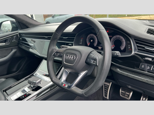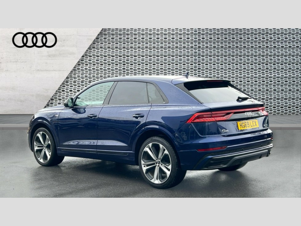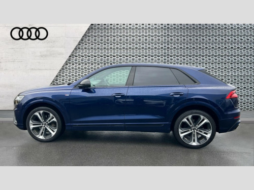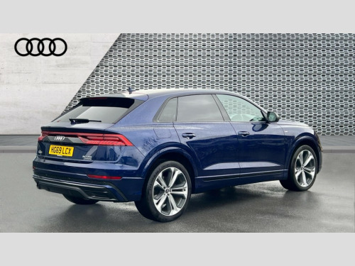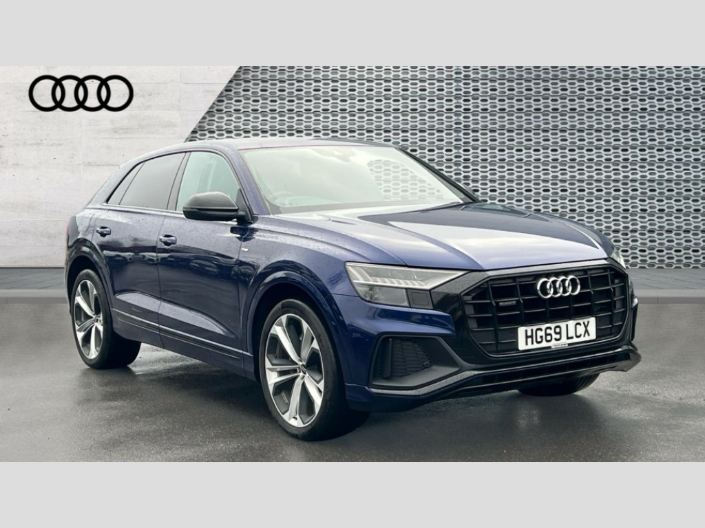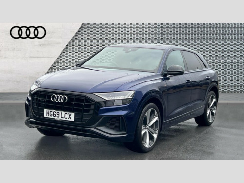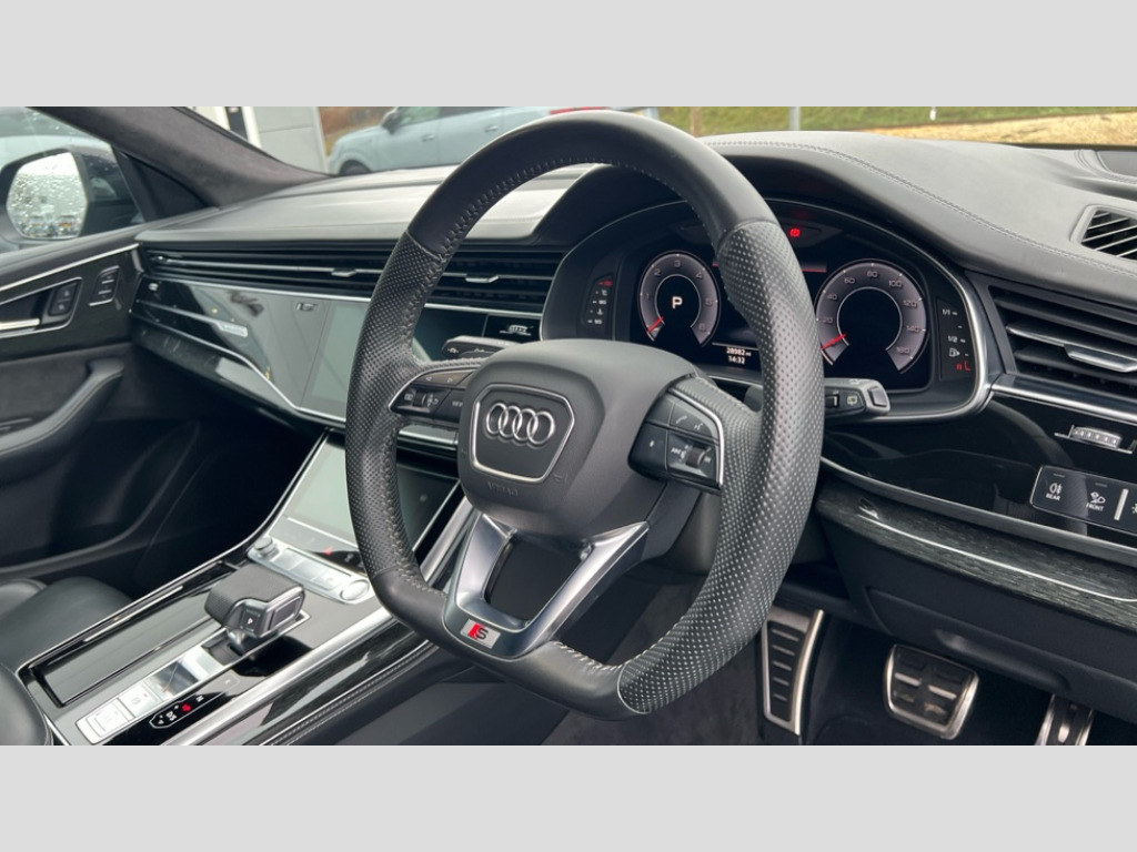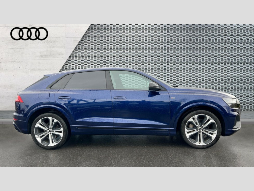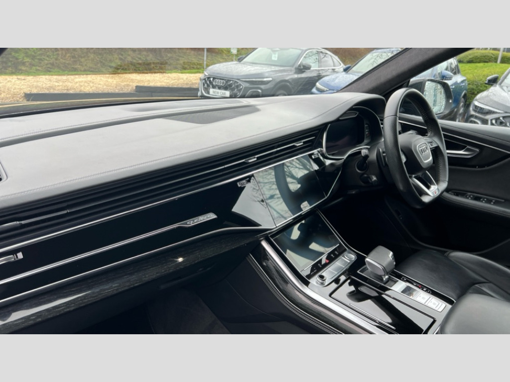 Audi Q8 50 TDI Quattro Edition 1 5dr Tiptronic 10.1" and 8.6" Dual colour touchscreens, Audi connect safety and service (e-call), Audi drive select, Audi parking system plus with front and rear sensors, Audi phone box with wireless charging, Audi smartphone interface, Audi virtual cockpit plus, Automatic start/stop system, Electro-mechanical PAS, Low washer fluid indicator, MMI - Multi Media Interface control system, MMI navigation plus with MMI touch, Natural voice recognition, On board computer, Operating buttons in black, glass look with haptic feedback, Power operated tailgate, Rear view camera, Service interval indicator, Adaptive air suspension, Diesel particulate filter, Audi music interface with 2 USB ports with charge and data functions in the rear, Audi sound system with 6 channel amplifier, 180 watt amplifying capacity and 10 loudspeakers including subwoofer, Aux-in socket, DAB Digital radio, Acoustic windscreen, Audi Beam uses LEDs to project the Audi Sport logo, Audi HD Matrix LED headlights with dynamic front and rear indicators, Auto dimming frameless rear view mirror, Coming/leaving home lighting function, Electric front+rear windows, Electric panoramic glass sunroof, Electrically adjustable/heated/folding/auto dimming door mirrors with integrated LED indications + kerb view function for passenger side, Headlight washers, Heat insulating glass in windshield, LED signature daytime running lights, Platinum grey front spoiler lip and diffuser insert with honeycomb grille in black, Privacy glass - dark tinted rear and rear side windows from B-pillar backwards, Rain and light sensors, Rear wiper, S line side ventilation grille, 3 spoke flat bottomed high multi-function leather sport steering wheel with gearshift paddles, 4 zone deluxe automatic climate control, 4-way lumbar support for front seats, 40:20:40 split folding rear bench seat, Black Alcantara headlining, Comfort front centre armrest, Double sun visor with illuminated vanity mirror on driver and passenger side extendable, Driver and front passenger seat memory function for electrically adjustable front seats, Electric sunblind for the rear side windows and manual sunblind for the rear window, Front head restraints, Front/rear floor mats, Heated front and outer rear seats, ISOFIX child seat mounting for front passenger seat and 2 outer rear seats with top tether child seat mounting for all 3 rear seats, LED interior ambient lighting, Luggage compartment sill protection in stainless steel, Rear centre armrest with 2 cupholders, Rear headrests, Rear seat bench plus, Self-locking centre differential, Stainless steel pedals, Extended leather pack - Q8, Titanium Black Styling Pack - Q8, 3 point seatbelts on all seats, Audi pre sense front, Driver and front passenger, front side and curtain airbags, Electromechanical parking brake, Electronic Stability Control (ESC) including ABS, ASR and EDL, Front passenger airbag deactivation, Hill descent control, Hill hold assist, Predictive pedestrian protection, Seatbelt monitoring, Traction control, Tyre pressure loss indicator, Warning triangle and first aid kit, Anti theft alarm with tow away protection, Anti-theft wheel bolts and wheel loosening detection, Immobiliser, Keyless go with remote central locking, Polished oak trim with grey finish inlay, Tool kit, Tyre repair kit