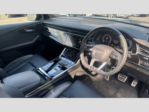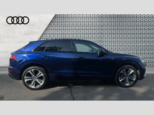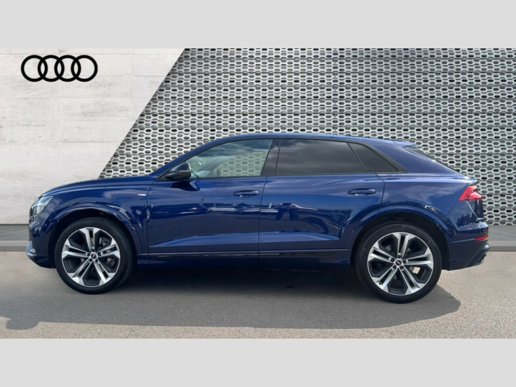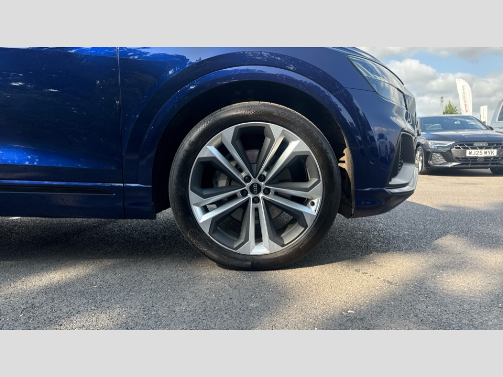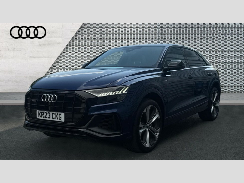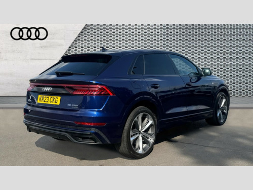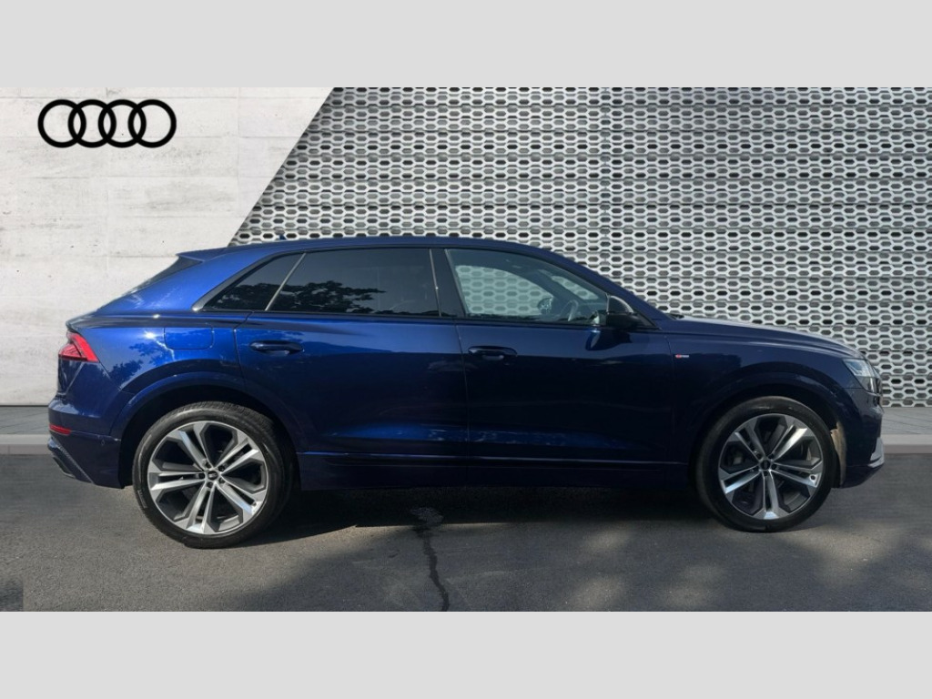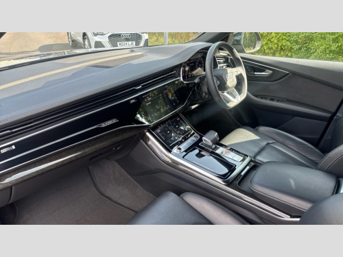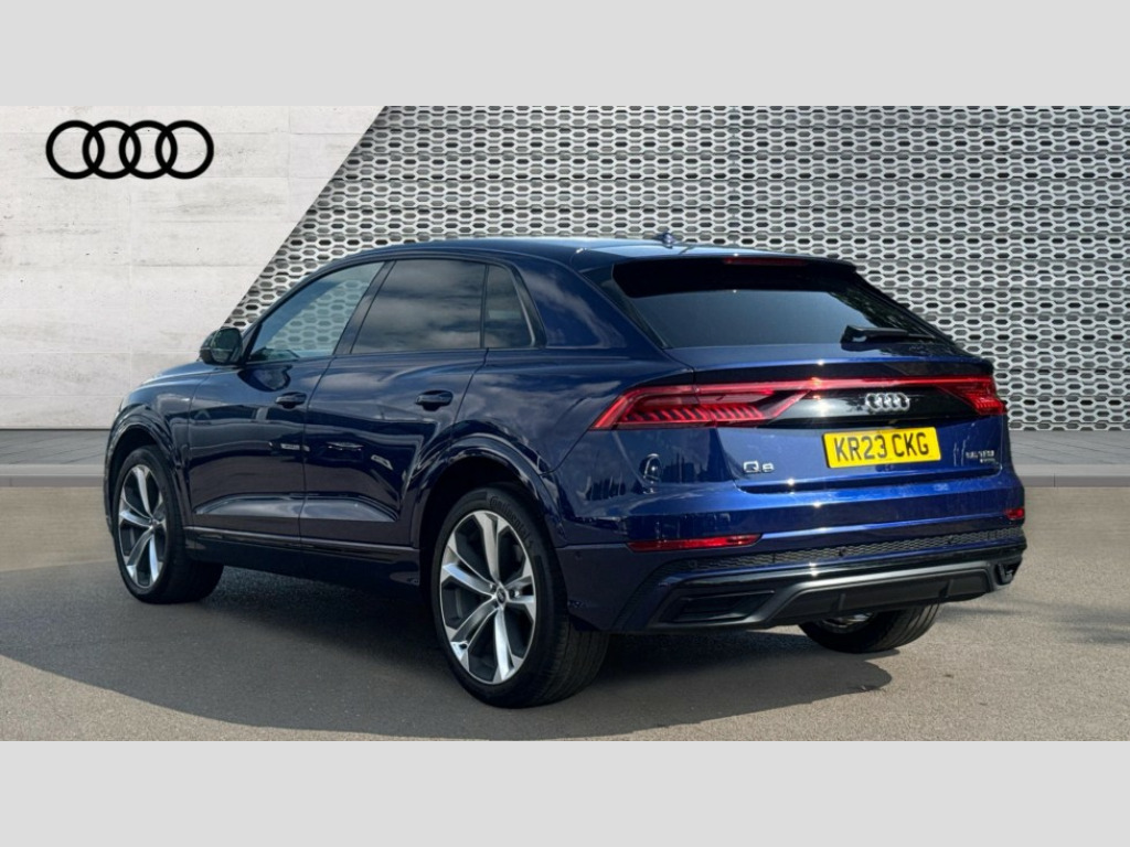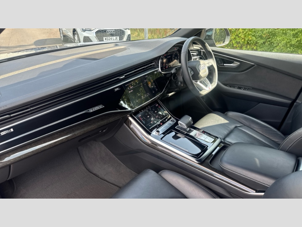 Audi Q8 55 TFSI Quattro Black Edition 5dr Tiptronic 10.1" and 8.6" Dual colour touchscreens, Audi connect safety and service (e-call), Audi connect with Amazon Alexa Integration, Audi drive select, Audi parking system plus includes 360 degree display with front and rear sensors, Audi phone box light with wireless charging, Audi virtual cockpit - 12.3" high resolution LCD display with fully customisable instrument cluster, Automatic start/stop system, Electro-mechanical PAS, Low washer fluid indicator, MMI - Multi Media Interface control system, MMI navigation plus with MMI touch, Natural voice recognition, On board computer, Operating buttons in black, glass look with haptic feedback, Power operated tailgate, Rear view camera, Service interval indicator, Smartphone interface includes wireless Apple carplay/Android Auto, 48V Mild hybrid technology, 85 litre fuel tank, Adaptive sport air suspension, Quattro all wheel drive with self locking centre differential, Audi music interface with 2 USB ports with charge and data functions, Audi sound system with 6 channel amplifier, 180 watt amplifying capacity and 10 loudspeakers including subwoofer, Aux-in socket, DAB Digital radio, 3rd brake light, Acoustic windscreen, Aluminium window trim, Audi beam, Audi HD Matrix LED headlights with dynamic front and rear indicators, Auto dimming frameless rear view mirror, Black Audi rings and black badging, Coming/leaving home lighting function, Electric front+rear windows, Electrically folding auto dimming/adjustable/heated door mirrors with memory function, LED side indicators and kerb view function for passenger side, Headlight washers, Heat insulating glass in windshield, LED signature daytime running lights, Platinum grey front spoiler lip and diffuser insert with honeycomb grille in black, Privacy glass - dark tinted rear and rear side windows from B-pillar backwards, Rain and light sensors, Rear side wing doors, Rear wiper, 2 zone automatic climate control, 3 bench rear seats in 2nd row, 4-way lumbar support for front seats, 40:20:40 split folding rear bench seat, Audi phone box light, Black cloth headlining, Comfort front centre armrest, Driver seat memory function, Electrically adjustable front seats, Front head restraints, Front/rear floor mats, Heated front seats, ISOFIX child seat mounting for front passenger seat and 2 outer rear seats with top tether child seat mounting for all 3 rear seats, LED interior ambient lighting, Luggage compartment sill protection in stainless steel, Rear centre armrest with 2 cupholders, Rear headrests, Seat cushion displaceable by 100mm in the ratio 60:40, Single front passenger seat, Stainless steel pedals, Sunvisors with illuminated vanity mirrors, 3 point seatbelts on all seats, Audi pre sense front, Child locks on rear doors, Driver and front passenger, front side and curtain airbags, Electromechanical parking brake, Electronic Stability Control (ESC) including ABS, ASR and EDL, Front passenger airbag deactivation, Hill descent control, Hill hold assist, Predictive pedestrian protection, Seatbelt monitoring, Traction control, Tyre pressure loss indicator, Warning triangle and first aid kit, Anti theft alarm with tow away protection, Anti-theft wheel bolts and wheel loosening detection, Immobiliser, Keyless go with remote central locking, Polished oak trim with grey finish inlay, Tool kit, Tyre repair kit