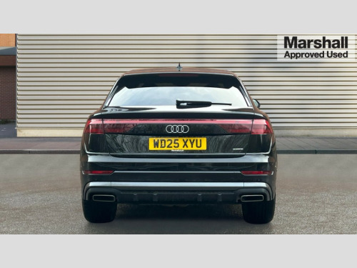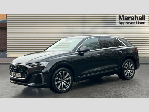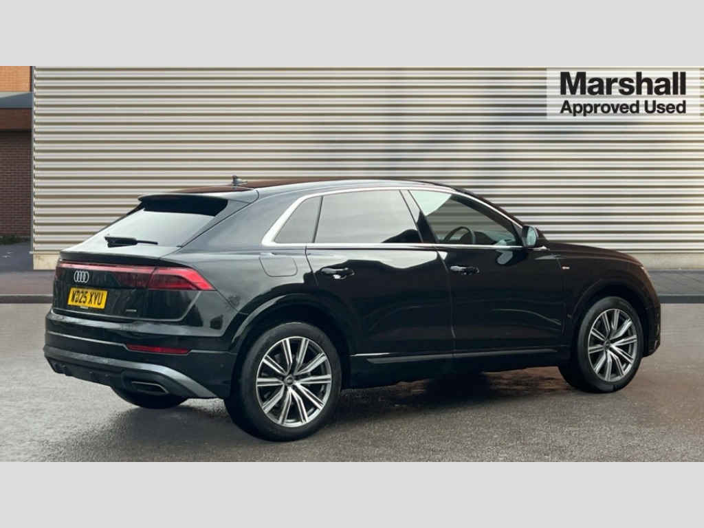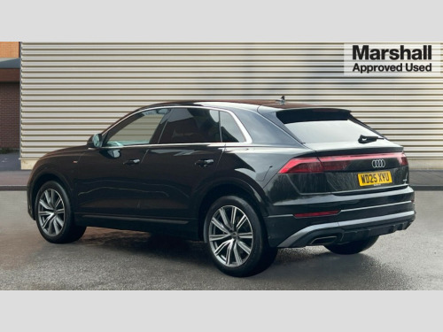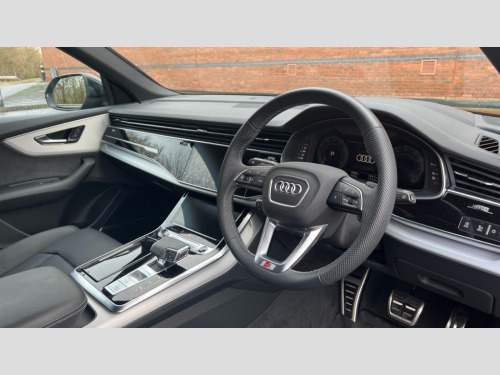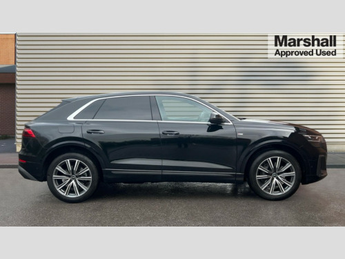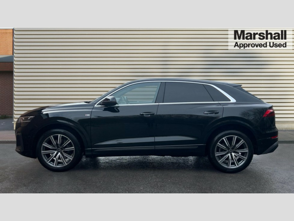 Audi Q8 55 TFSI Quattro S Line 5dr Tiptronic 10.1" and 8.6" Dual colour touchscreens, Audi application store, Audi connect safety and service (e-call), Audi connect with Amazon Alexa Integration, Audi drive select, Audi parking system plus includes 360 degree display with front and rear sensors, Audi phone box light with wireless charging, Audi virtual cockpit - 12.3" high resolution LCD display with fully customisable instrument cluster, Automatic start/stop system, Bluetooth, Electro-mechanical PAS, Low washer fluid indicator, MMI navigation plus with MMI touch, Natural voice recognition, On board computer, Operating buttons in black, glass look with haptic feedback, Power operated tailgate, Rear view camera, Service interval indicator, Smartphone interface includes wireless Apple carplay/Android Auto, 48V Mild hybrid technology, 85 litre fuel tank, Adaptive sport air suspension, Quattro all wheel drive with self locking centre differential, Audi music interface with 2 USB ports with charge and data functions, Audi sound system with 6 channel amplifier, 180 watt amplifying capacity and 10 loudspeakers including subwoofer, Aux-in socket, DAB Digital radio, 3rd brake light, Aluminium window trim, Auto dimming frameless rear view mirror, Body colour door mirrors, Coming/leaving home lighting function, Electric front+rear windows, Electrically folding auto dimming/adjustable/heated door mirrors with memory function, LED side indicators and kerb view function for passenger side, Headlight washers, Heat insulating glass in windshield, Illuminated door sill trims with S line logo, LED rear light plus, LED signature daytime running lights, Loading edge protection in stainless steel, Matrix LED headlights with dynamic front and rear indicators, Platinum grey front spoiler lip and diffuser insert with honeycomb grille in black, Privacy glass - dark tinted rear and rear side windows from B-pillar backwards, Rain and light sensors, Rear side wing doors, Rear wiper, S line badges on front wings, S Line body styling, S line bumpers in full body colour paint finish, S line roof spoiler, S Line side skirts, S line side ventilation grille, Singleframe grille surround in matte platinum grey, 2 zone automatic climate control, 3 bench rear seats in 2nd row, 4-way lumbar support for front seats, 40:20:40 split folding rear bench seat, Black cloth headlining, Comfort front centre armrest, Driver seat memory function, Electrically adjustable front seats, Front head restraints, Front/rear floor mats, Heated front seats, ISOFIX child seat mounting for front passenger seat and 2 outer rear seats with top tether child seat mounting for all 3 rear seats, LED interior ambient lighting, Luggage compartment sill protection in stainless steel, Rear centre armrest with 2 cupholders, Rear headrests, Seat cushion displaceable by 100mm in the ratio 60:40, Single front passenger seat, Stainless steel pedals, Sunvisors with illuminated vanity mirrors, 3 point seatbelts on all seats, Audi pre sense front, Convenience key with safelock, Driver and front passenger, front side and curtain airbags, Electromechanical parking brake, Electronic Stability Control (ESC) including ABS, ASR and EDL, Front passenger airbag deactivation, Hill descent control, Hill hold assist, Predictive pedestrian protection, Seatbelt monitoring, Traction control, Tyre pressure loss indicator, Warning triangle and first aid kit, Anti theft alarm with tow away protection, Anti-theft wheel bolts and wheel loosening detection, Electronically operated child lock, Immobiliser, Keyless go with remote central locking, Dark matt brushed aluminium inlay, Tool kit, Tyre repair kit