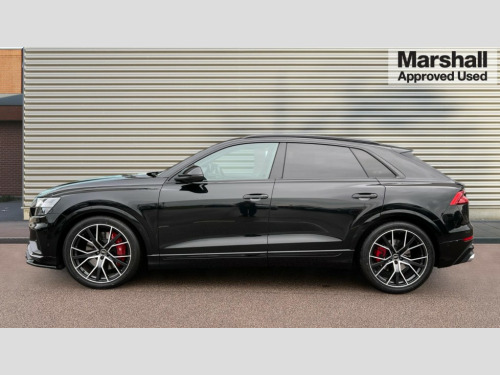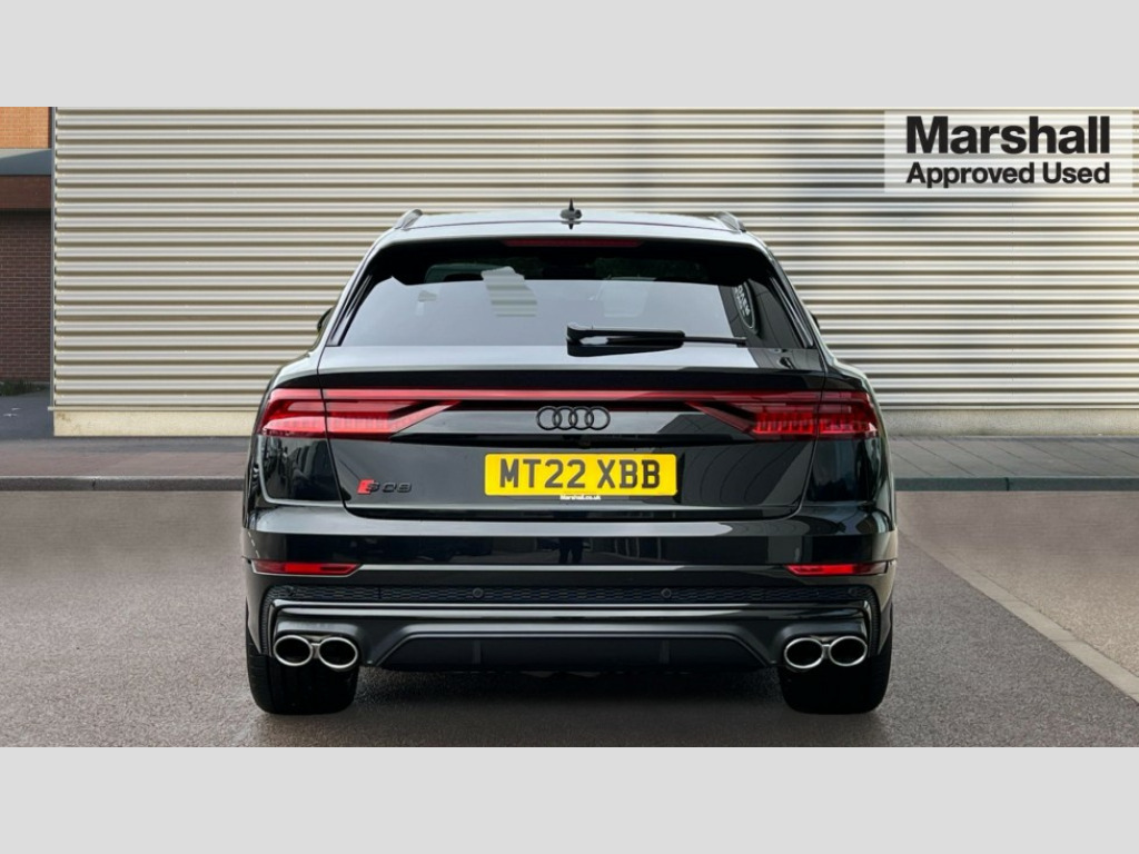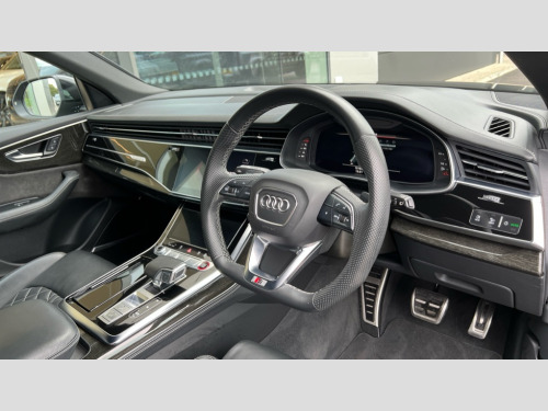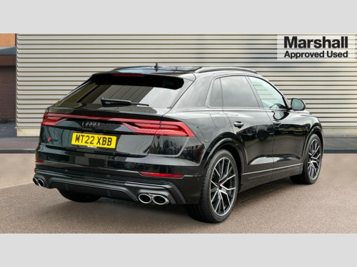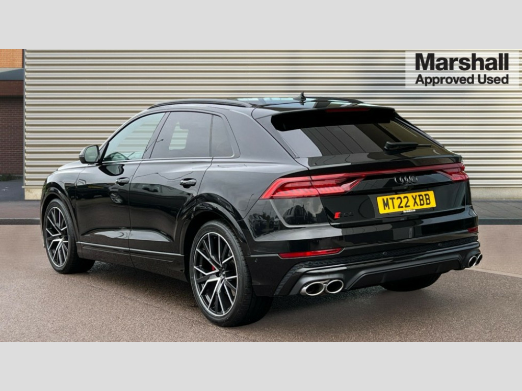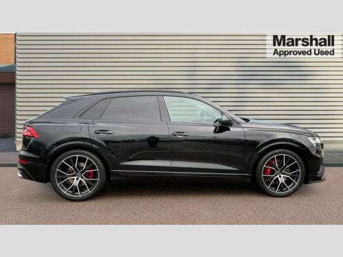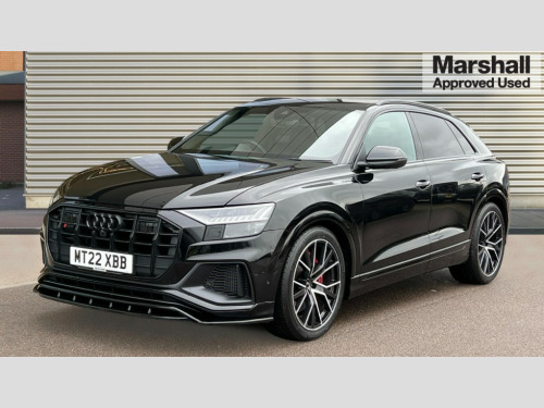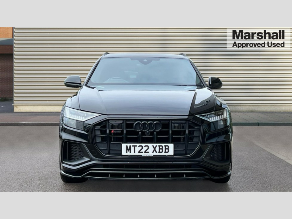 Audi Q8 SQ8 TFSI Quattro Black Edition 5dr Tiptronic 10.1" and 8.6" Dual colour touchscreens, All wheel steering, Audi connect safety and service (e-call), Audi connect with Amazon Alexa Integration, Audi drive select, Audi parking system plus includes 360 degree display with front and rear sensors, Audi virtual cockpit - 12.3" high resolution LCD display with fully customisable instrument cluster, Automatic start/stop system, Electro-mechanical PAS, Low washer fluid indicator, MMI - Multi Media Interface control system, MMI navigation plus with MMI touch, Natural voice recognition, On board computer, Operating buttons in black, glass look with haptic feedback, Power operated tailgate, Rear view camera, Service interval indicator, Smartphone interface includes wireless Apple carplay/Android Auto, 48V Mild hybrid technology, 85 litre fuel tank, Quattro all wheel drive with self locking centre differential, S specific Adaptive air suspension, Audi music interface with 2 USB ports with charge and data functions, Audi sound system with 6 channel amplifier, 180 watt amplifying capacity and 10 loudspeakers including subwoofer, Aux-in socket, DAB Digital radio, 3rd brake light, Acoustic windscreen, Audi Beam uses LEDs to project the Audi logo, Audi HD Matrix LED headlights with dynamic front and rear indicators, Auto dimming frameless rear view mirror, Body coloured bumpers, Coming/leaving home lighting function, Electric front+rear windows, Electrically folding auto dimming/adjustable/heated door mirrors with memory function, LED side indicators and kerb view function for passenger side, Gloss black finish for exterior Audi rings and SQ8 logo, Headlight washers, Heat insulating glass in windshield, LED signature daytime running lights, Platinum grey front spoiler lip and diffuser insert, Privacy glass - dark tinted rear and rear side windows from B-pillar backwards, Rain and light sensors, Rear side wing doors, Rear wiper, S specific dual brach chrome tailpipes on both the left and right, S specific front and rear bumpers, S specific side skirts in matt selenite silver, Side air inlet grilles in matt titanium black, Trim and underbody protection in matt selenite silver, 4 zone deluxe automatic climate control, 4-way lumbar support for front seats, 40:20:40 split folding rear bench seat, Black cloth headlining, Comfort front centre armrest, Driver seat memory function, Electrically adjustable front seats, Front head restraints, Front/rear floor mats, Heated front seats, Illuminated door sill trims, ISOFIX child seat mounting for front passenger seat and 2 outer rear seats with top tether child seat mounting for all 3 rear seats, LED interior ambient lighting, Luggage compartment sill protection in stainless steel, Rear centre armrest with 2 cupholders, Rear headrests, Rear seat bench plus, Single front passenger seat, Stainless steel pedals, Sunvisors with illuminated vanity mirrors, Upper and lower interior elements in leather, leather door armrests, Valcona leather upholstery + super sports seats with S embossed logo, Titanium Black Styling Pack - Q8, 3 point seatbelts on all seats, Audi pre sense front, Child locks on rear doors, Driver and front passenger, front side and curtain airbags, Electromechanical parking brake, Electronic Stability Control (ESC) including ABS, ASR and EDL, Front passenger airbag deactivation, Hill descent control, Hill hold assist, Predictive pedestrian protection, Seatbelt monitoring, Traction control, Tyre pressure loss indicator, Warning triangle and first aid kit, Anti theft alarm with tow away protection, Anti-theft wheel bolts and wheel loosening detection, Immobiliser, Keyless go with remote central locking, Polished oak trim with grey finish inlay, Tool kit, Tyre repair kit