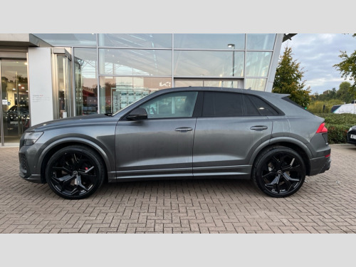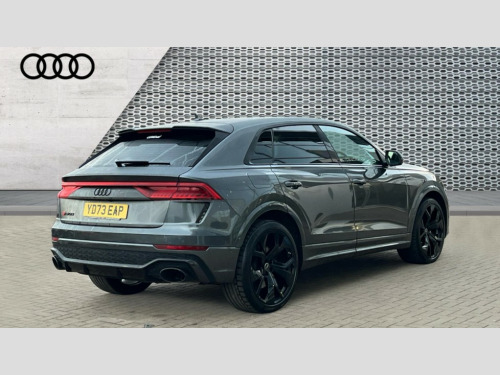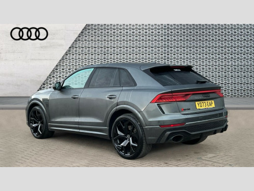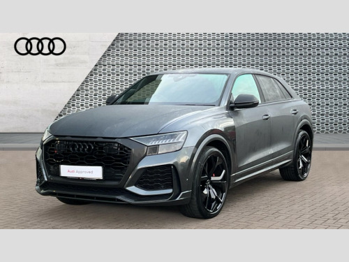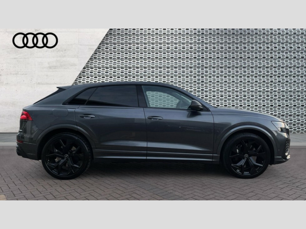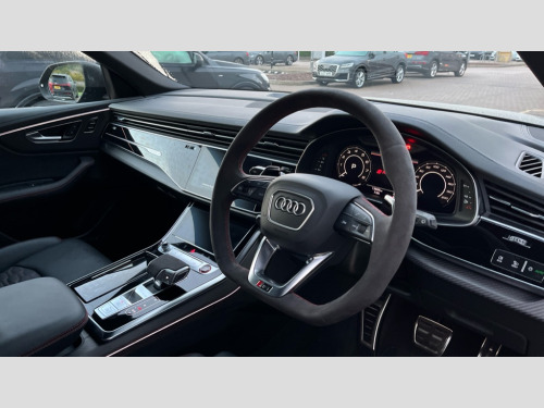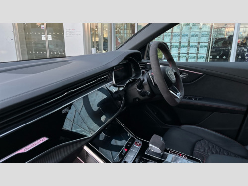 Audi Rs Q8 RS Q8 TFSI Quattro Carbon Black 5dr Tiptronic 10.1" and 8.6" Dual colour touchscreens, All wheel steering, Audi connect safety and service (e-call), Audi connect with Amazon Alexa Integration, Audi parking system plus includes 360 degree display with front and rear sensors, Audi virtual cockpit - 12.3" high resolution LCD display with fully customisable instrument cluster and RS specific menus and options, Automatic start/stop system, Bluetooth interface, Electro-mechanical PAS, MMI navigation plus with MMI touch, Natural voice recognition, On board computer, Operating buttons in black, glass look with haptic feedback, Power operated tailgate, Rear view camera, RS Audi drive select, Service interval indicator, Smartphone interface includes wireless Apple carplay/Android Auto, 48V Mild hybrid technology, Electromechanical active roll stabilisation, Quattro all wheel drive with sport differential, RS specific Adaptive air suspension, Audi music interface in rear - 2 USB ports with charger and data functions in rear, Audi sound system with 6 channel amplifier, 180 watt amplifying capacity and 10 loudspeakers including subwoofer, Aux-in socket, DAB Digital radio, Audi Beam uses LEDs to project the Audi logo, Audi HD Matrix LED headlights in RS specific design with dynamic front and rear indicators, Auto dimming frameless rear view mirror, Carbon exterior door mirrors, Electric front+rear windows, Electrically folding auto dimming/adjustable/heated door mirrors with memory function, LED side indicators and kerb view function for passenger side, Gloss black finish for exterior Audi rings and RS Q8 logo, Headlight washers, Heat insulating glass in windshield, Illuminated door sill trims with RS logo, LED 3rd brake light, LED signature daytime running lights, Privacy glass - dark tinted rear and rear side windows from B-pillar backwards, Rain and light sensors, Rear side wing doors, Rear wiper, RS badges on front wings, RS coming/leaving home animations in front and rear, RS manhattan grey front spoiler lip and rear diffuser insert, RS manhattan grey grille surround with honeycomb grille insert in black, RS specific bumpers in full body colour paint finish, RS sport exhaust system with black exhaust tips, 3 bench rear seats in 2nd row, 4 zone automatic climate control, 4-way lumbar support for front seats, 40:20:40 split folding rear bench seat, Black cloth headlining, Comfort front centre armrest, Double sun visor with illuminated vanity mirror on driver and passenger side extendable, Driver and front passenger seat memory function for electrically adjustable front seats, Electric adjustable steering column with memory functionality, Electric sunblind for the rear side windows and manual sunblind for the rear window, Front head restraints, Front seat ventilation operated through MMI system, Heated front seats, ISOFIX child seat mounting for front passenger seat and 2 outer rear seats with top tether child seat mounting for all 3 rear seats, Luggage compartment sill protection in stainless steel, Perforated Valcona leather upholstery + RS front super sports seats + honeycomb pattern with RS embossed logo, Rear headrests, Rear seat bench plus, Single front passenger seat, Stainless steel pedals, Air quality package - RS Q8, Carbon styling pack - RS Q8, Multi-coloured extended LED interior lighting pack - RS Q8, RS specific styling pack - RS Q8, 3 point seatbelts on all seats, Audi pre sense front, Child locks on rear doors, Driver and front passenger, front side and curtain airbags, Electromechanical parking brake, Electronic Stability Control (ESC) including ABS, ASR and EDL, Front passenger airbag deactivation, Hill descent control, Hill hold assist, Predictive pedestrian protection, Seatbelt monitoring, Tyre pressure loss indicator, Warning triangle and first aid kit, Advanced key, Anti theft alarm with tow away protection, Anti-theft wheel bolts and wheel loosening detection, Immobiliser, Matte carbon twill inlays, 23" x 10.5J 5 Y spoke rotor design Audi sport alloy wheels in gloss black, Tool kit, Tyre repair kit