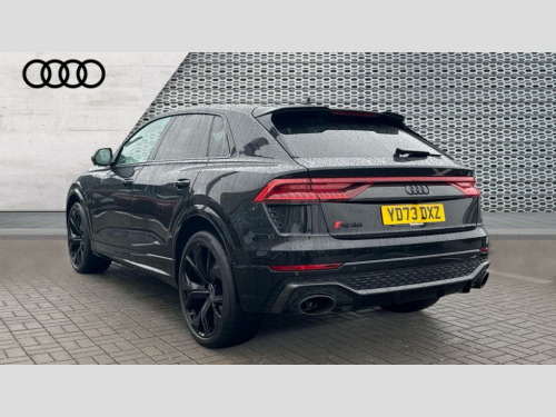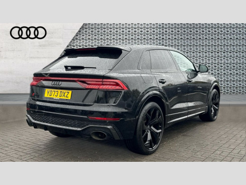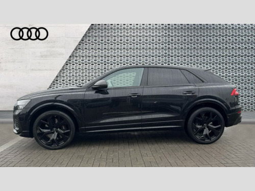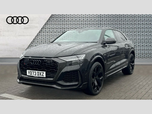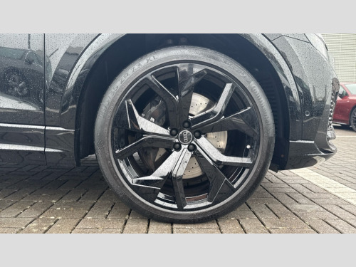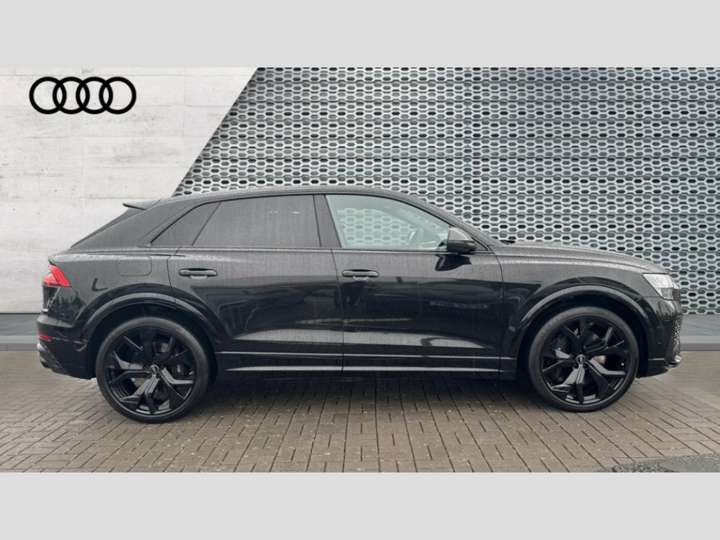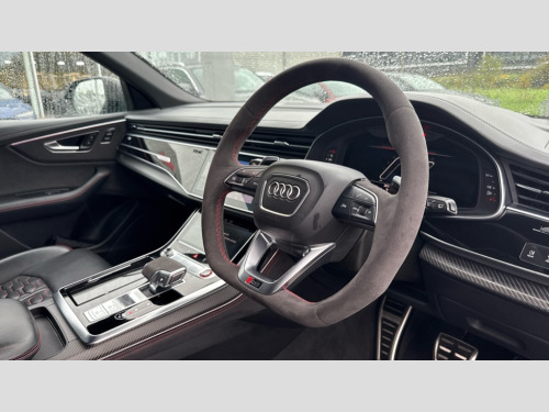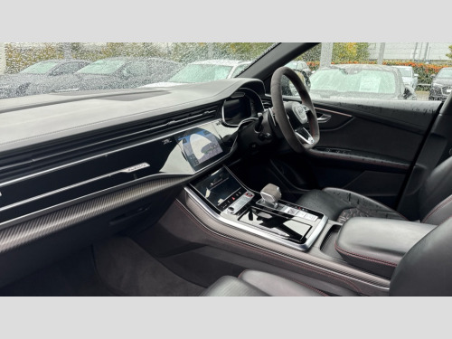 Audi Rs Q8 RS Q8 TFSI Quattro Carbon Black 5dr Tiptronic 10.1" and 8.6" Dual colour touchscreens, All wheel steering, Audi connect safety and service (e-call), Audi connect with Amazon Alexa Integration, Audi parking system plus includes 360 degree display with front and rear sensors, Audi virtual cockpit - 12.3" high resolution LCD display with fully customisable instrument cluster and RS specific menus and options, Automatic start/stop system, Bluetooth interface, Electro-mechanical PAS, MMI navigation plus with MMI touch, Natural voice recognition, On board computer, Operating buttons in black, glass look with haptic feedback, Power operated tailgate, Rear view camera, RS Audi drive select, Service interval indicator, Smartphone interface includes wireless Apple carplay/Android Auto, 48V Mild hybrid technology, Electromechanical active roll stabilisation, Quattro all wheel drive with sport differential, RS specific Adaptive air suspension, Audi music interface in rear - 2 USB ports with charger and data functions in rear, Audi sound system with 6 channel amplifier, 180 watt amplifying capacity and 10 loudspeakers including subwoofer, Aux-in socket, DAB Digital radio, Audi Beam uses LEDs to project the Audi logo, Audi HD Matrix LED headlights in RS specific design with dynamic front and rear indicators, Auto dimming frameless rear view mirror, Carbon exterior door mirrors, Electric front+rear windows, Electrically folding auto dimming/adjustable/heated door mirrors with memory function, LED side indicators and kerb view function for passenger side, Gloss black finish for exterior Audi rings and RS Q8 logo, Headlight washers, Heat insulating glass in windshield, Illuminated door sill trims with RS logo, LED 3rd brake light, LED signature daytime running lights, Privacy glass - dark tinted rear and rear side windows from B-pillar backwards, Rain and light sensors, Rear side wing doors, Rear wiper, RS badges on front wings, RS coming/leaving home animations in front and rear, RS manhattan grey front spoiler lip and rear diffuser insert, RS manhattan grey grille surround with honeycomb grille insert in black, RS specific bumpers in full body colour paint finish, RS sport exhaust system with black exhaust tips, 3 bench rear seats in 2nd row, 4 zone automatic climate control, 4-way lumbar support for front seats, 40:20:40 split folding rear bench seat, Black cloth headlining, Comfort front centre armrest, Double sun visor with illuminated vanity mirror on driver and passenger side extendable, Driver and front passenger seat memory function for electrically adjustable front seats, Electric adjustable steering column with memory functionality, Electric sunblind for the rear side windows and manual sunblind for the rear window, Front head restraints, Front seat ventilation operated through MMI system, Heated front seats, ISOFIX child seat mounting for front passenger seat and 2 outer rear seats with top tether child seat mounting for all 3 rear seats, Luggage compartment sill protection in stainless steel, Perforated Valcona leather upholstery + RS front super sports seats + honeycomb pattern with RS embossed logo, Rear headrests, Rear seat bench plus, Single front passenger seat, Stainless steel pedals, Air quality package - RS Q8, Carbon styling pack - RS Q8, Multi-coloured extended LED interior lighting pack - RS Q8, RS specific styling pack - RS Q8, 3 point seatbelts on all seats, Audi pre sense front, Child locks on rear doors, Driver and front passenger, front side and curtain airbags, Electromechanical parking brake, Electronic Stability Control (ESC) including ABS, ASR and EDL, Front passenger airbag deactivation, Hill descent control, Hill hold assist, Predictive pedestrian protection, Seatbelt monitoring, Tyre pressure loss indicator, Warning triangle and first aid kit, Advanced key, Anti theft alarm with tow away protection, Anti-theft wheel bolts and wheel loosening detection, Immobiliser, Matte carbon twill inlays, 23" x 10.5J 5 Y spoke rotor design Audi sport alloy wheels in gloss black, Tool kit, Tyre repair kit