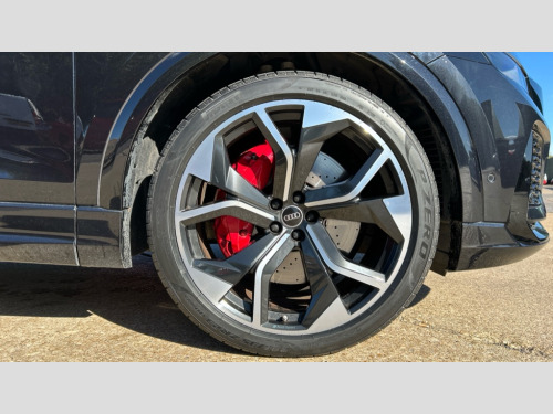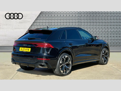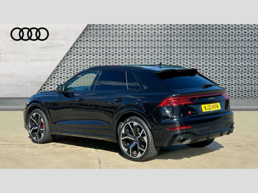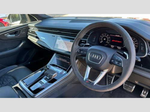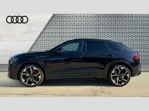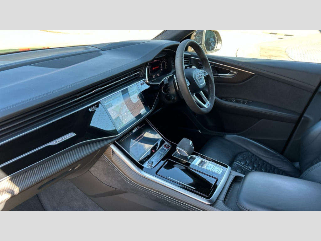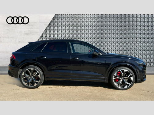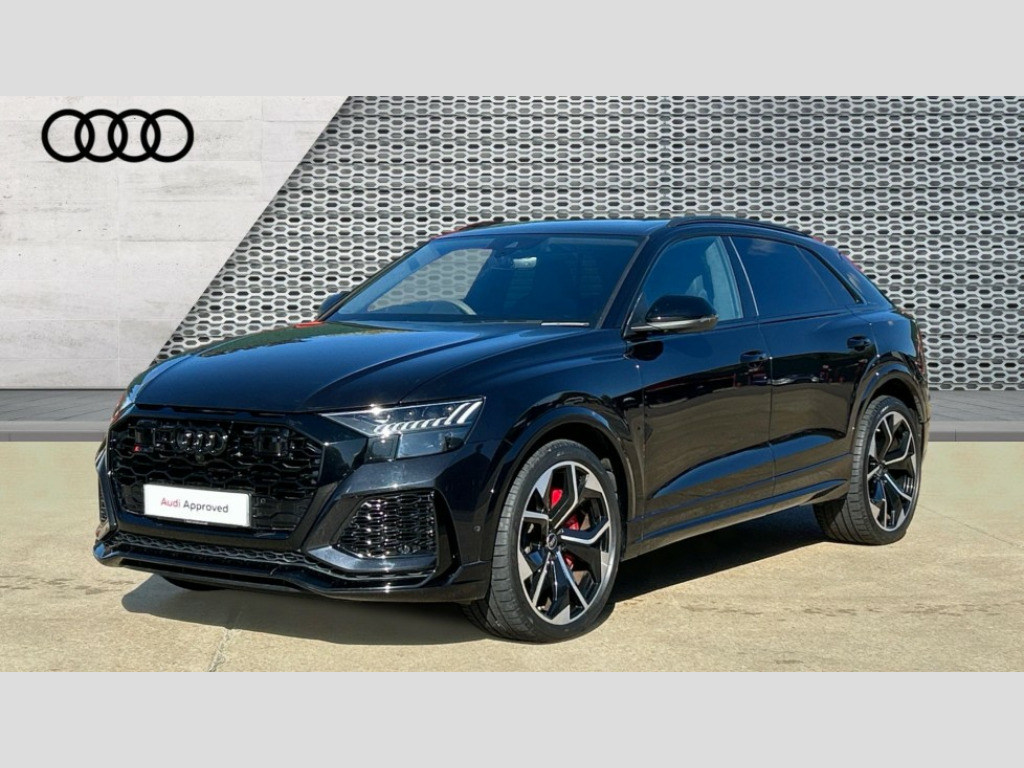 Audi Rs Q8 RS Q8 TFSI Quattro Vorsprung 5dr Tiptronic 10.1" and 8.6" Dual colour touchscreens, All wheel steering, Audi connect safety and service (e-call), Audi phone box with wireless charging, Audi smartphone interface with wireless Apple CarPlay, Audi virtual cockpit - 12.3" high resolution LCD display with fully customisable instrument cluster and RS specific menus and options, Automatic start/stop system, Electro-mechanical PAS, Head up Display, MMI navigation plus with MMI touch, Natural voice recognition, On board computer, Operating buttons in black, glass look with haptic feedback, Power door closure, Power operated tailgate, RS Audi drive select, Service interval indicator, 48V Mild hybrid technology, Electromechanical active roll stabilisation, Quattro all wheel drive with sport differential, RS specific Adaptive air suspension, Audi music interface with 2 USB ports with charge and data functions, Audi music interface with 2 USB ports with charge and data functions in the rear, Aux-in socket, DAB Digital radio, Adaptive windscreen wipers with integrated washer jets, Audi Beam uses LEDs to project Vorsprung logo, Audi HD Matrix LED headlights in RS specific design with dynamic front and rear indicators, Auto dimming frameless rear view mirror, Electric front+rear windows, Electric panoramic glass sunroof, Electrically adjustable/heated/folding/auto dimming door mirrors with integrated LED indications + kerb view function for passenger side, Gloss black finish for exterior Audi rings and RS Q8 logo, Headlight washers, Heat insulating glass in windshield, Illuminated door sill trims with RS logo, LED signature daytime running lights, Privacy glass - dark tinted rear and rear side windows from B-pillar backwards, Rain and light sensors, Rear wiper, RS badges on front wings, RS coming/leaving home animations in front and rear, RS manhattan grey front spoiler lip and rear diffuser insert, RS manhattan grey grille surround with honeycomb grille insert in black, RS specific bumpers in full body colour paint finish, RS sport exhaust system with black exhaust tips, 3 spoke heated leather multi-function RS sport steering wheel with RS mode button in alcantara with contrast grey stitching, 4 zone automatic climate control, 4-way lumbar support for front seats, 40:20:40 split folding rear bench seat, Black Alcantara headlining, Comfort front centre armrest, Double sun visor with illuminated vanity mirror on driver and passenger side extendable, Driver and front passenger seat memory function for electrically adjustable front seats, Electric adjustable steering column with memory functionality, Electric sunblind for the rear side windows and manual sunblind for the rear window, Front and rear head restraints, Heated front and outer rear seats for the second row, ISOFIX child seat mounting for front passenger seat and 2 outer rear seats with top tether child seat mounting for all 3 rear seats, Luggage compartment sill protection in stainless steel, Massage and ventilation function for front seats, Perforated Valcona leather upholstery + RS front super sports seats + honeycomb pattern with RS embossed logo, Rear seat bench plus, Stainless steel pedals, Air quality package - RS Q8, City assist pack - Q8, Comfort and sound pack - RS SQ8, Multi-coloured extended LED interior lighting pack - RS Q8, RS specific styling pack - RS Q8, Titanium black styling pack - RS Q8, Tour pack - Q8, 3 point seatbelts on all seats, Audi pre sense front, Driver and front passenger, front side and curtain airbags, Electromechanical parking brake, Electronic Stability Control (ESC) including ABS, ASR and EDL, Hill descent control, Hill hold assist, Predictive pedestrian protection, Seatbelt monitoring, Tyre pressure loss indicator, Warning triangle and first aid kit, Advanced key, Anti theft alarm with tow away protection, Anti-theft wheel bolts and wheel loosening detection, Immobiliser, 23" x 10.5J 5 Y spoke rotor design Audi sport alloy wheels in gloss anthracite black with diamond finish, Tool kit, Tyre repair kit
